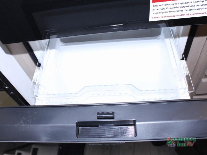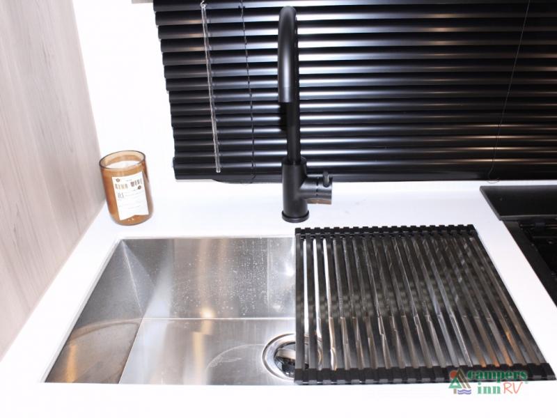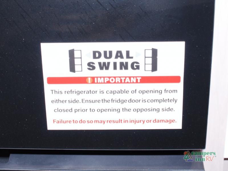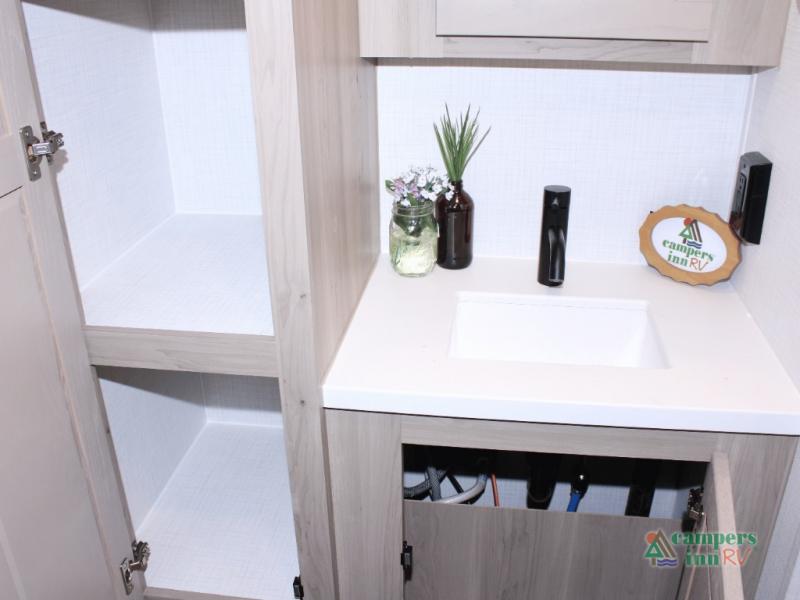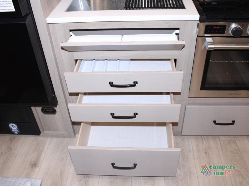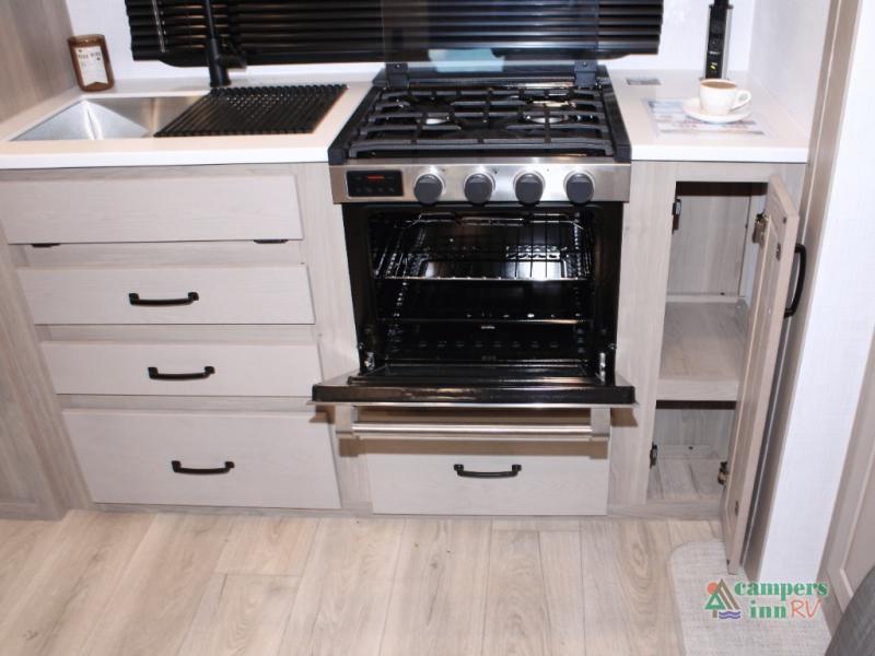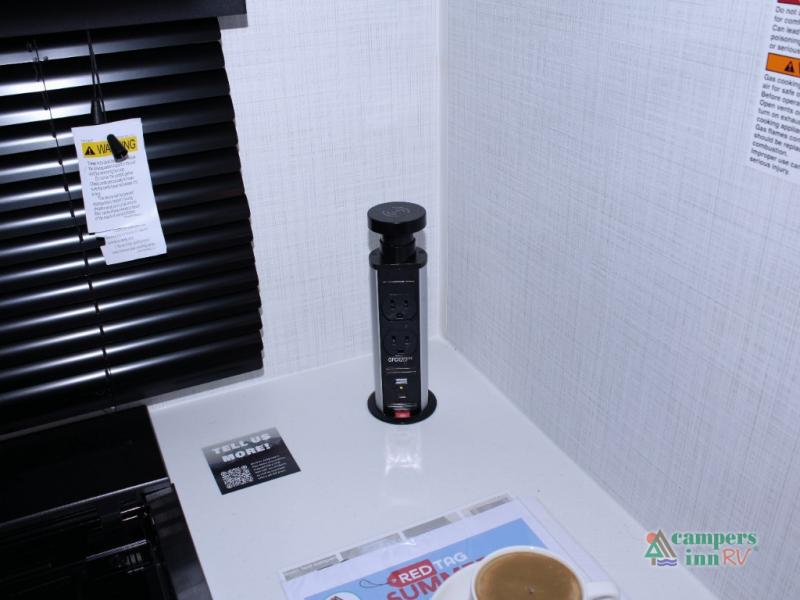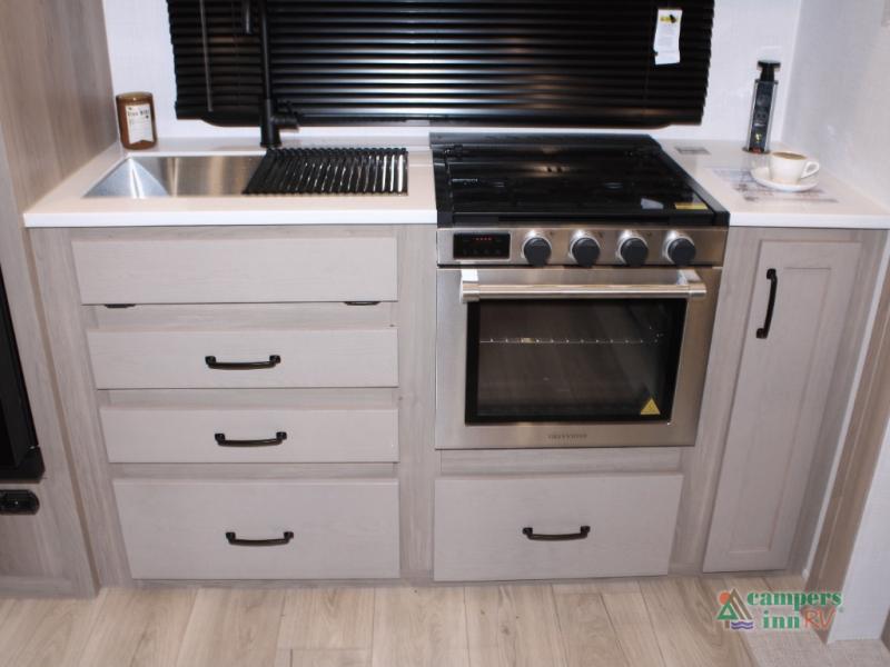 The well-appointed rear kitchen comes with a three-burner cooktop, microwave, spacious counters, and overhead storage. Want to cook breakfast while enjoying the fresh air? Fire up the outdoor griddle and enjoy morning coffee under the awning. Cooking at camp has never been this versatile or fun.