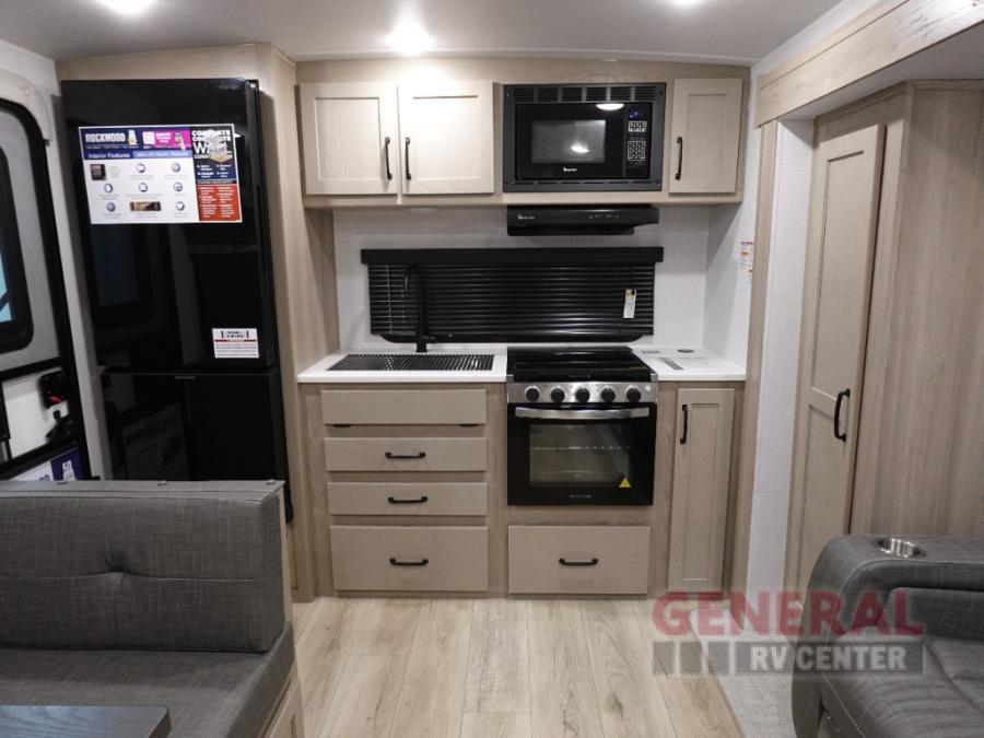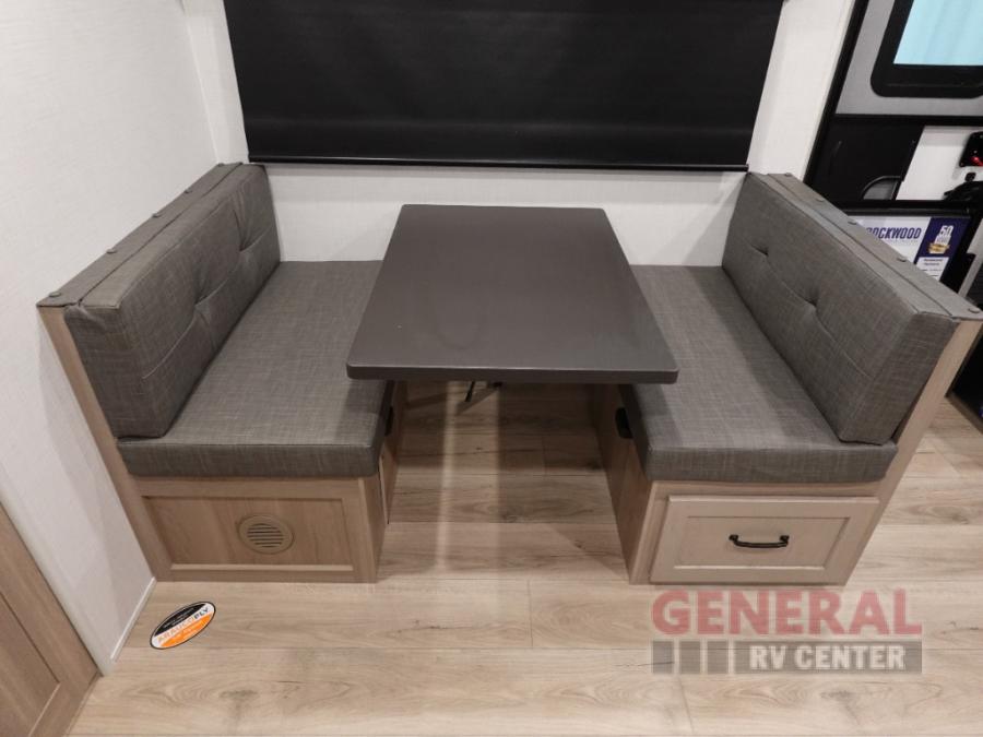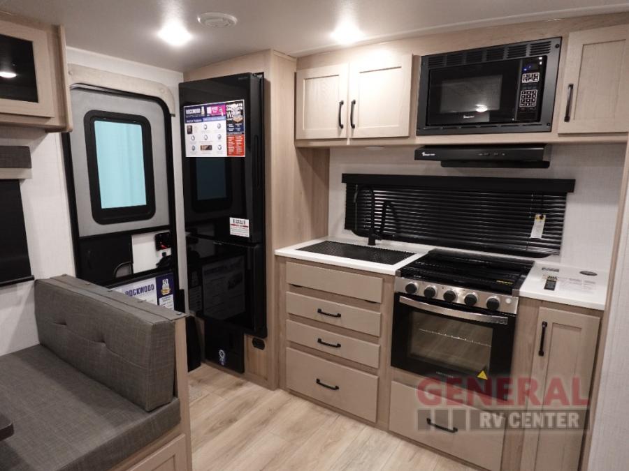 Each Rockwood Mini Lite travel trailer by Forest River is constructed with a fully laminated one-piece walkable roof, sleek frameless windows, and a six-sided full aluminum frame for strength and durability. The 12V thermostatically controlled heated tanks, plus radiant foil in the underbelly and slide out floors will allow you to camp well into the colder months, and the 200W roof solar panel will be perfect for a little off-gridding. Each model includes solid surface kitchen countertops, solid wood cabinet doors, night roller shades, plus many more interior features. Having an AIR 360+ omnidirectional antenna with WiFi prep on board gives you the option to get some work done if it's needed, and the power tongue jack provides hassle-free set up, so you can enjoy more time relaxing!