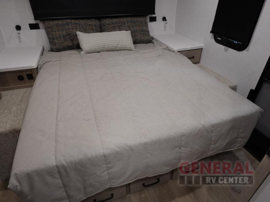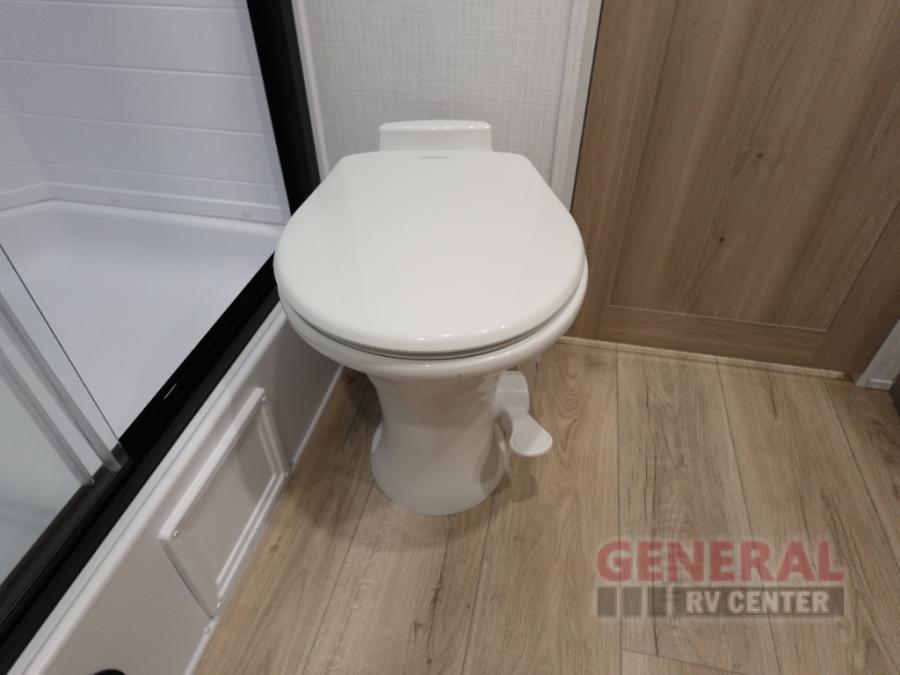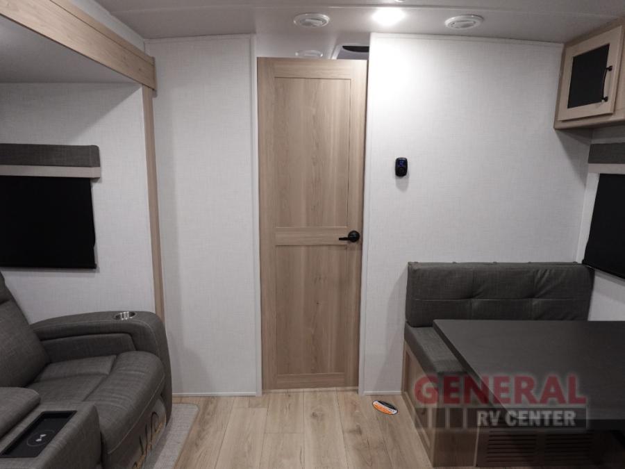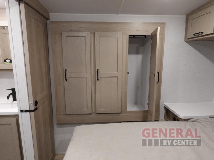 You and your spouse will have a great time camping in this travel trailer! You will have your own RV queen bed to sleep on in the front private bedroom, and an optional TV can be added if you enjoy the morning news in bed. Breakfast can be made on the three burner cooktop in the rear kitchen, or head outdoors to cook on the outside griddle. The 67" theater seating with cupholders will provide a place to relax and dine together, and the spacious walk-through bath will allow you to clean up before you head out for the day. This model includes plenty of storage space, including a pantry for your snacks, a wardrobe slide out in the bedroom, plus a drop-frame pass-through storage for larger camp gear!