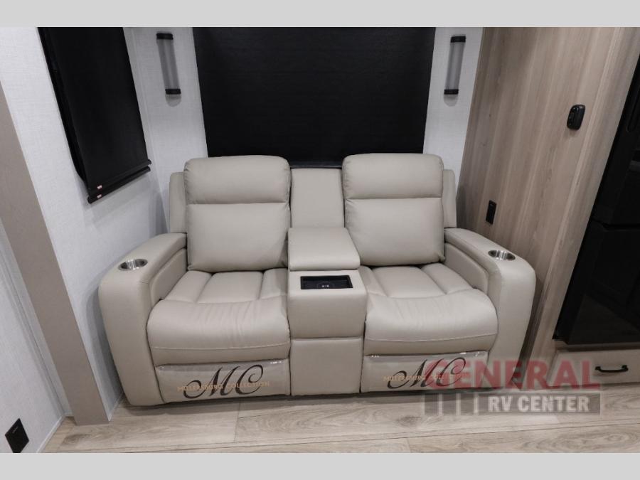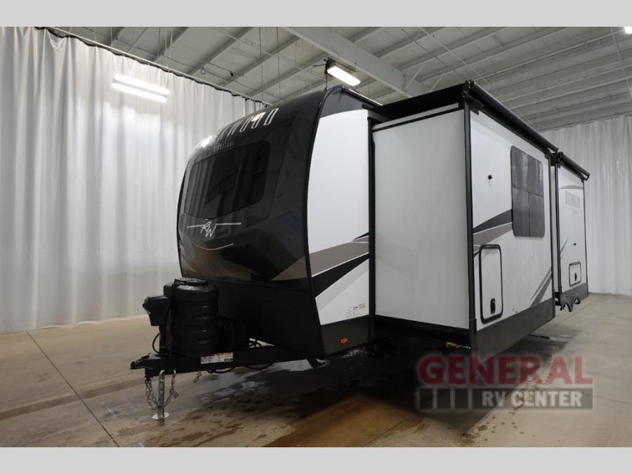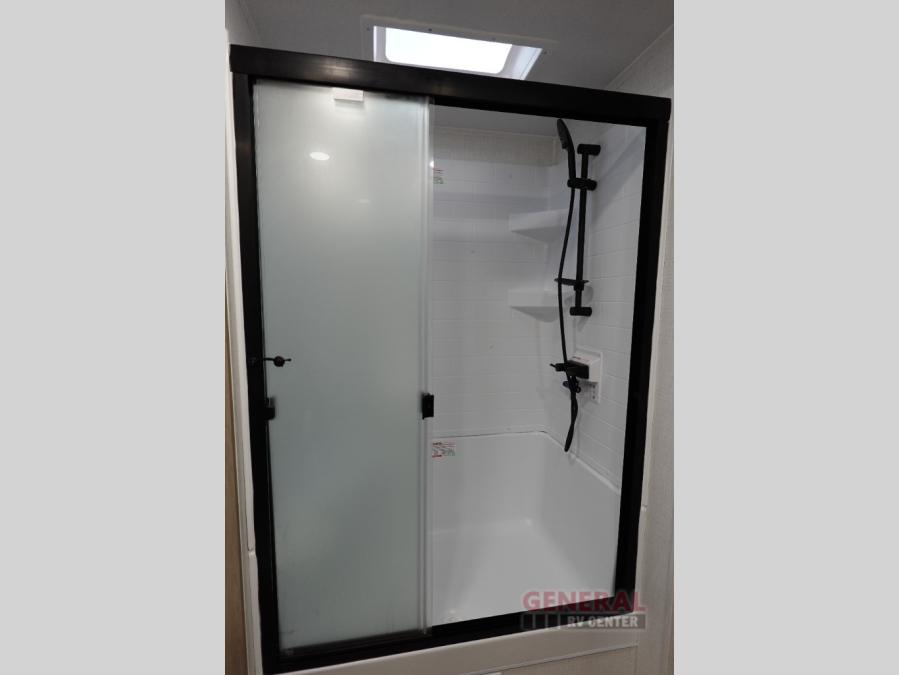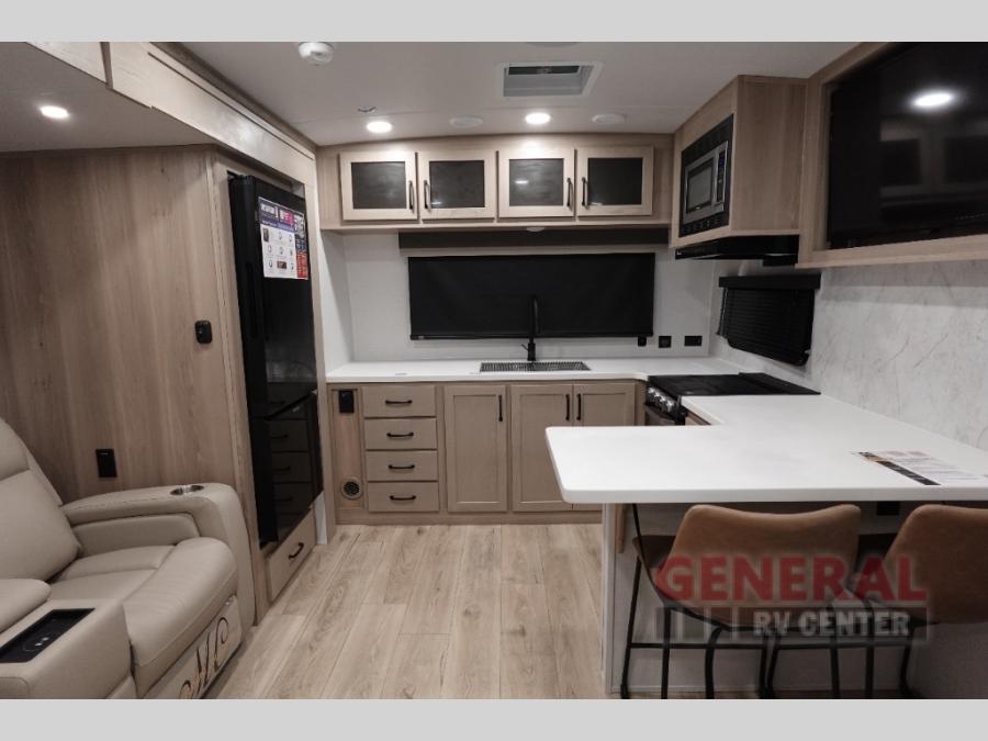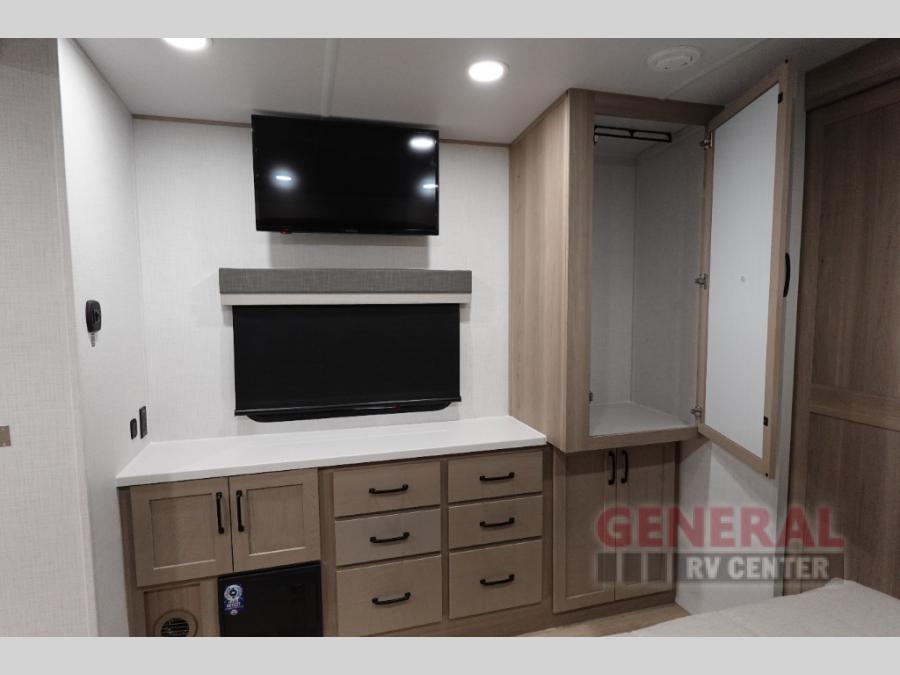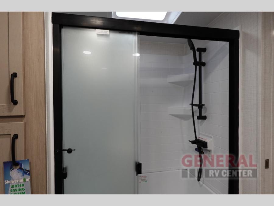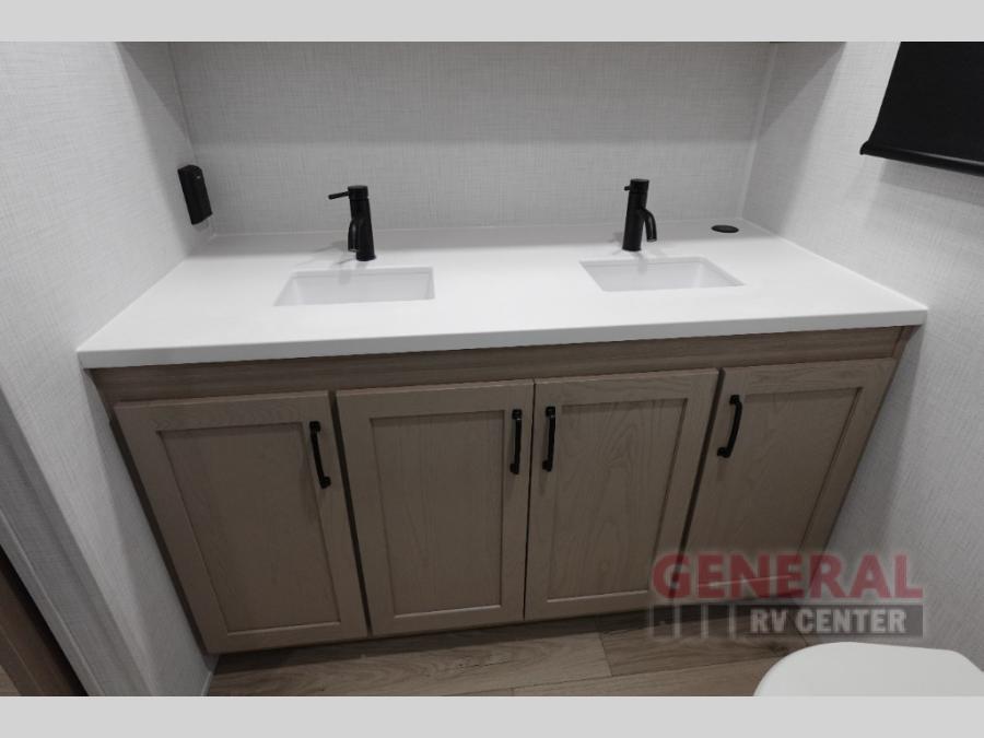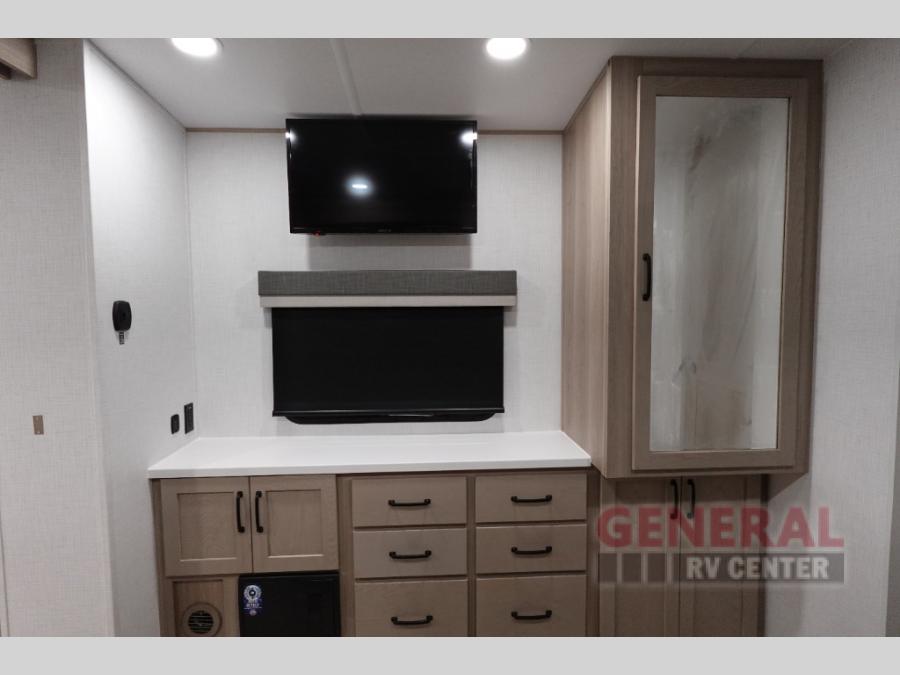 This front kitchen, couple's trailer is ready for adventure when you are! Once you arrive at your destination, prepare a quick lunch on the outside griddle, and enjoy the shade provided by the 19' power awning. You can eat outside, or inside at the counter with stools. The theatre seat will make this travel trailer feel more like home, and the double slides provide more space to stretch out. Within the master bedroom you'll find a king bed, a large wardrobe and a dresser. And check out the full rear bath with dual bath sinks and a shower with a seat! Now, that's what I call comfort!