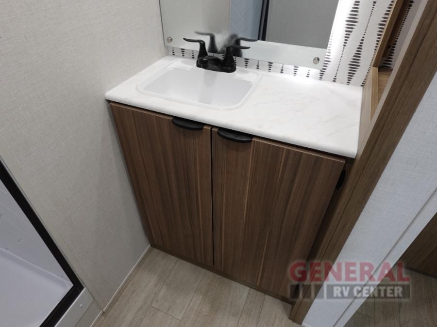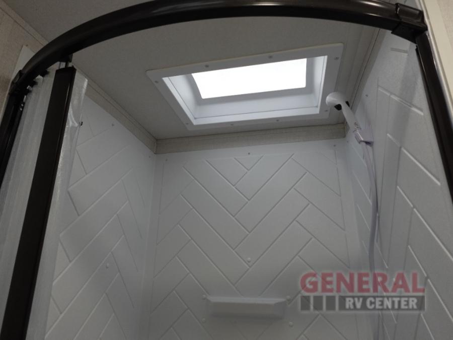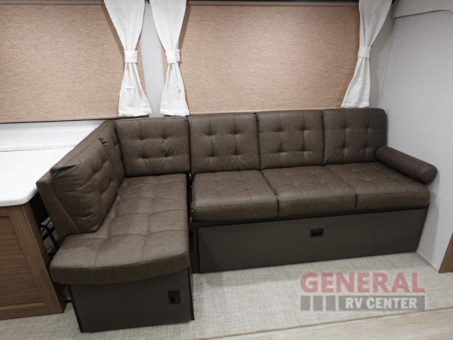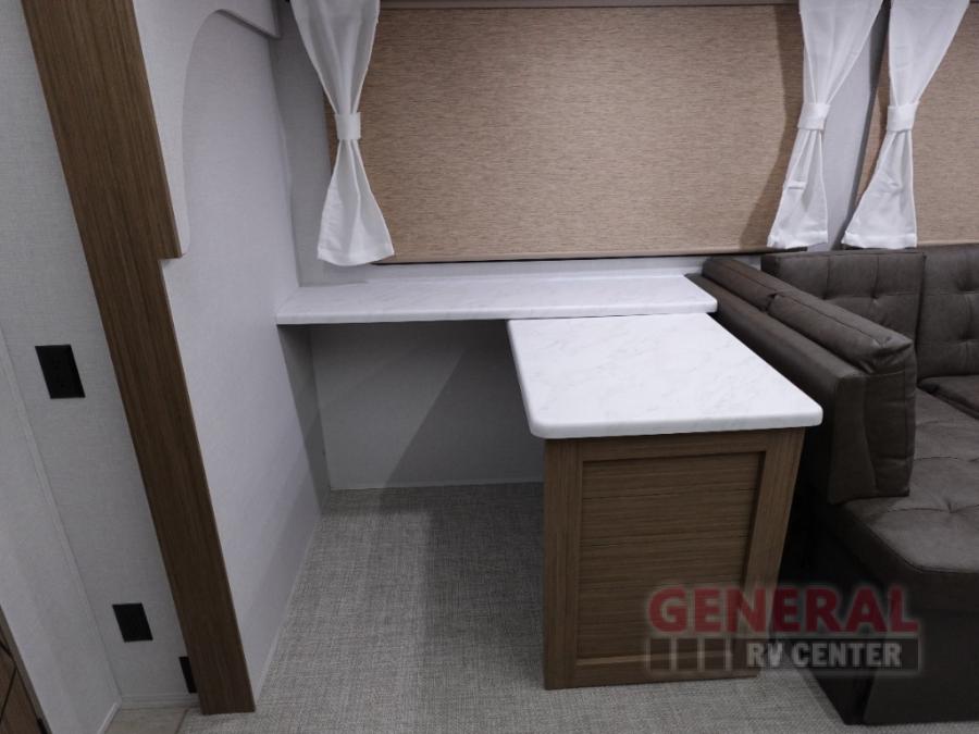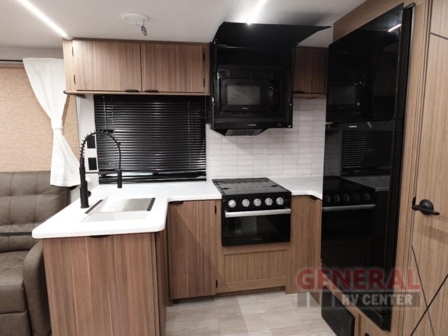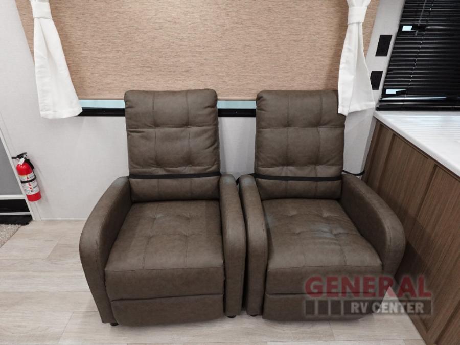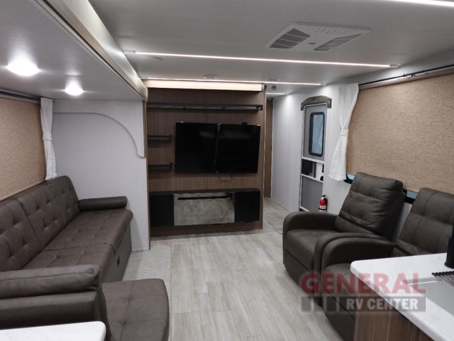With a spacious kitchen and panoramic windows, this travel trailer is sure to stand out! The L-shaped sofa, dual lounge chairs, and Versa Flex table give you many seating options. You can either cook a delicious meal in the rear kitchen or you can use the exterior camp kitchen to breathe in some fresh air while you cook. After a fun-filled day, you can rinse off in the walk-in shower then head to the front private bedroom, grab your pajamas from the closet, and lay down on the custom king bed with Versa Tilt for a good night's rest!