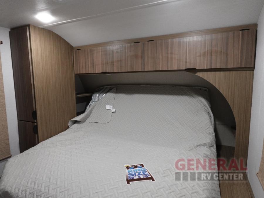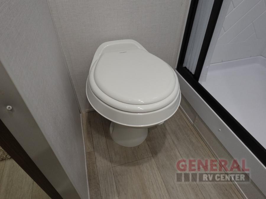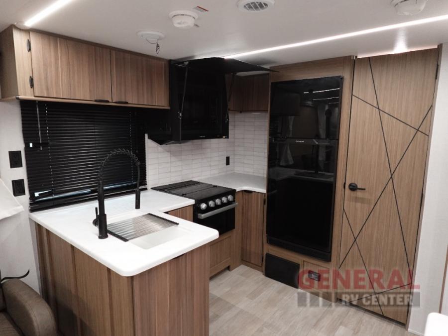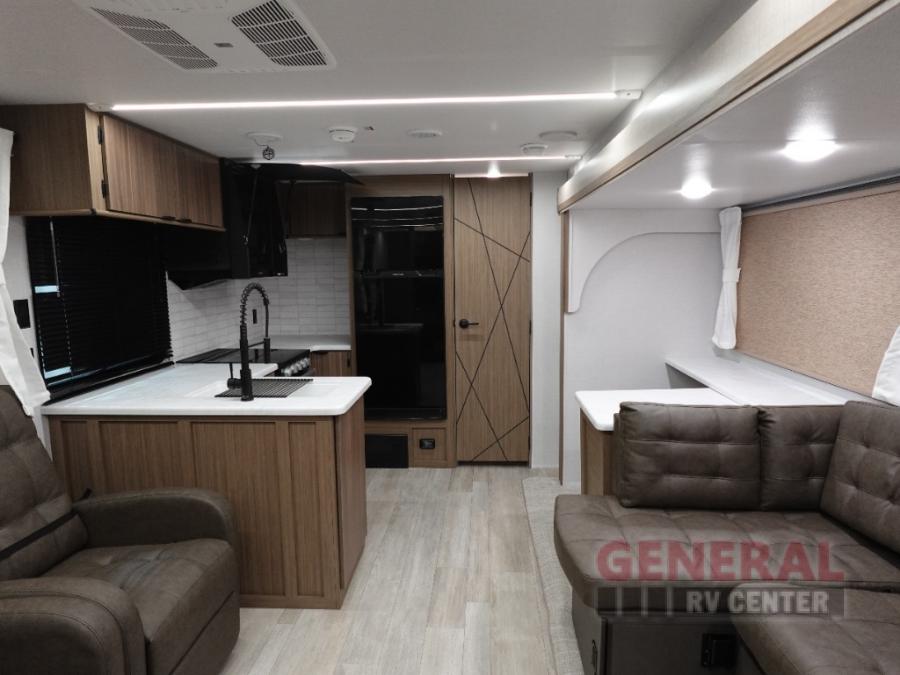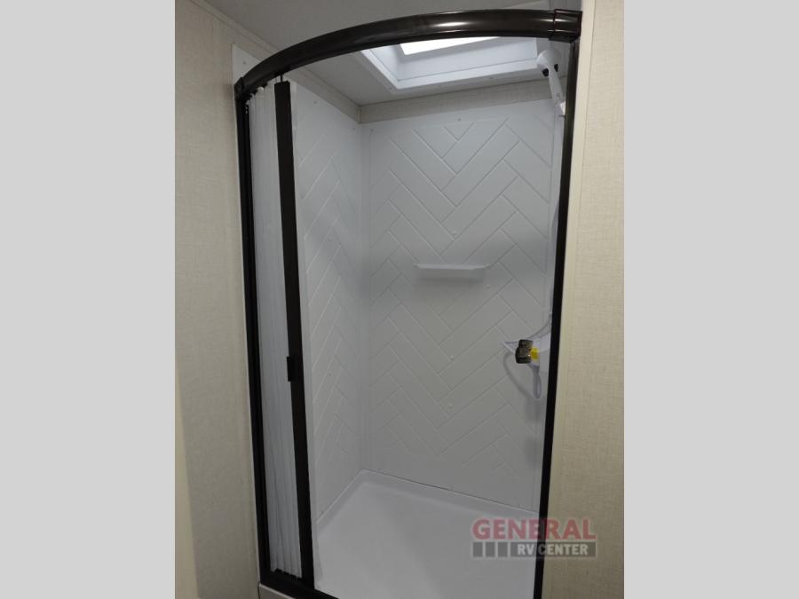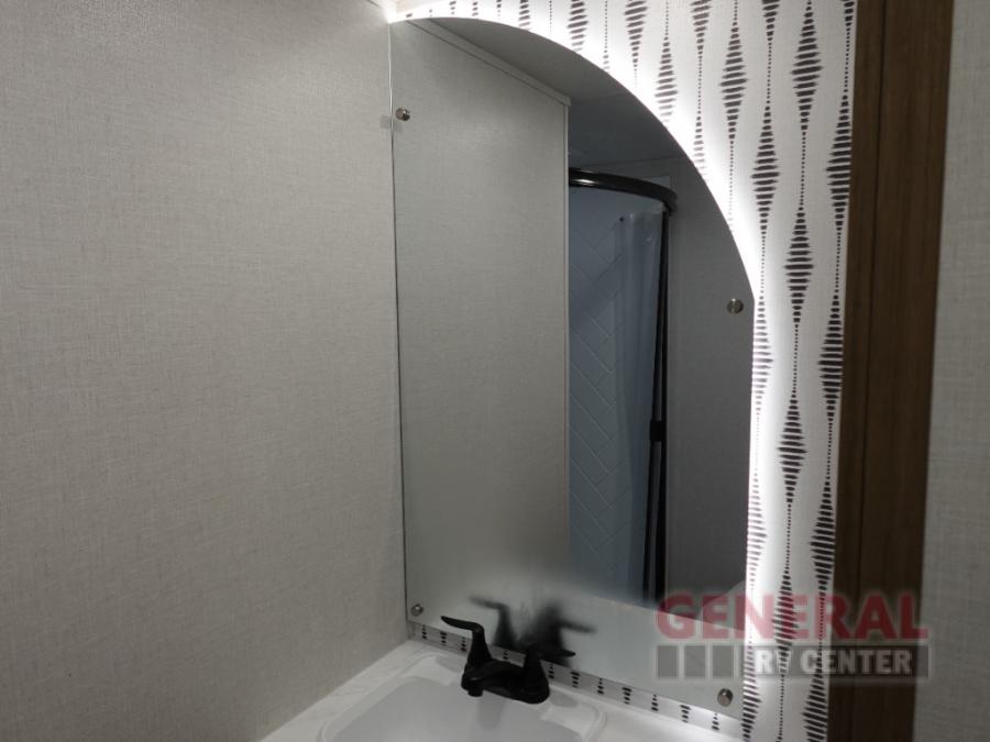 With a spacious kitchen and panoramic windows, this travel trailer is sure to stand out! The L-shaped sofa, dual lounge chairs, and Versa Flex table give you many seating options. You can either cook a delicious meal in the rear kitchen or you can use the exterior camp kitchen to breathe in some fresh air while you cook. After a fun-filled day, you can rinse off in the walk-in shower then head to the front private bedroom, grab your pajamas from the closet, and lay down on the custom king bed with Versa Tilt for a good night's rest!