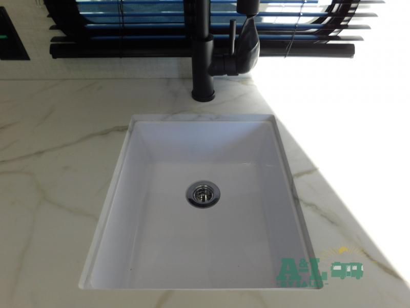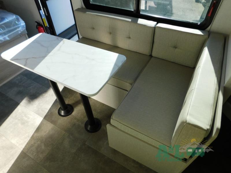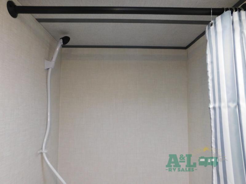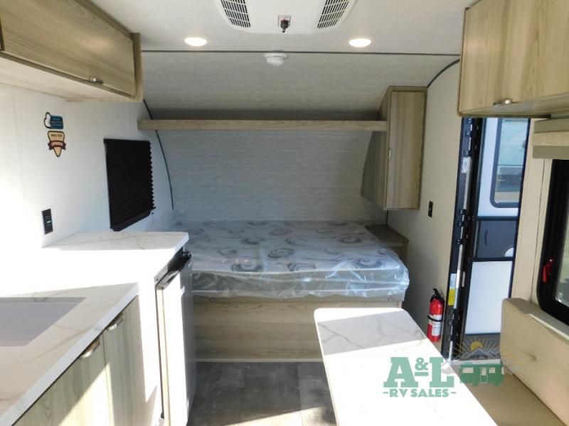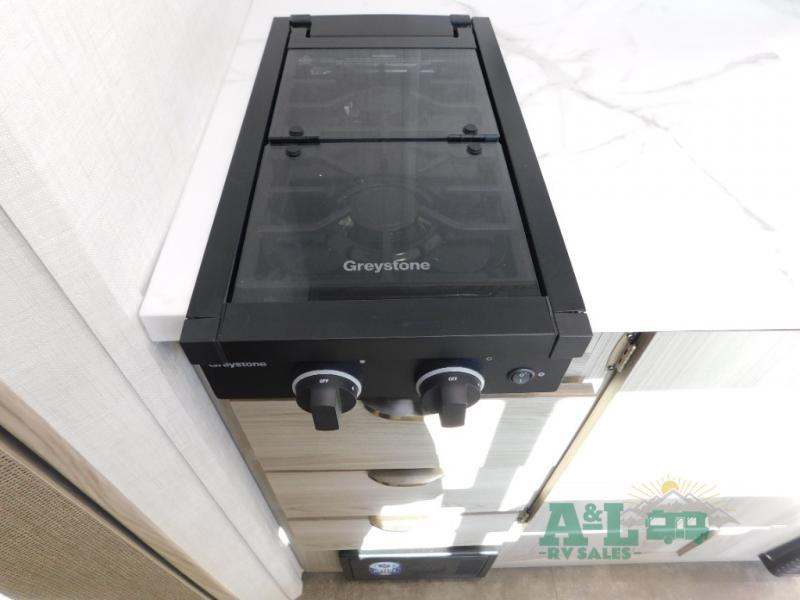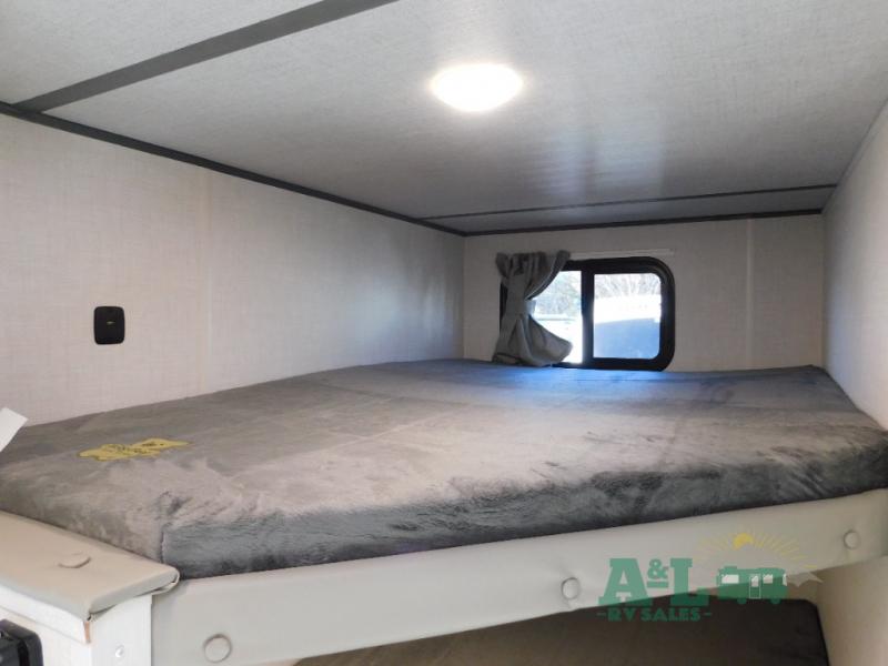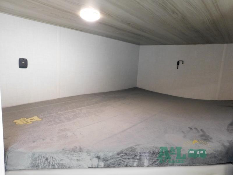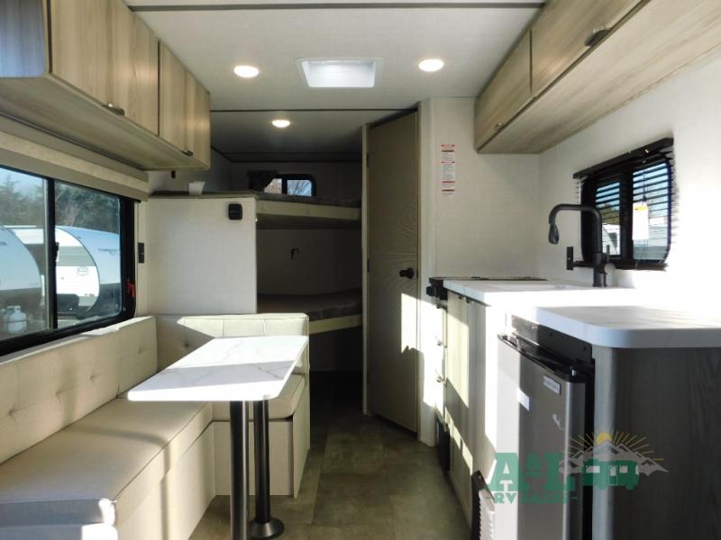 The double-size bunks with storage will be a big selling point in this travel trailer! While your guests take the bunks, you can have the front queen bed all to yourselves, and there is a wardrobe to keep your things organized. A two burner cooktop and microwave will let you make meals each day, and you can dine at the open lounge with a table.