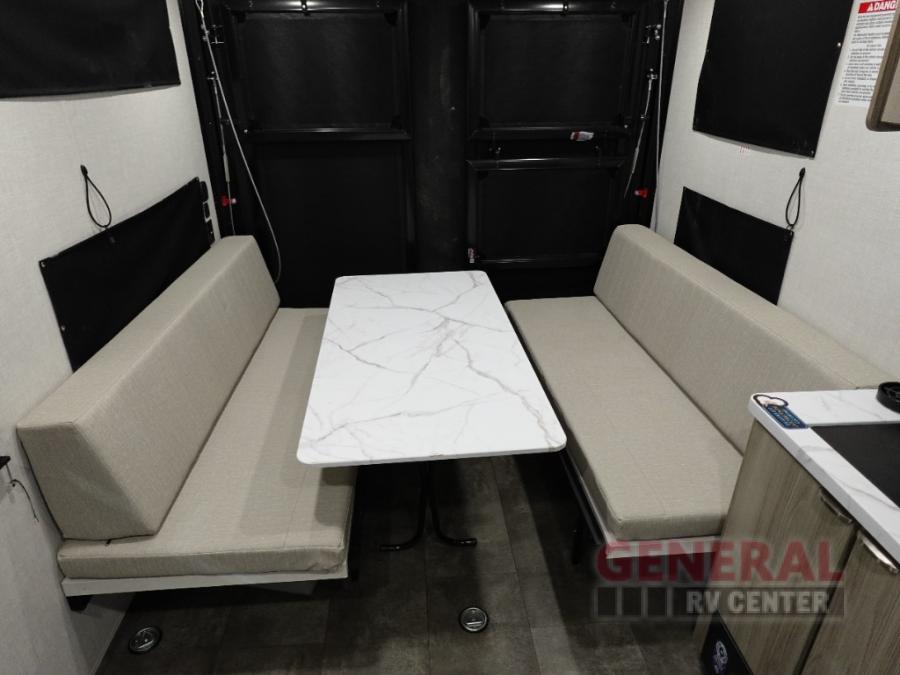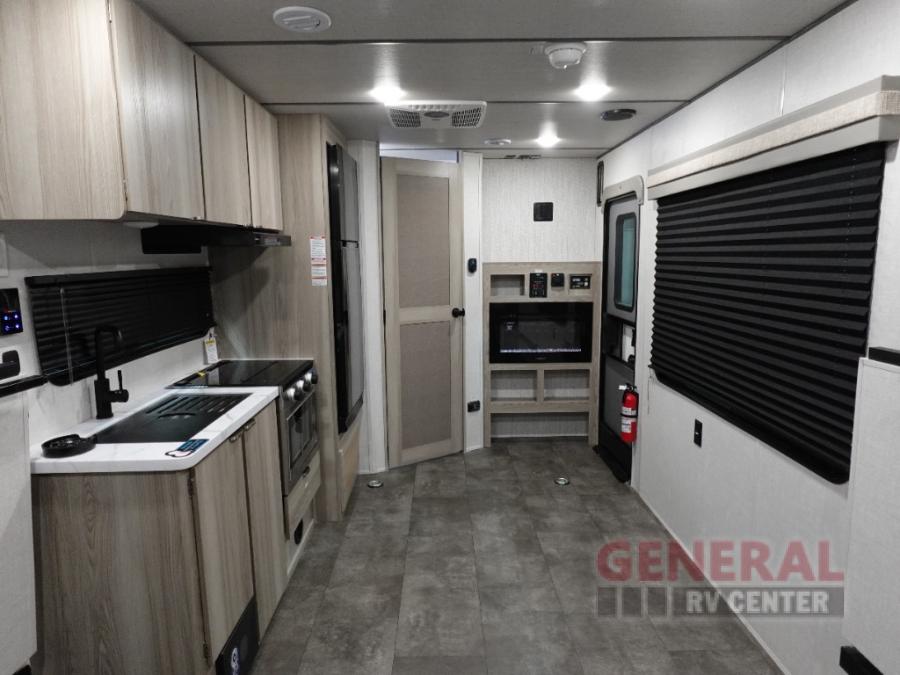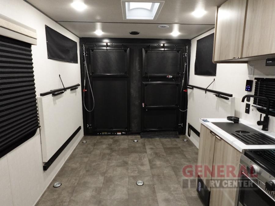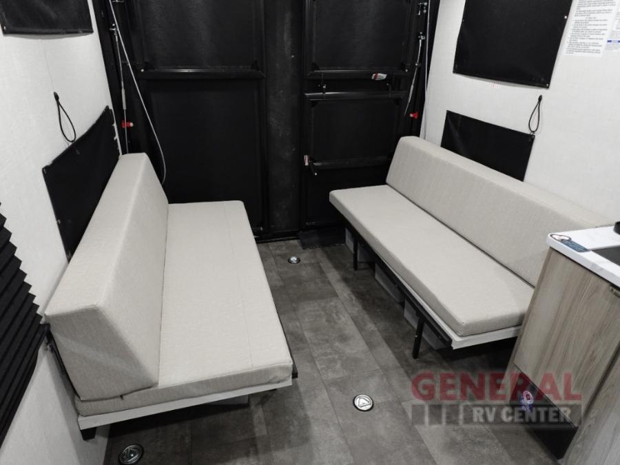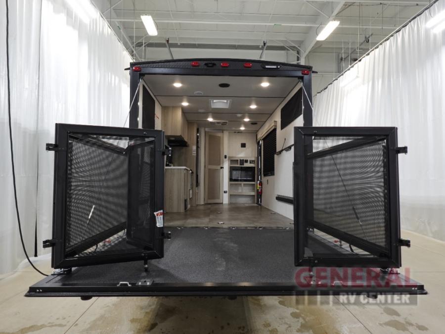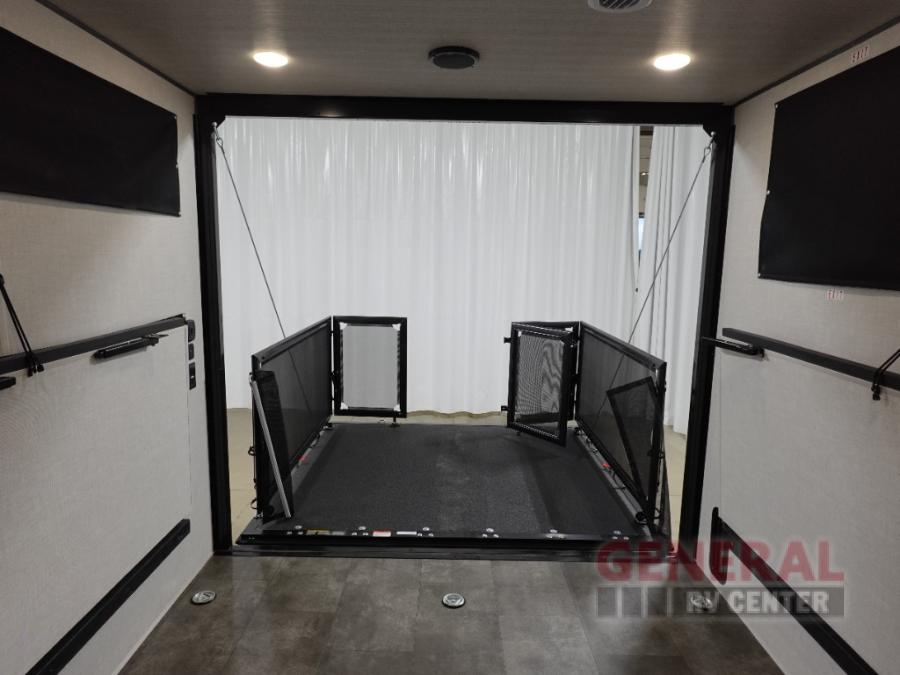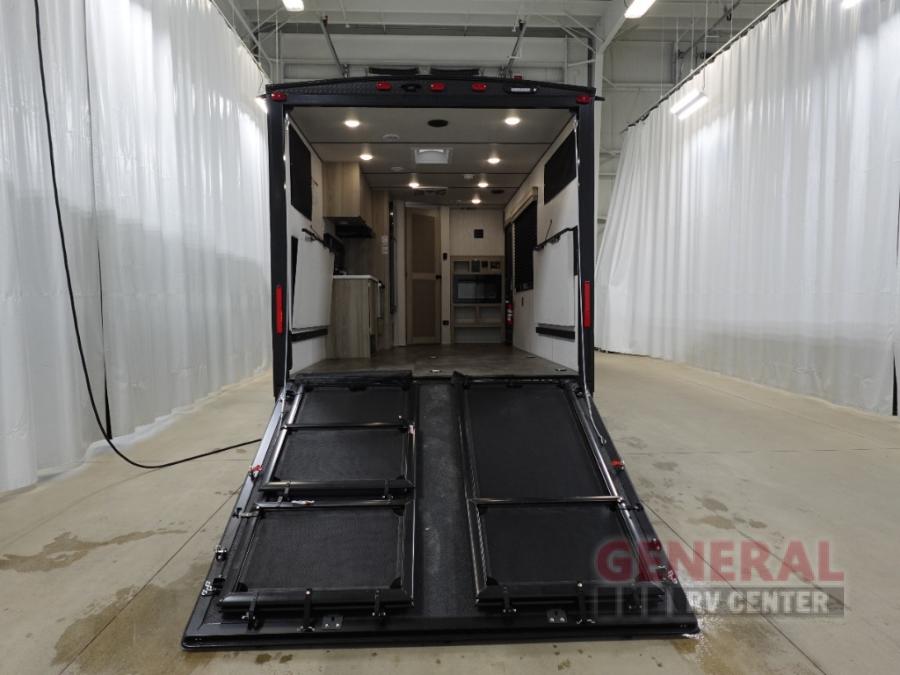 You will feel right at home in this toy hauler! The front private bedroom has a queen bed to lay your head on at night with wardrobes on either side of it for your clothes. You even have access to the walk-through bathroom which has a neo-angled shower. Prepare your best home cooked meals with the 3-in-1 cooker with a convection oven and three burner cooktop, enjoy them at the opposing 30" x 72" sofa sleepers with a table in between, and store any leftovers in the dual swinging 12V refrigerator. The 90" x 75", 3,000 lb. ramp door doubles as a party patio with a 1,500 lb. max weight capacity so you can invite your neighboring campers to join in on the fun!