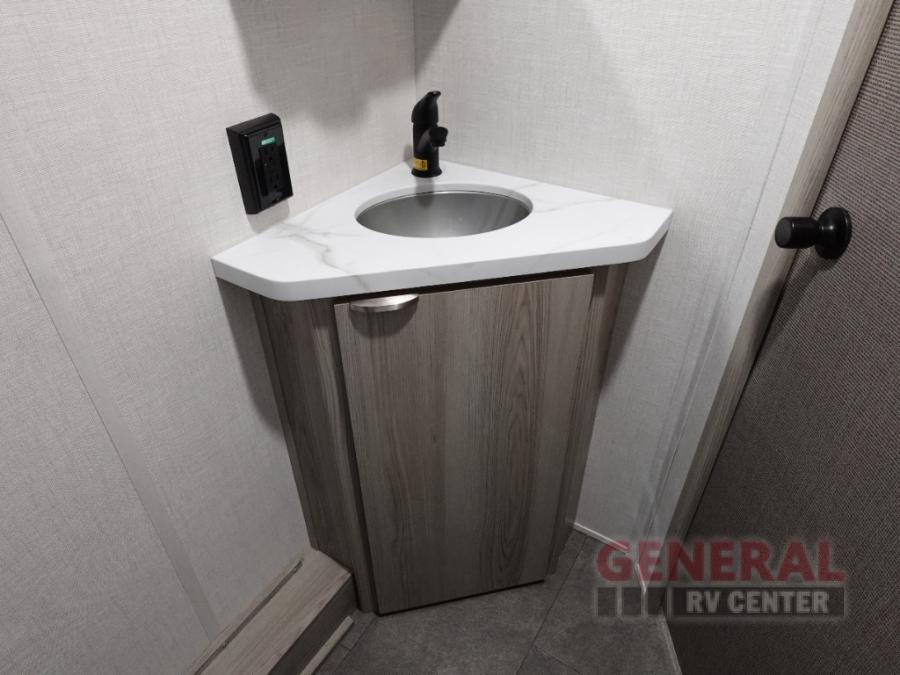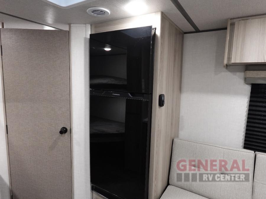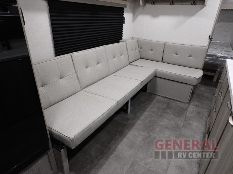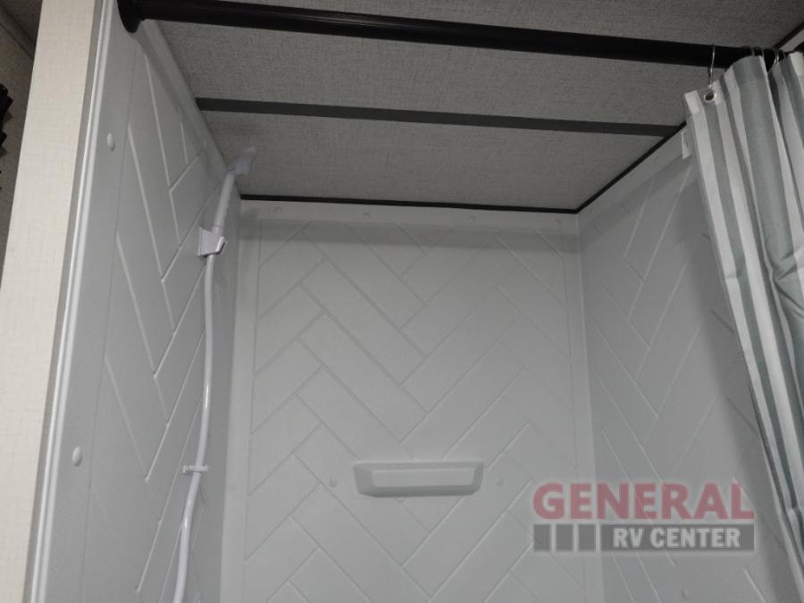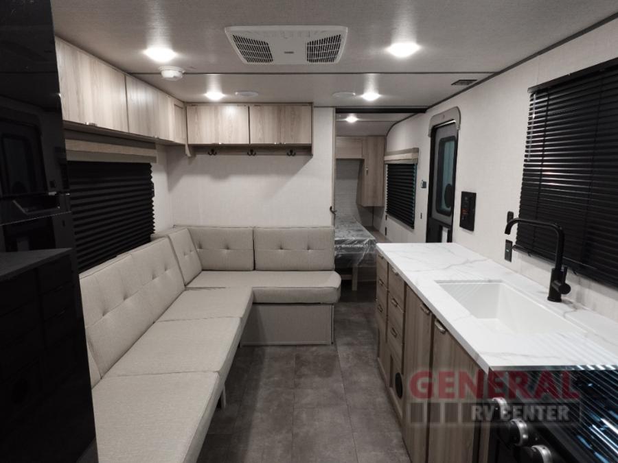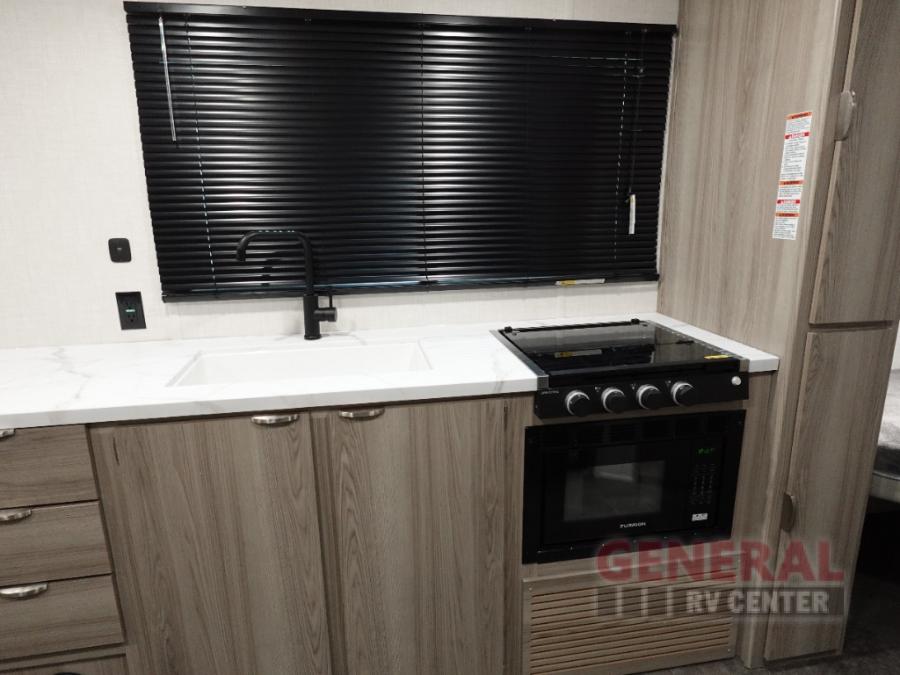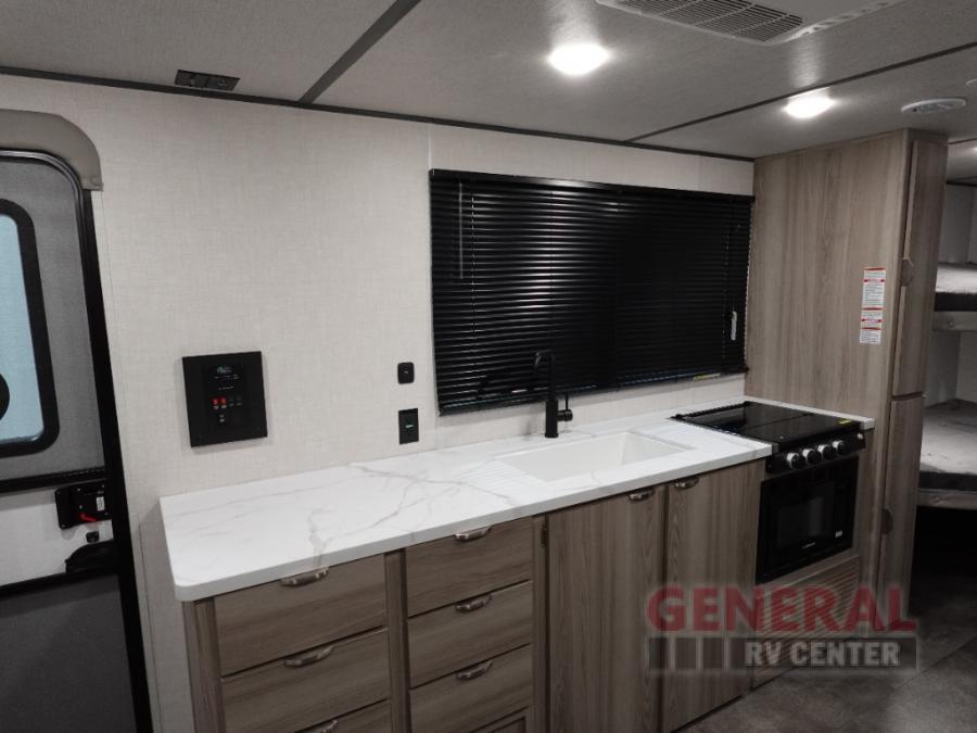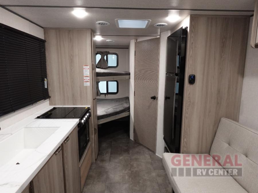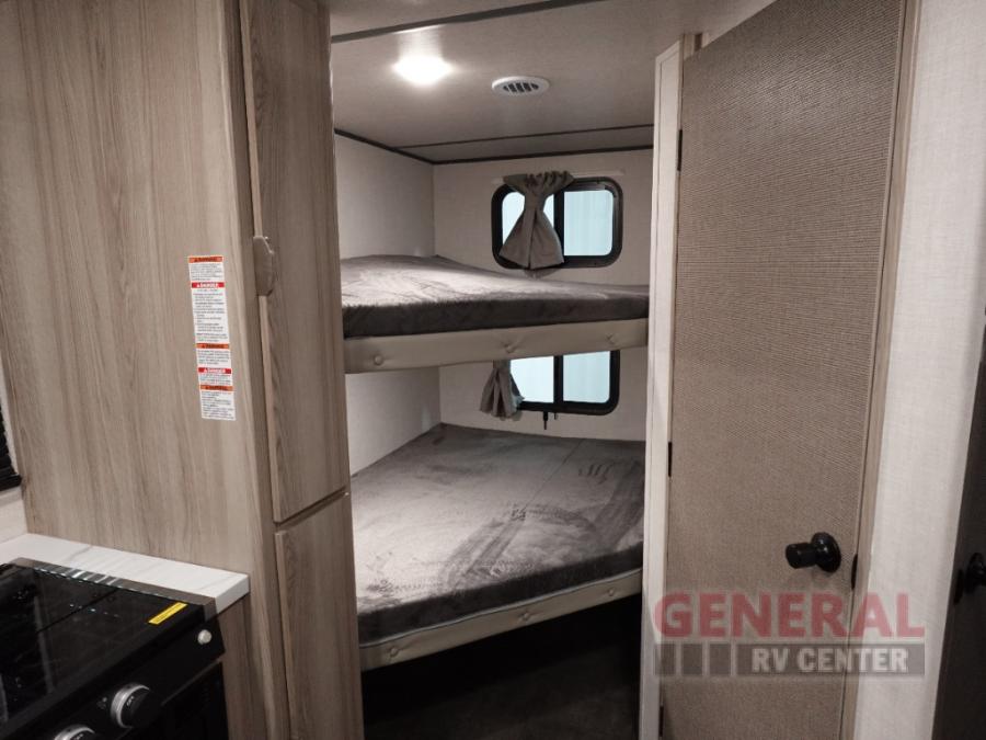 Camping is made easy in this travel trailer with more sleeping space and lots of comforts! The kids or your guests will enjoy the double-size bunks in the back, along with the full bath close by for easy nighttime use. You'll have the front private bedroom with a king bed all to yourselves, and there are dual bedroom wardrobes to keep your space neat and clean. Everyone can meet in the combined kitchen and living room to relax on the super U-lounge with a removable table while the chef of your group makes breakfast on the two burner cooktop. There is also a microwave oven for quick meals, plus a pantry and refrigerator for food storage!