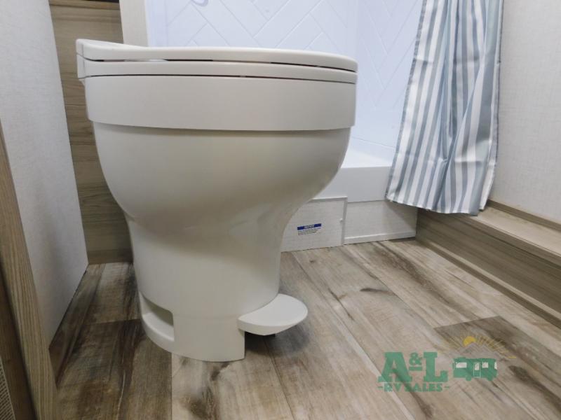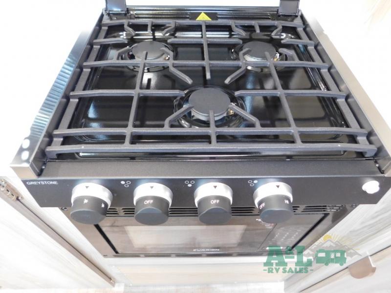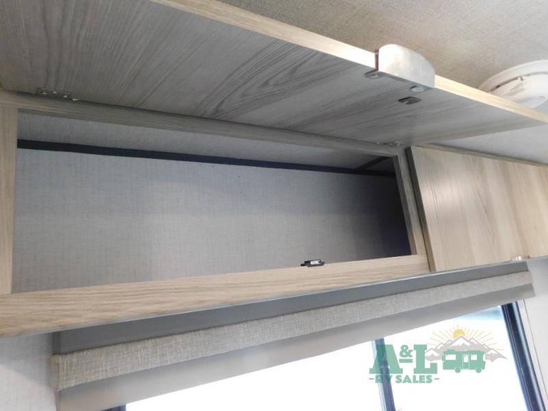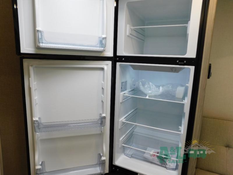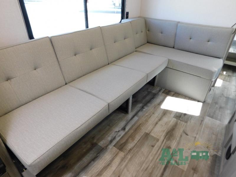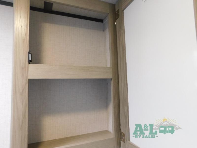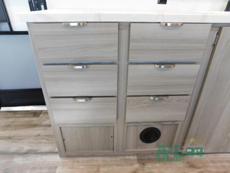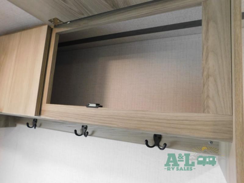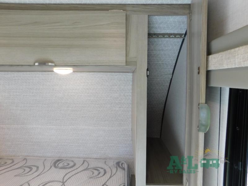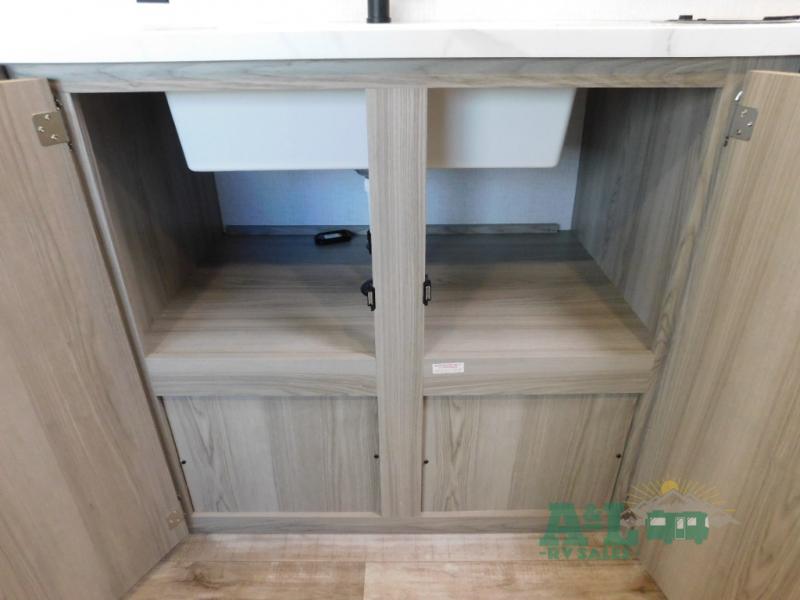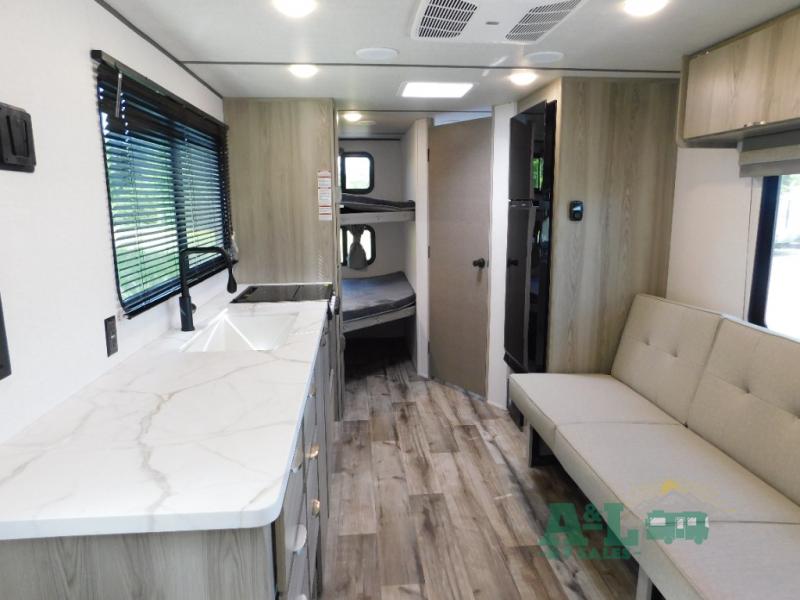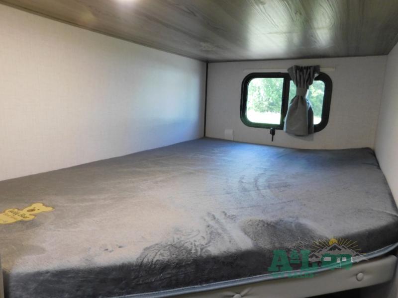 Camping is made easy in this travel trailer with more sleeping space and lots of comforts! The kids or your guests will enjoy the double-size bunks in the back, along with the full bath close by for easy nighttime use. You'll have the front private bedroom with a king bed all to yourselves, and there are dual bedroom wardrobes to keep your space neat and clean. Everyone can meet in the combined kitchen and living room to relax on the super U-lounge with a removable table while the chef of your group makes breakfast on the two burner cooktop. There is also a microwave oven for quick meals, plus a pantry and refrigerator for food storage!