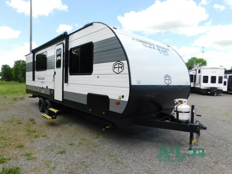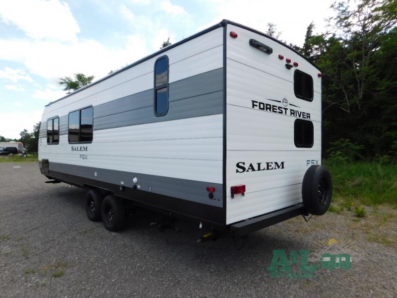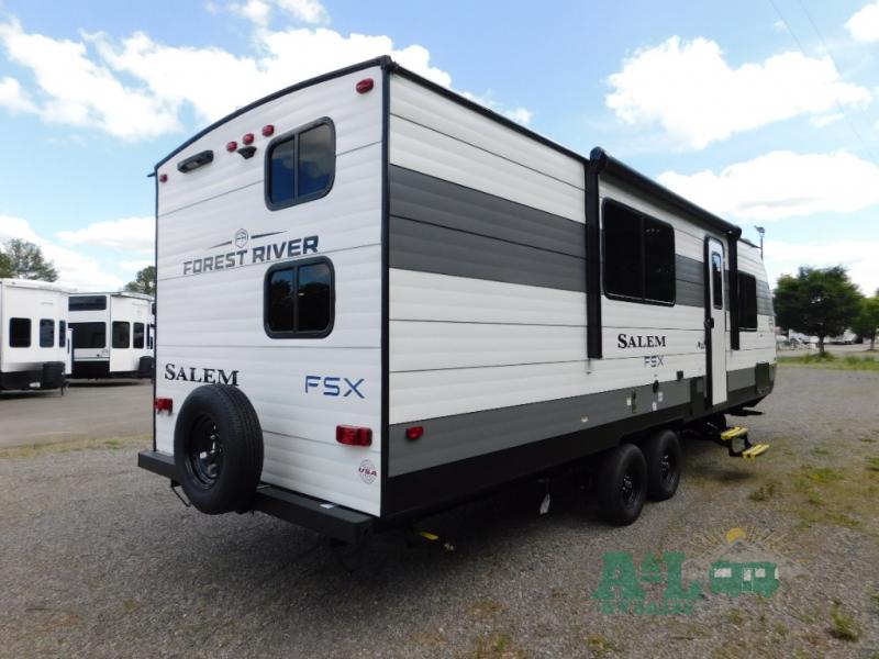 The Forest River Salem FSX travel trailers and toy hauler travel trailers are ultra comfortable and lightweight, perfect for first time or seasoned campers alike! You will love how easy it will be to relax with residential features that will make your space feel just like home, and the durable construction means you can enjoy your RV for years to come. There are a wide variety of floorplans to choose from, including couple's trailers, bunk models, and toy haulers, all with full bath and kitchen amenities and plenty of storage for all your gear!