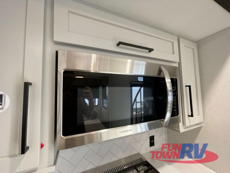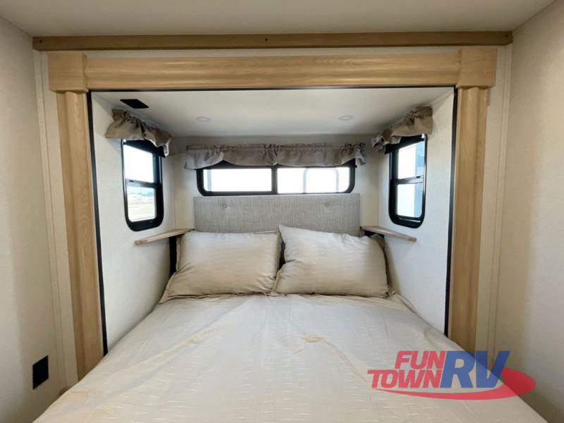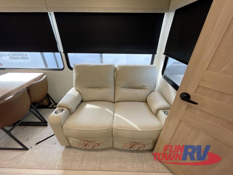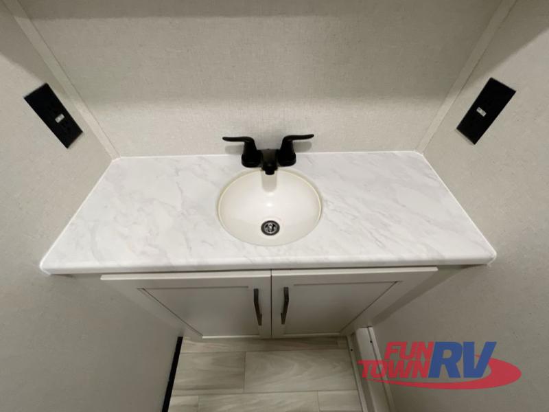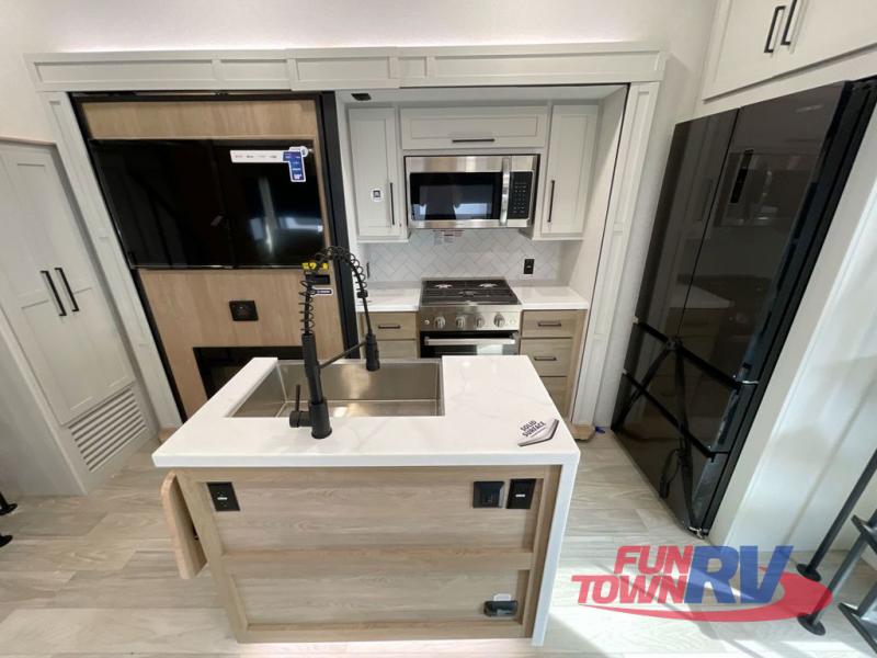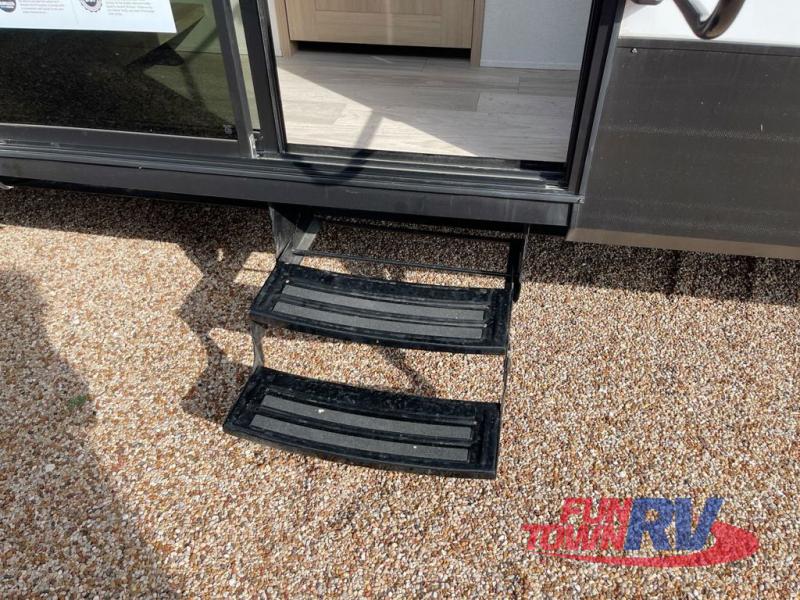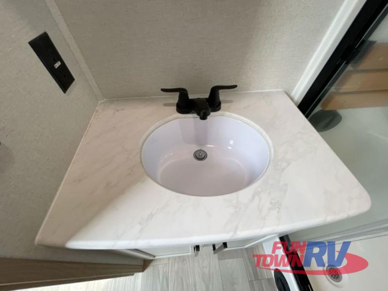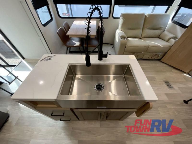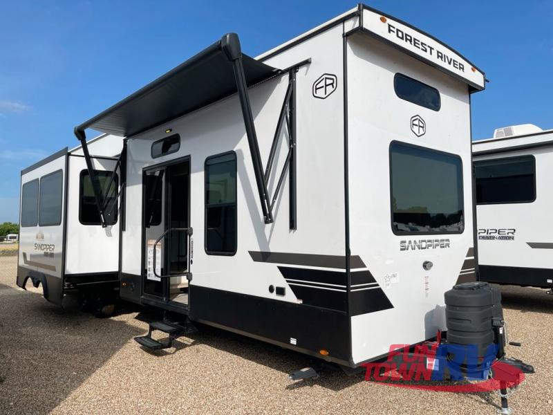 The Sandpiper Destination Trailers by Forest River are ready for extended stays at the location of your choice! The cambered powder coated frame with rust prohibitor will help extend the life of your RV and the Underbelly Armor will protect your trailer and provide better insulation. There are also color matched exterior fiberglass sidewalls outside, along with rain gutters with extra long drip spouts to prevent black streaking, and an exterior porch light just like at home. The Destination Package includes features to make your trips hassle-free, like the two 15,000 BTU A/C units, on-demand water heater, and Chef Collection three burner 24" range. A commercial style kitchen faucet and designer backsplash is included with the Extended Stay Package, as well as solid surface countertops, and a stainless steel apron sink with a strainer to name a few comforts. Available options include a central vacuum system, stabilizer jacks, plus dual pane windows and more!