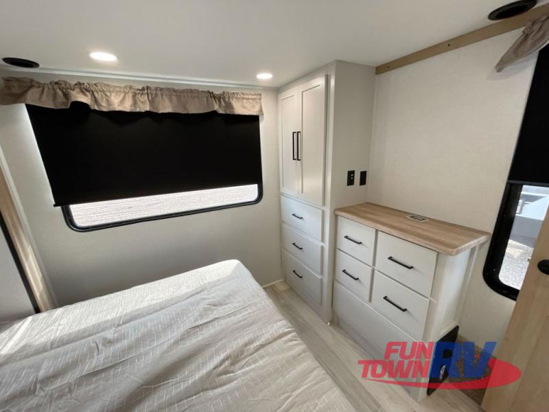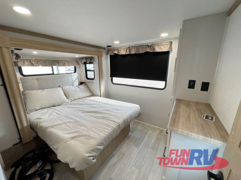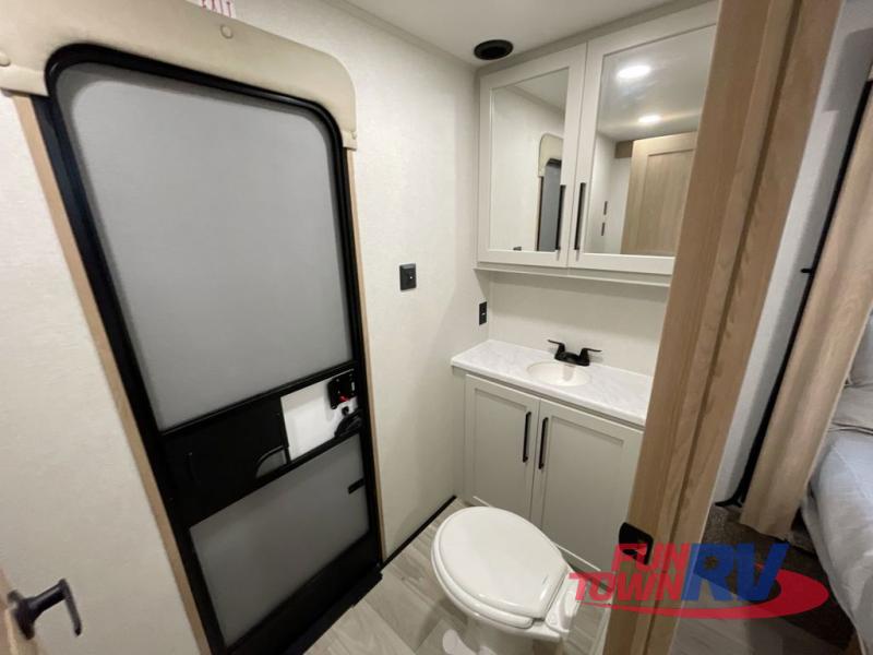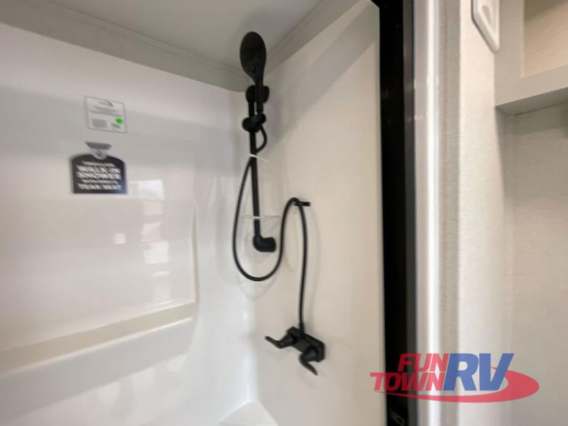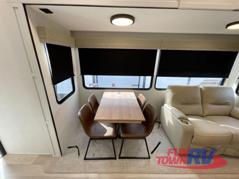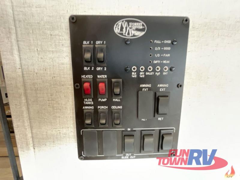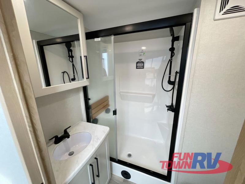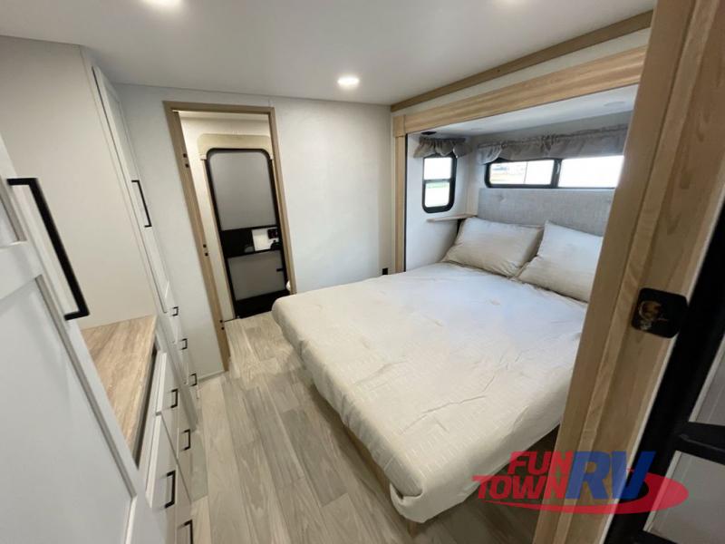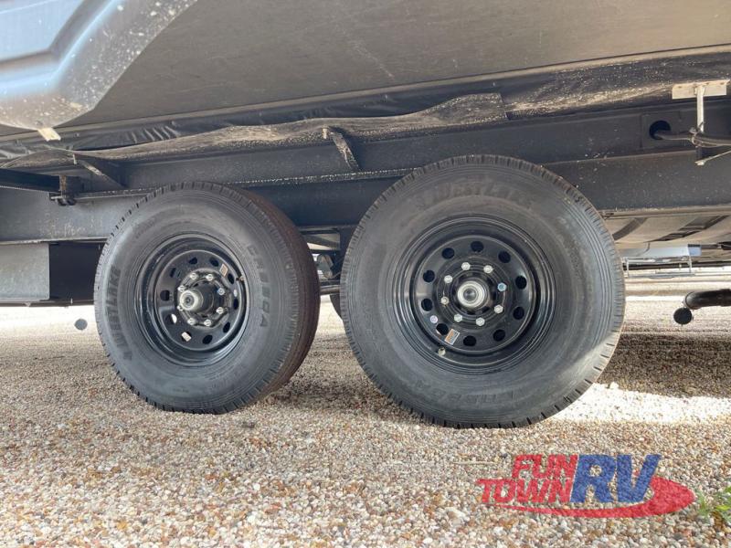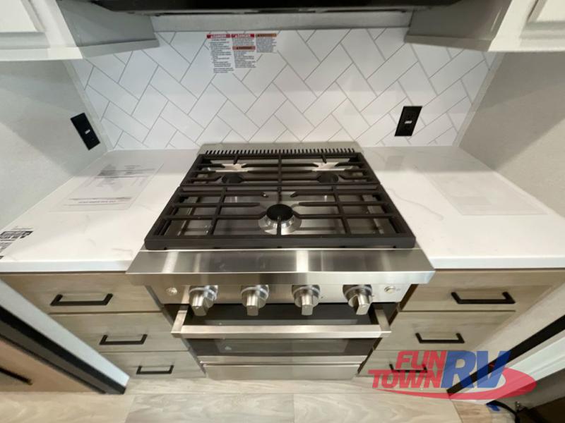The Sandpiper Destination Trailers by Forest River are ready for extended stays at the location of your choice! The cambered powder coated frame with rust prohibitor will help extend the life of your RV and the Underbelly Armor will protect your trailer and provide better insulation. There are also color matched exterior fiberglass sidewalls outside, along with rain gutters with extra long drip spouts to prevent black streaking, and an exterior porch light just like at home. The Destination Package includes features to make your trips hassle-free, like the two 15,000 BTU A/C units, on-demand water heater, and Chef Collection three burner 24" range. A commercial style kitchen faucet and designer backsplash is included with the Extended Stay Package, as well as solid surface countertops, and a stainless steel apron sink with a strainer to name a few comforts. Available options include a central vacuum system, stabilizer jacks, plus dual pane windows and more!