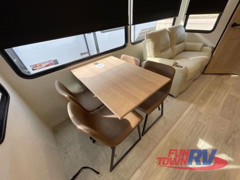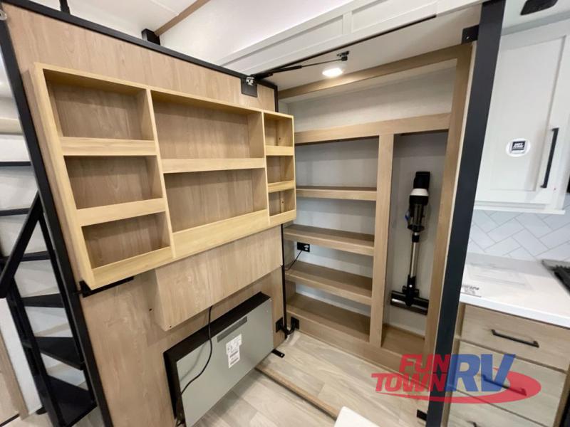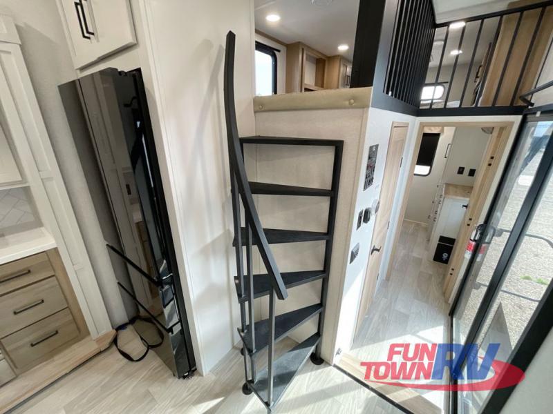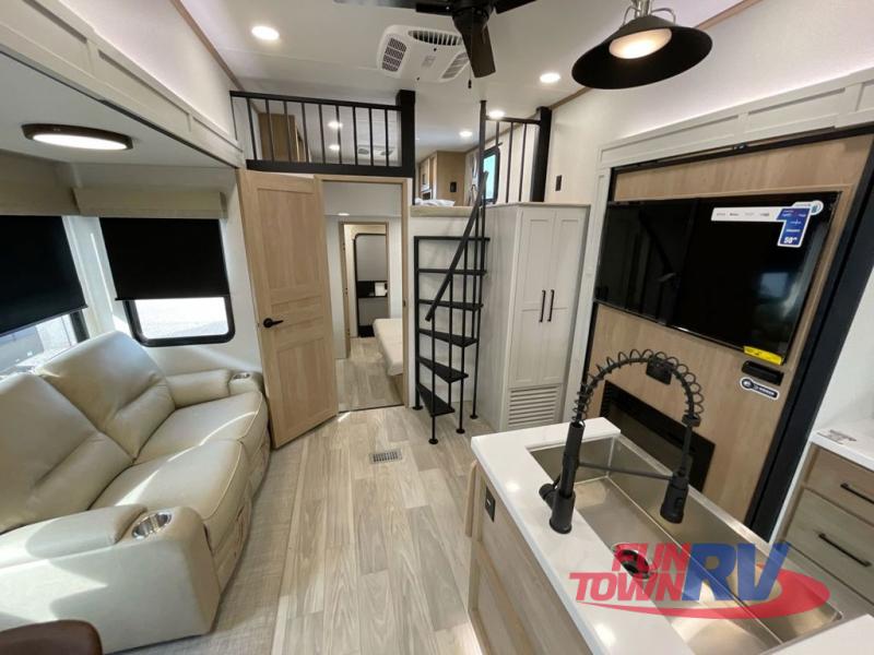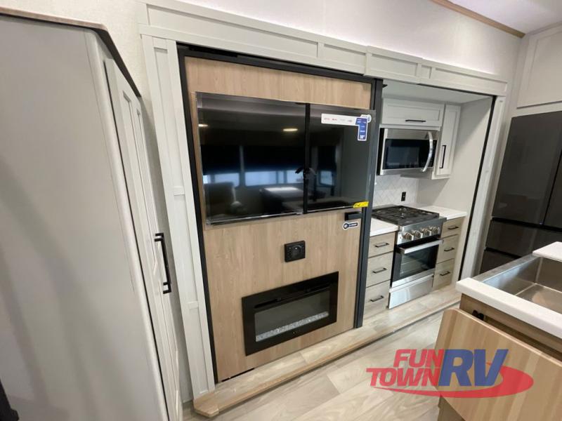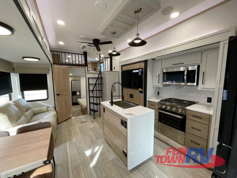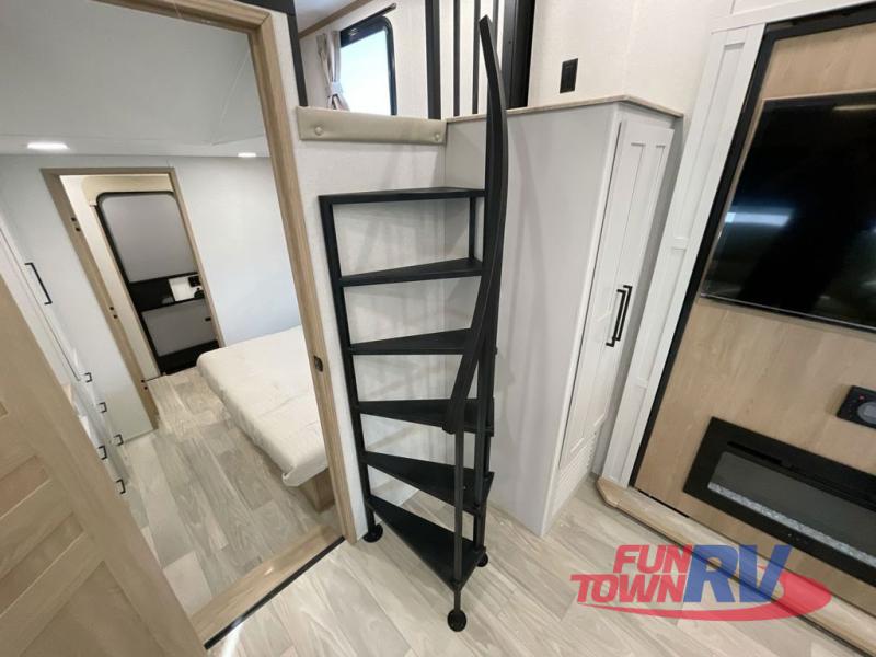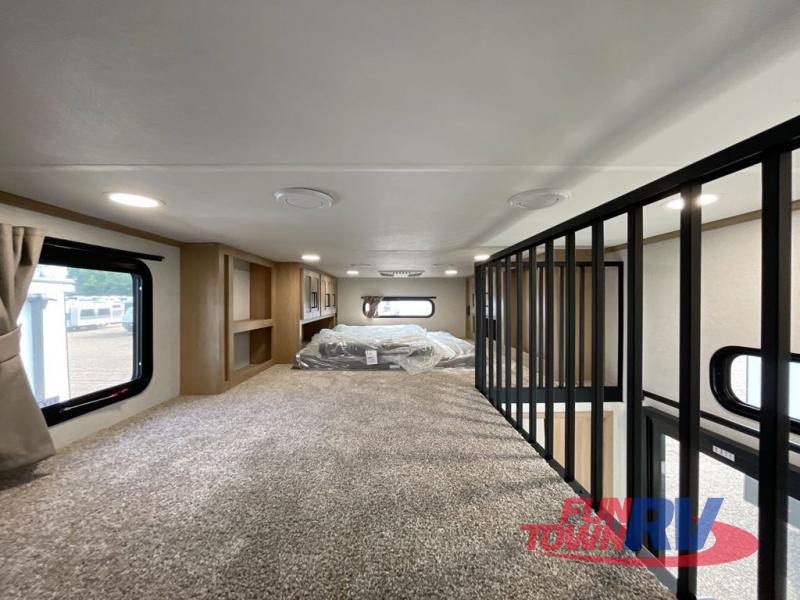 You won't believe the comfort and convenience found in this destination trailer. There are two private bedrooms; one up front with a queen bed slide out and storage space, and one in back with a queen bed slide out and a half bath! There is even washer and dryer prep here if you want to add those appliances and the second entry door is found here so you can easily slip out in the morning. Above each of these rooms is a loft area three total bunk mats, storage cabinets, and TV prep in the front loft if you want to add entertainment. Everyone can meet in the combined kitchen and living room that includes dual opposing slides, theater seating across from the 50" flat screen TV and fireplace, plus a free-standing dinette with chairs and bench seating. The chef of your group will love the large kitchen island with a countertop extension, a 16.2 cu. ft. 12V refrigerator, a hidden pantry, and more!