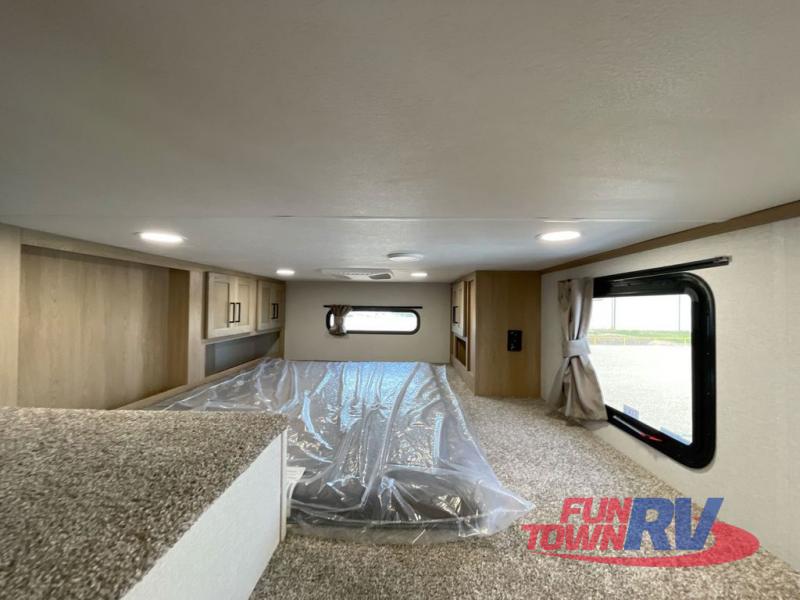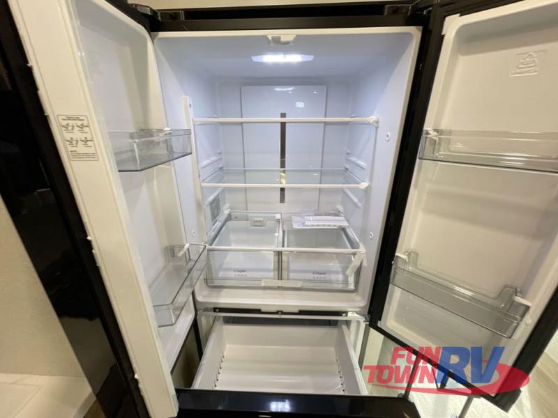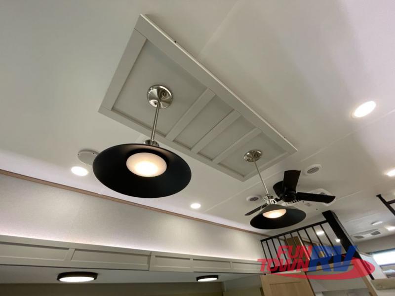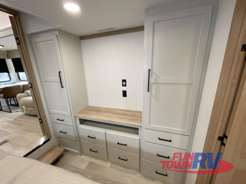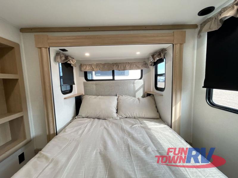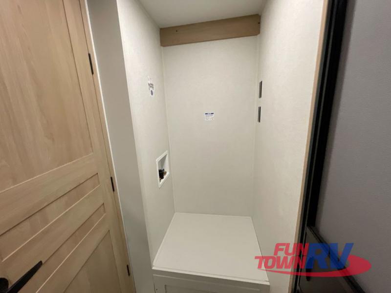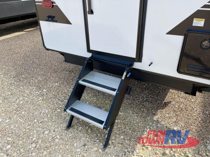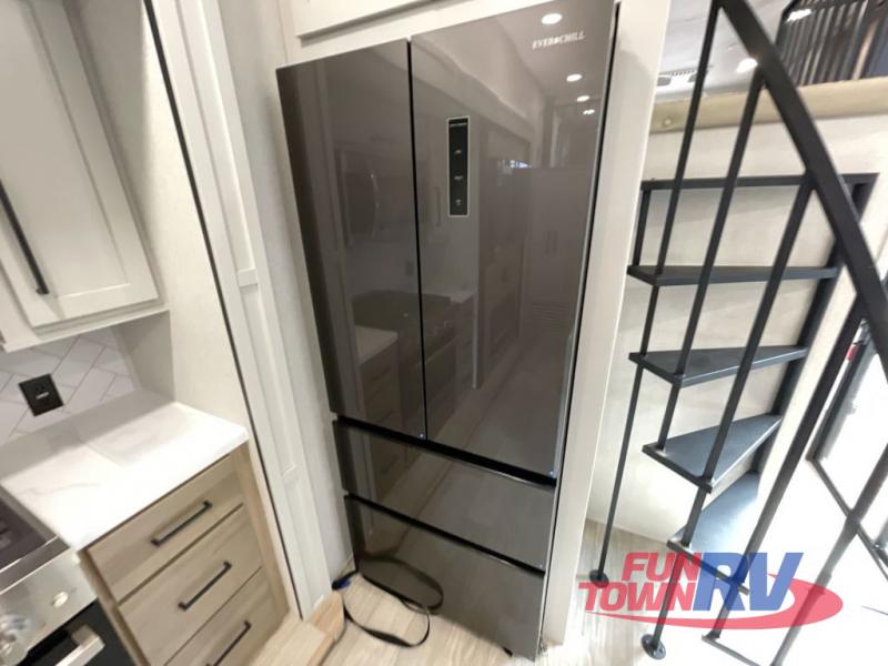 You won't believe the comfort and convenience found in this destination trailer. There are two private bedrooms; one up front with a queen bed slide out and storage space, and one in back with a queen bed slide out and a half bath! There is even washer and dryer prep here if you want to add those appliances and the second entry door is found here so you can easily slip out in the morning. Above each of these rooms is a loft area three total bunk mats, storage cabinets, and TV prep in the front loft if you want to add entertainment. Everyone can meet in the combined kitchen and living room that includes dual opposing slides, theater seating across from the 50" flat screen TV and fireplace, plus a free-standing dinette with chairs and bench seating. The chef of your group will love the large kitchen island with a countertop extension, a 16.2 cu. ft. 12V refrigerator, a hidden pantry, and more!