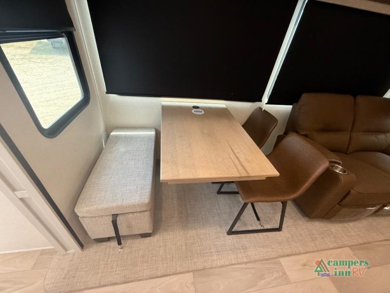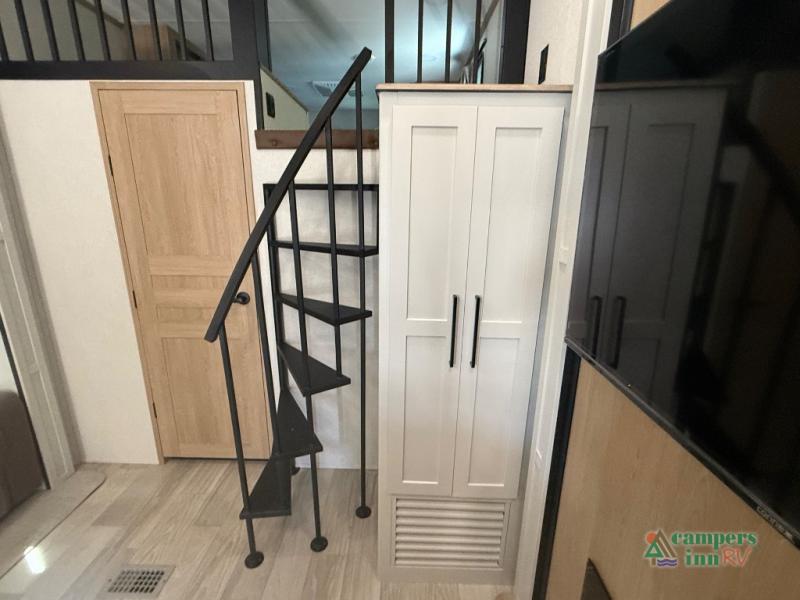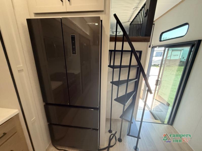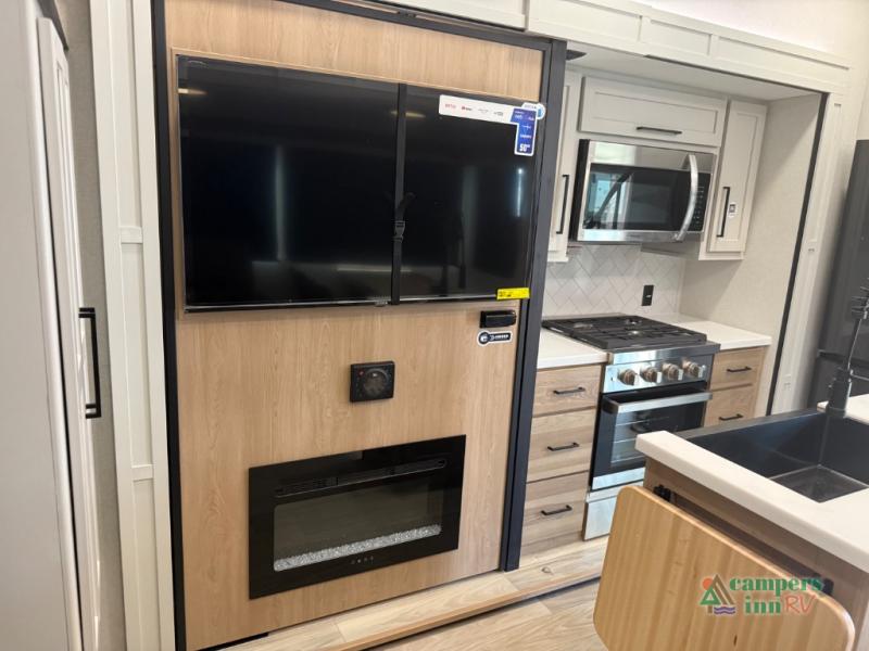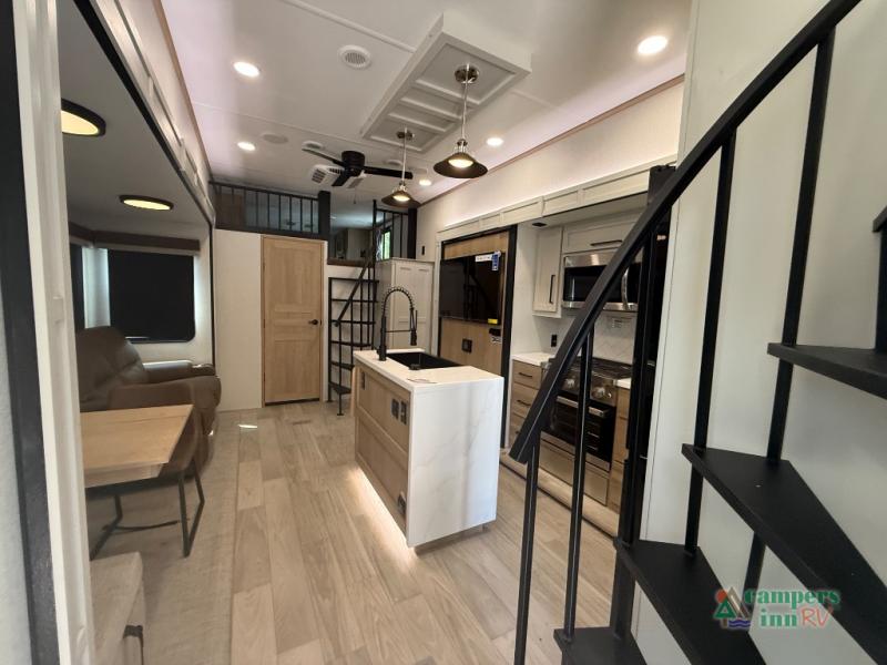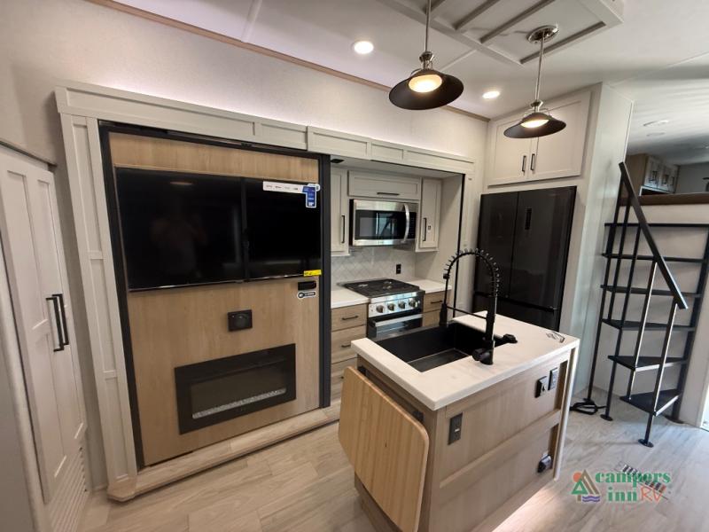 You won't believe the comfort and convenience found in this destination trailer. There are two private bedrooms; one up front with a queen bed slide out and storage space, and one in back with a queen bed slide out and a half bath! There is even washer and dryer prep here if you want to add those appliances and the second entry door is found here so you can easily slip out in the morning. Above each of these rooms is a loft area three total bunk mats, storage cabinets, and TV prep in the front loft if you want to add entertainment. Everyone can meet in the combined kitchen and living room that includes dual opposing slides, theater seating across from the 50" flat screen TV and fireplace, plus a free-standing dinette with chairs and bench seating. The chef of your group will love the large kitchen island with a countertop extension, a 16.2 cu. ft. 12V refrigerator, a hidden pantry, and more!