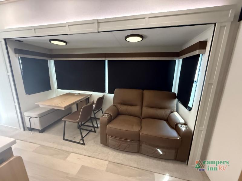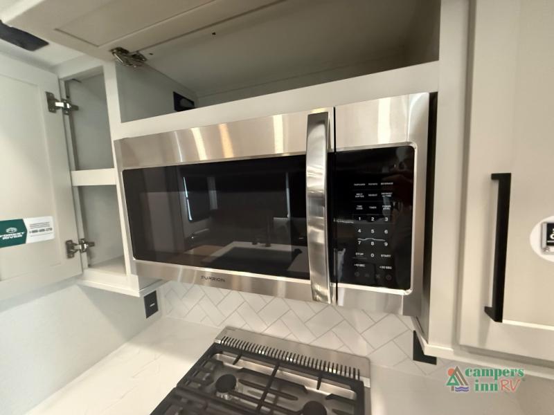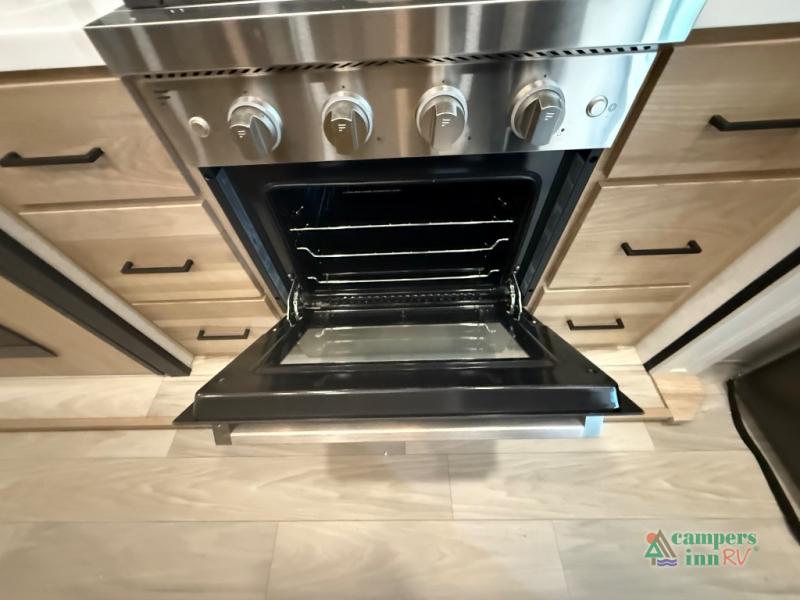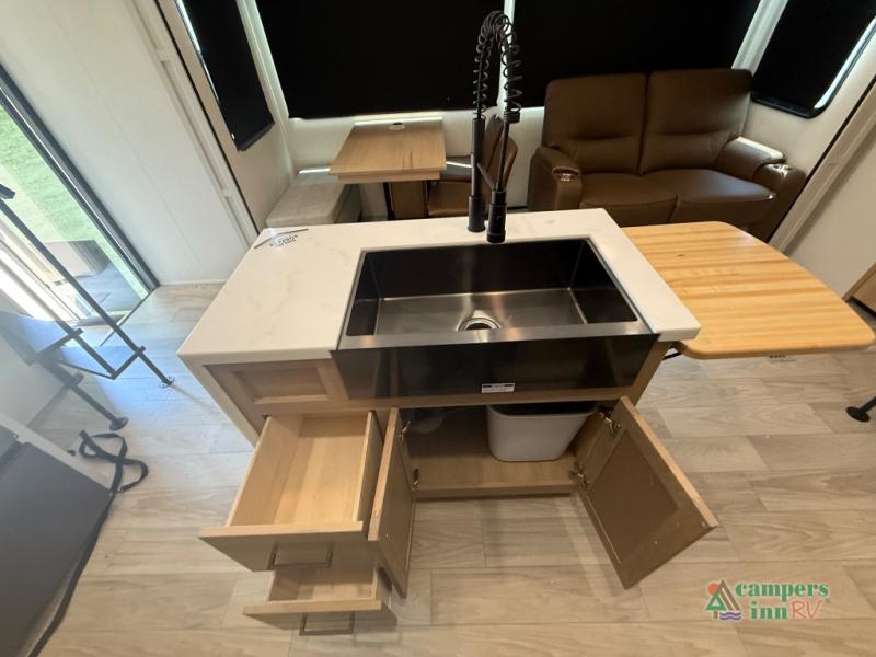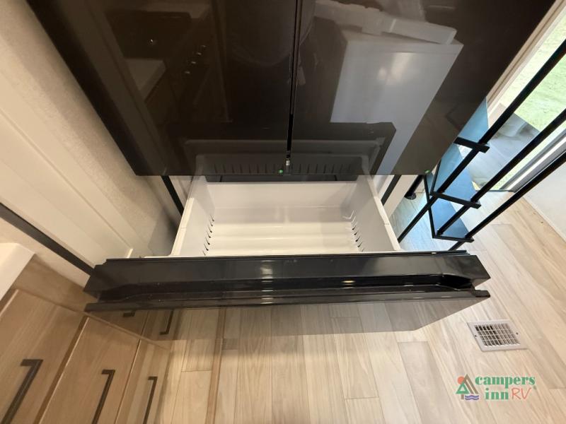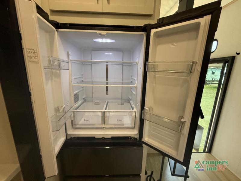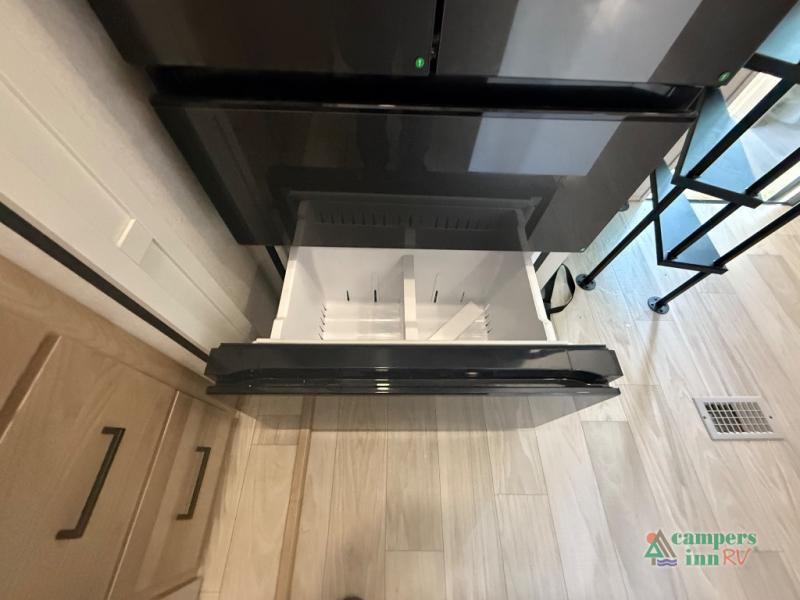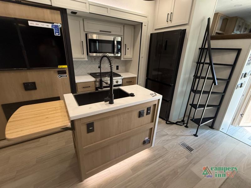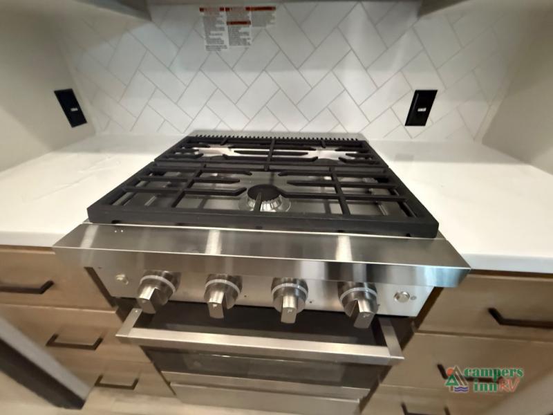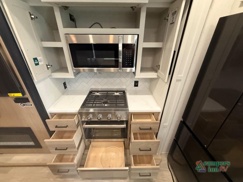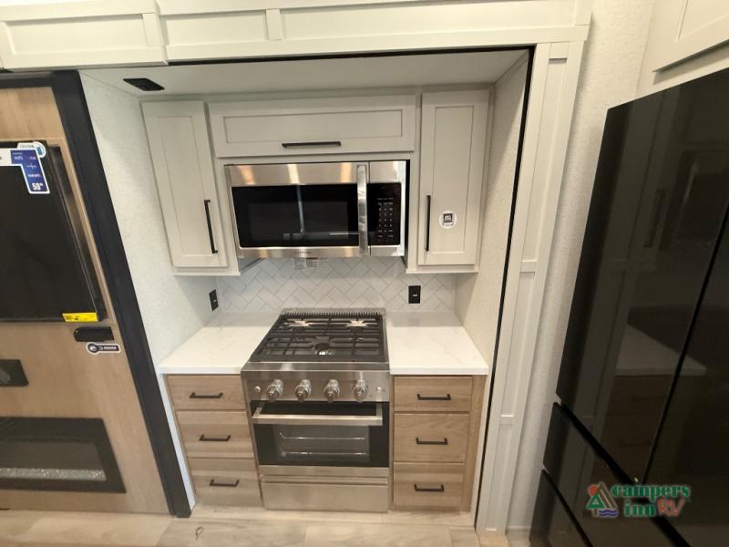 Kitchen Amenities: Equipped with a 19 cu. ft. 12V stainless steel refrigerator and a Chef Collection 3-burner, 24" range with drawer, facilitating home-like meal preparation.