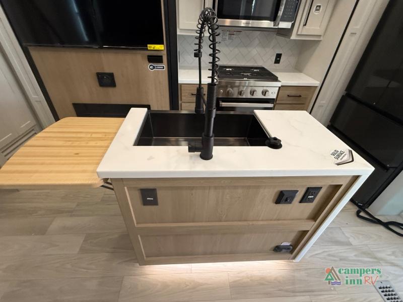The Sandpiper Destination Trailers by Forest River are ready for extended stays at the location of your choice! The cambered powder coated frame with rust prohibitor will help extend the life of your RV and the Underbelly Armor will protect your trailer and provide better insulation. There are also color matched exterior fiberglass sidewalls outside, along with rain gutters with extra long drip spouts to prevent black streaking, and an exterior porch light just like at home. The Destination Package includes features to make your trips hassle-free, like the two 15,000 BTU A/C units, on-demand water heater, and Chef Collection three burner 24" range. A commercial style kitchen faucet and designer backsplash is included with the Extended Stay Package, as well as solid surface countertops, and a stainless steel apron sink with a strainer to name a few comforts. Available options include a central vacuum system, stabilizer jacks, plus dual pane windows and more!
