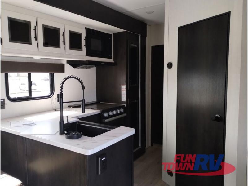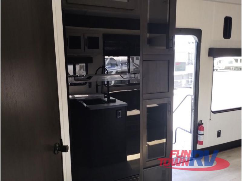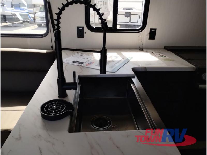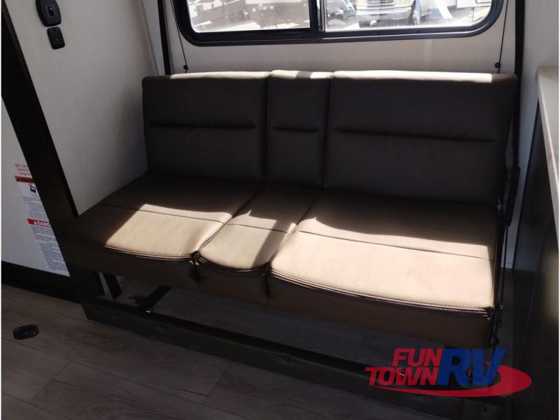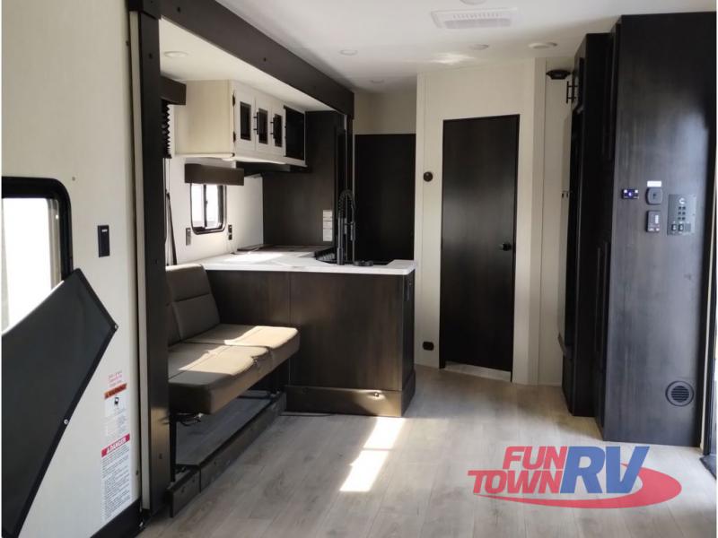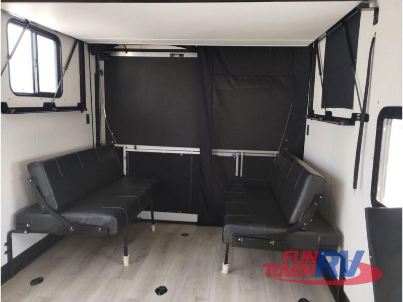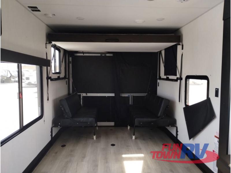 You're going to love this spacious toy hauler with a kitchen slide out! There is a 10' 6" garage with 15' 10" total garage space if you include the main living area where the flip-up sofa and optional lounge chairs are. Once your toys are unloaded, your crew can relax on the roll-over sofas, and at night they can sleep on the quick set queen bed system. You will enjoy the front master bedroom with a Rogue king bed, dual wardrobes, and a private entrance into the dual entry bath!