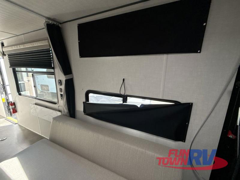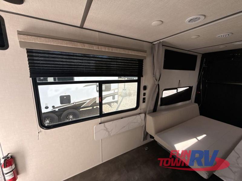Sleeping for four, generous cargo space, and a raised rear ramp patio deck can only mean one thing, a whole lot of fun! Grab your gear and a couple of friends and head out for a camping weekend in the playground of your choice. Bring the quad, bikes, or take the kayaks to the lake and enjoy all sorts of fun. Unload your toys and gear and set up the double 30" x 72" sofas with table between in the garage area for added seating during meals, games time, or just hanging out. The kitchen is fully equipped to keep everyone fueled for all the adventures you can create. A full bath with shower including a skylight for added natural light and headroom makes it easy to get cleaned up. Anyone waiting in line can certainly use the hot/cold shower outside to rinse off. When you are ready to sleep, the front private bedroom will be a welcome retreat, and there is plenty of storage space, including a walk-in closet!