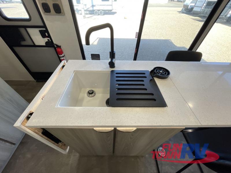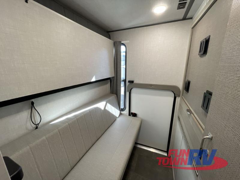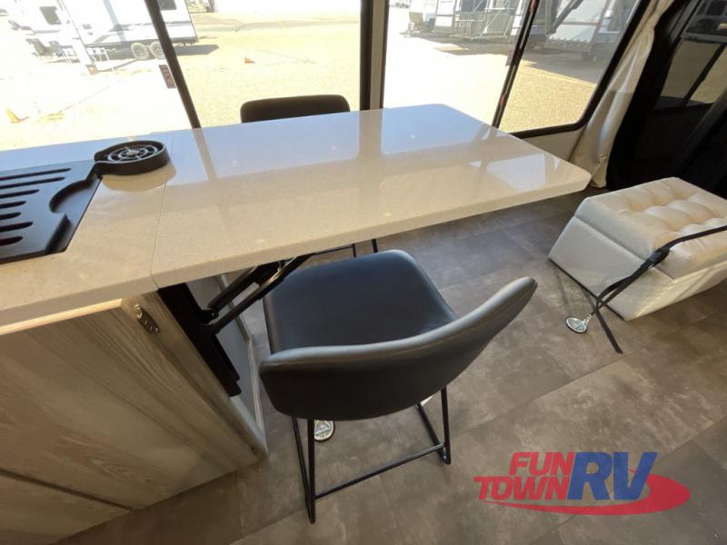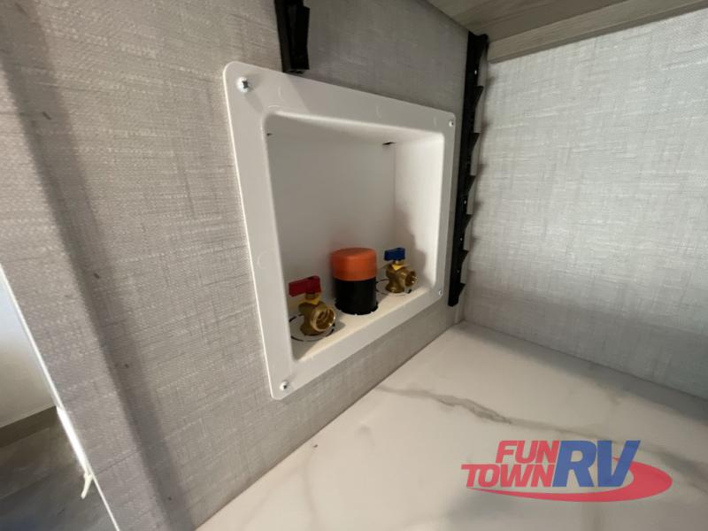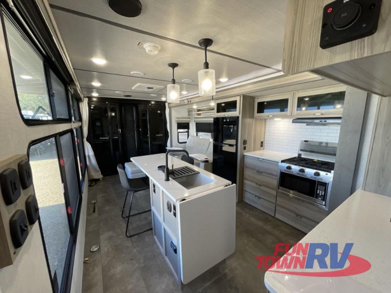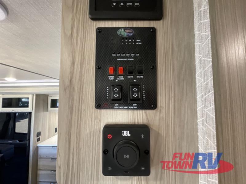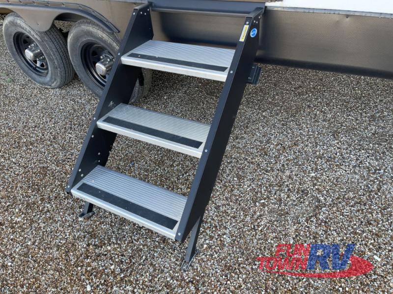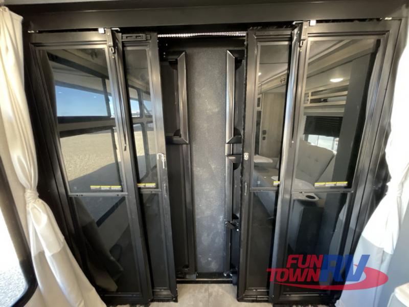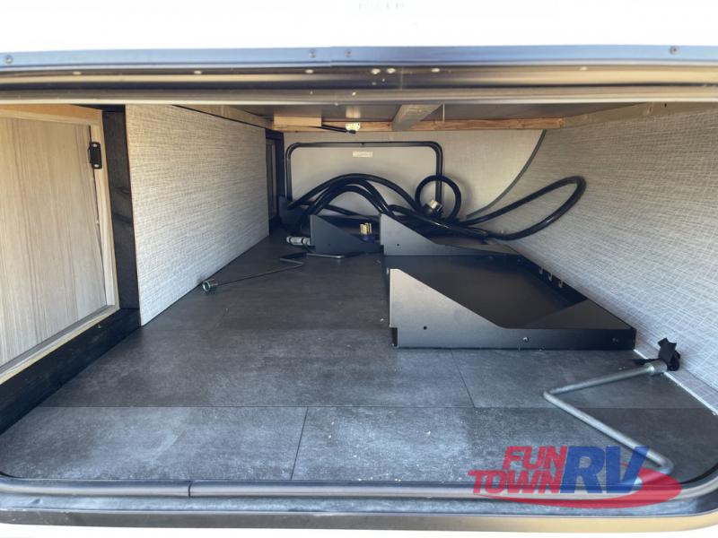 There is a lot to love about this toy hauler! Starting with the 1,500 lb. capacity patio with a three seasons door that leads into the garage area. Once you remove your off-road toy from the 1,500 lb. tie downs, you can open up the slide that houses theater seating with a chaise lounge, a dual swinging 12V refrigerator, and cooktop. The kitchen also has a hutch and island with sink and flip-up countertop. You even have a movie theater projector with premium sound to watch your favorite movies in style. The set of bunk beds have their own privacy with a secret door to access them and a bike door for outside access. Everyone can freshen up with the large shower in the full bathroom. The front private bedroom has a king bed with Versa tilt, wardrobes on either side of the bed, and another wardrobe to keep your clothes looking their best!