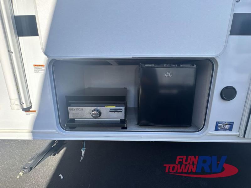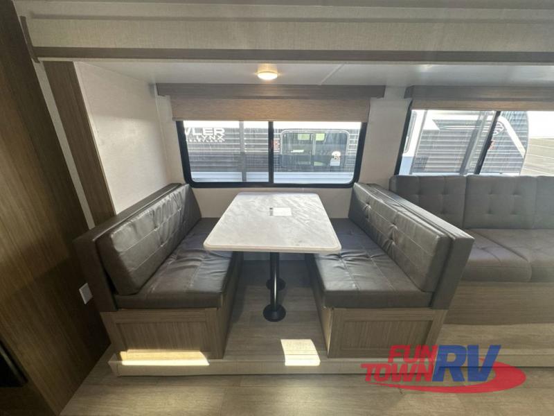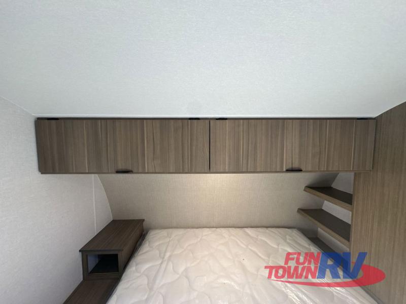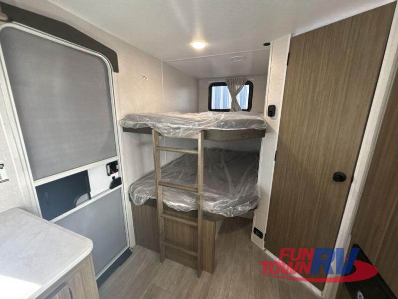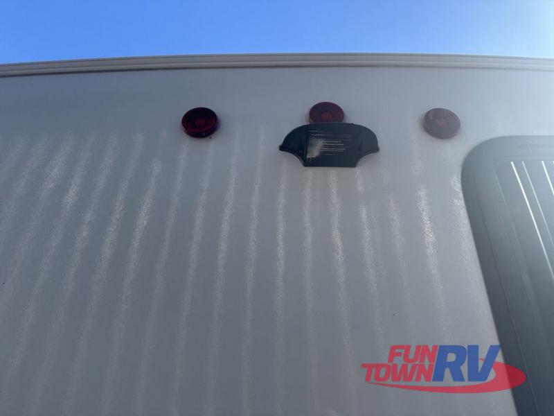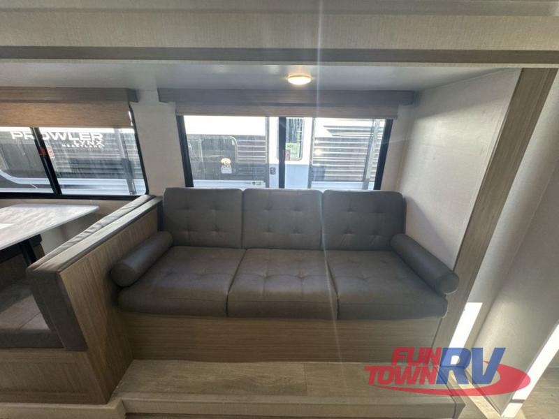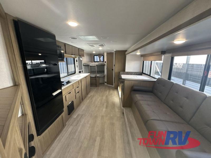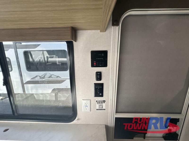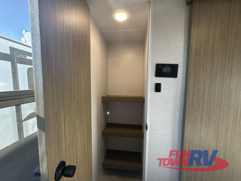 This is a trailer your whole crew will love! There are double-size bunks with a ladder that will be perfect for the kids or your guests, and the full bath is close by for easy nighttime use. The main living area is spacious thanks to the large slide out, and here you'll find the sofa and booth dinette. After you've worked up an appetite, you can prepare lunch on the three burner cooktop or use the microwave oven. There is ample counter space to lay out fresh veggies, chips, and drinks, or you might just set up outdoors since there is an exterior camp kitchen! The front private bedroom includes an RV king bed with dual wardrobes, a closet with shelves, plus a hamper to keep your space tidy.