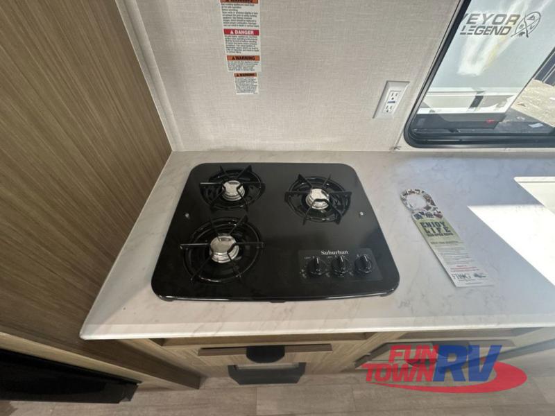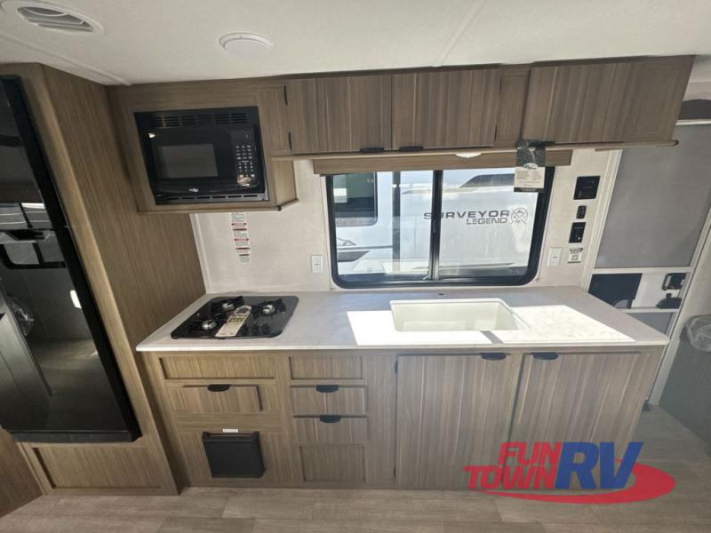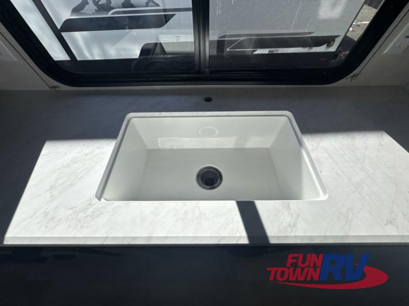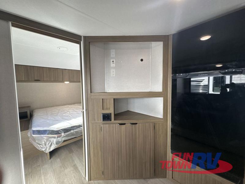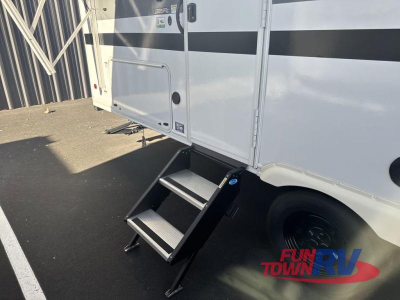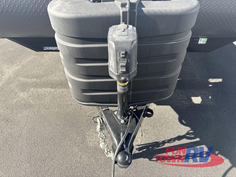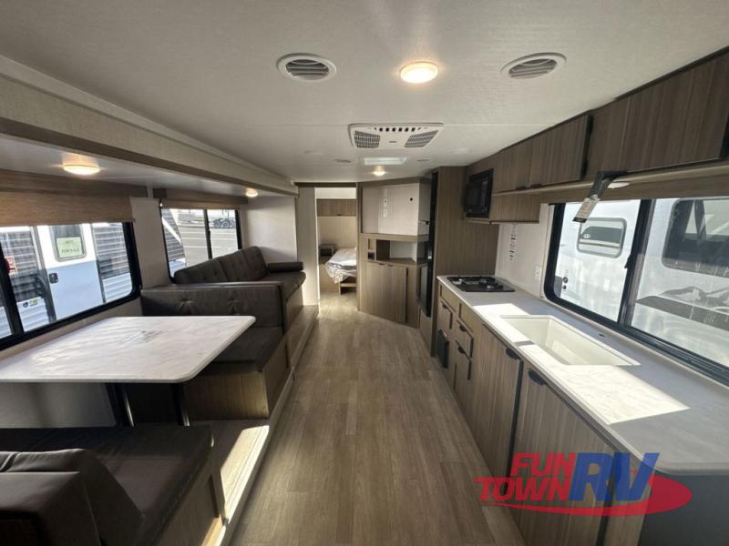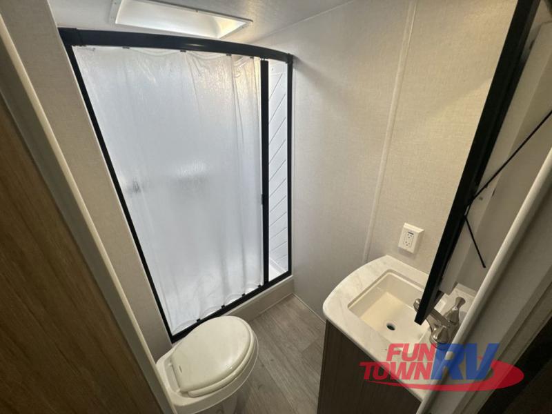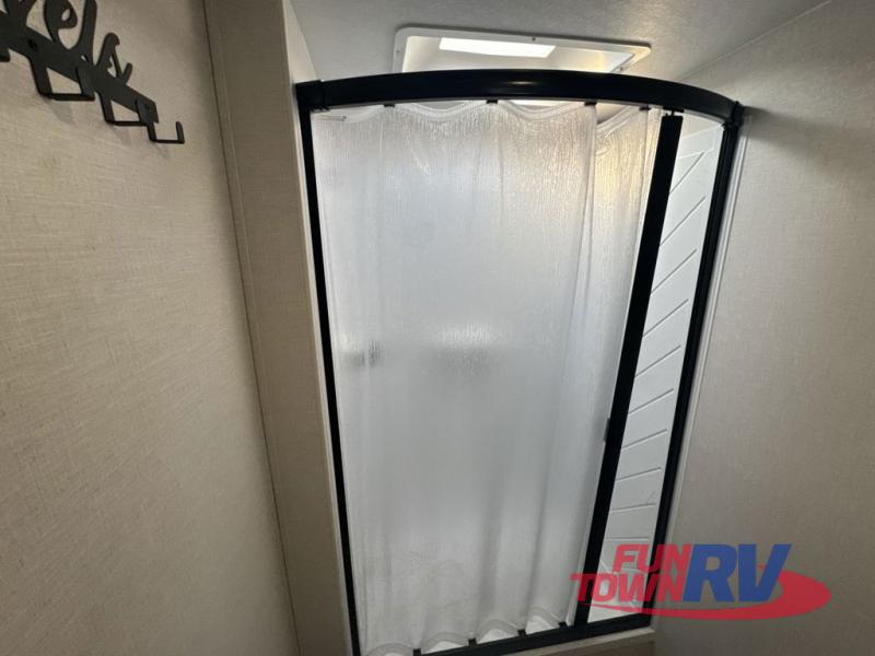 This is a trailer your whole crew will love! There are double-size bunks with a ladder that will be perfect for the kids or your guests, and the full bath is close by for easy nighttime use. The main living area is spacious thanks to the large slide out, and here you'll find the sofa and booth dinette. After you've worked up an appetite, you can prepare lunch on the three burner cooktop or use the microwave oven. There is ample counter space to lay out fresh veggies, chips, and drinks, or you might just set up outdoors since there is an exterior camp kitchen! The front private bedroom includes an RV king bed with dual wardrobes, a closet with shelves, plus a hamper to keep your space tidy.