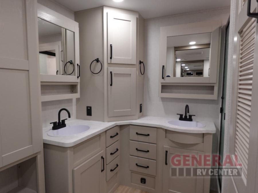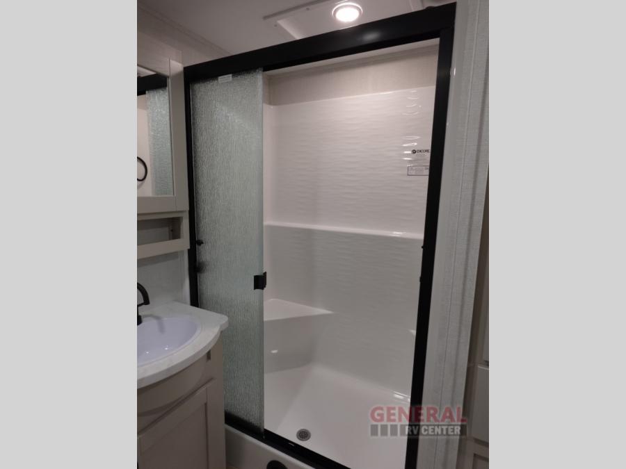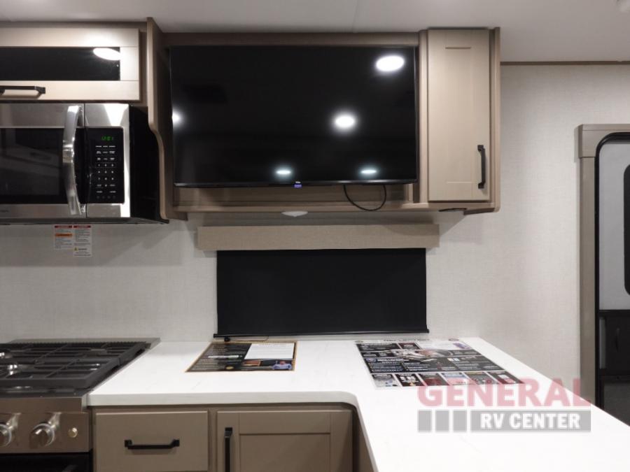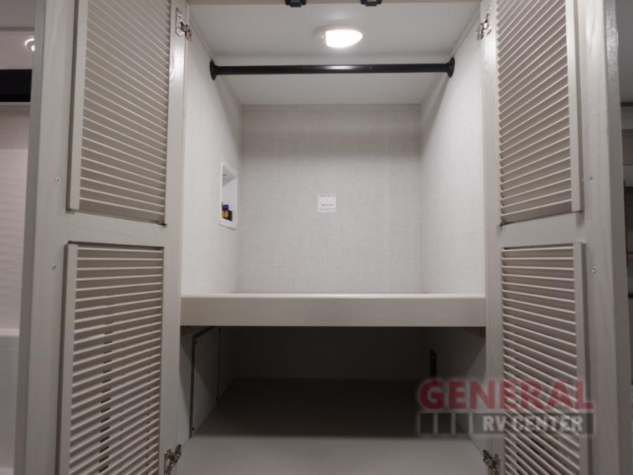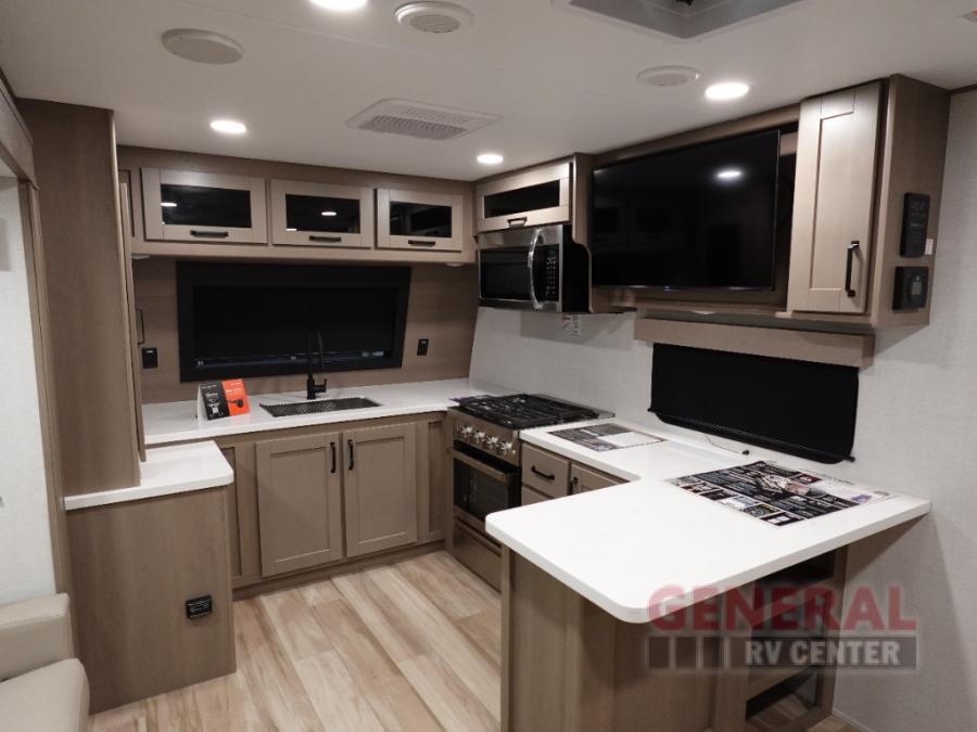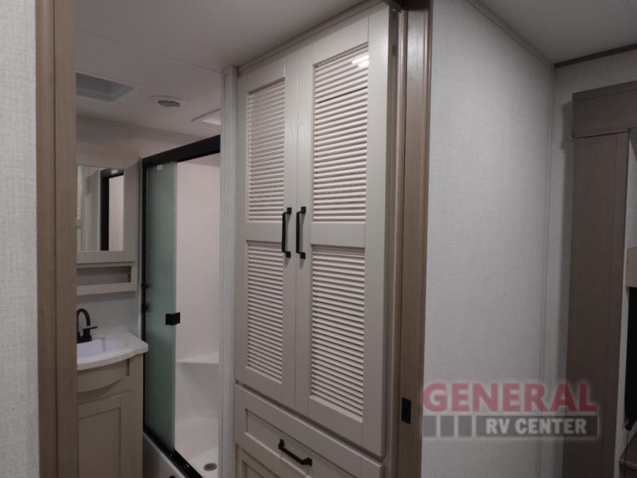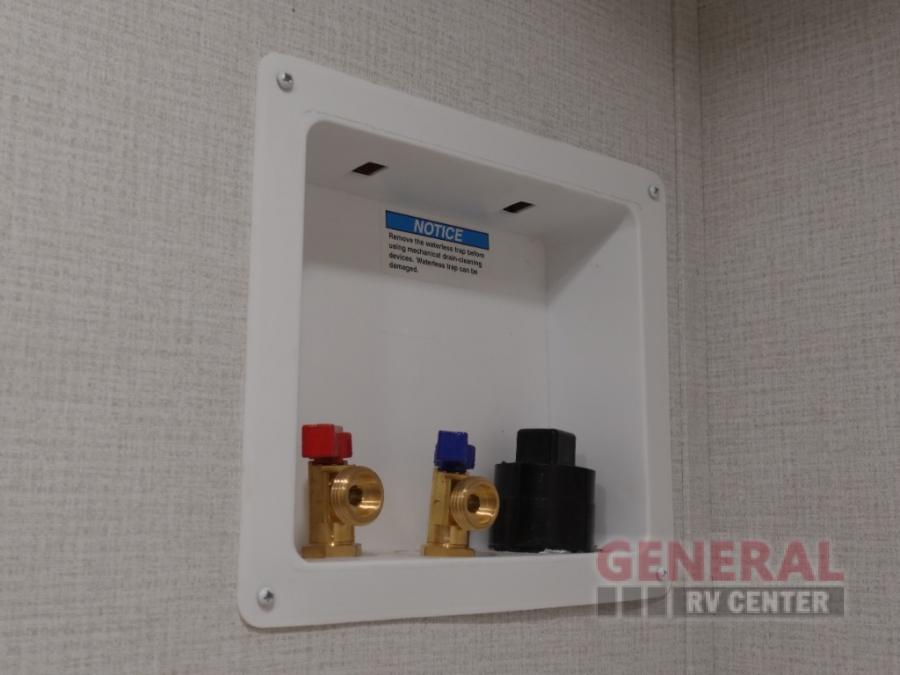 This front kitchen travel trailer will be perfect for camping trips to the lake or woods! There is ample counter space to prep your best meals, including an L-shaped kitchen counter with a bar stool to enjoy your coffee at.. This unit features a massive master bedroom with a bed, two closets, and a spacious rear bath. There are two bath sinks here, a 30" x 48" shower, plus washer and dryer prep if you choose to add these appliances!