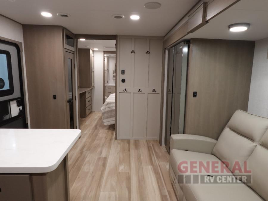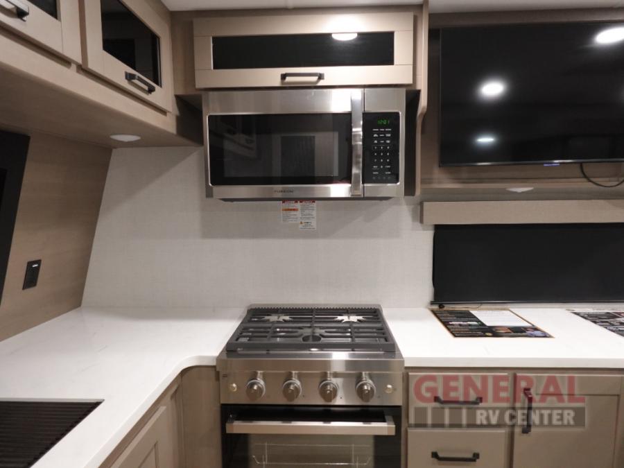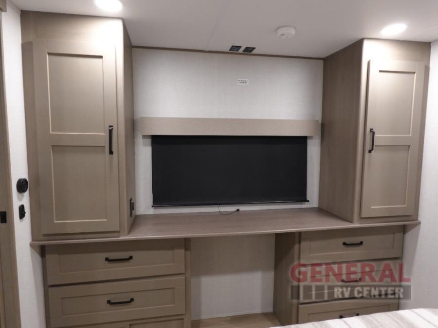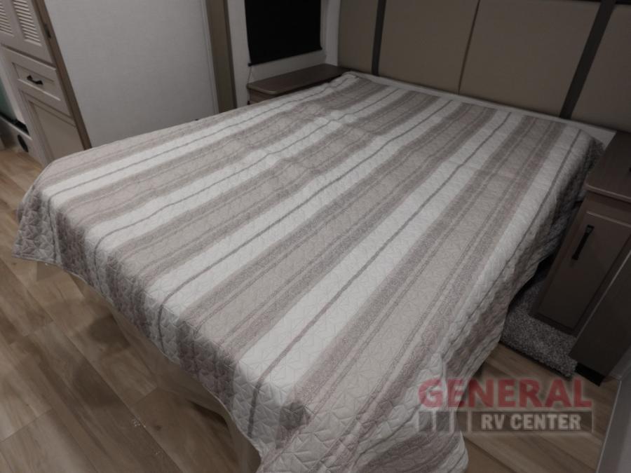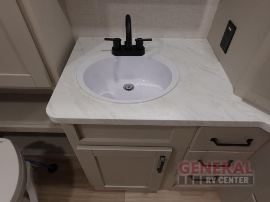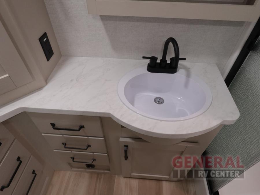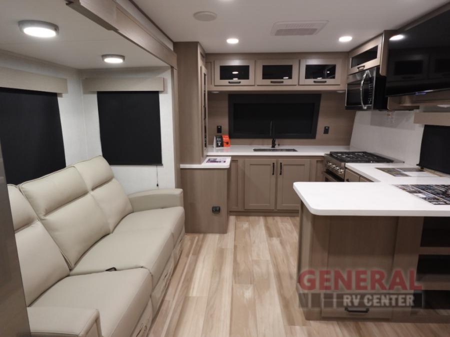 This front kitchen travel trailer will be perfect for camping trips to the lake or woods! There is ample counter space to prep your best meals, including an L-shaped kitchen counter with a bar stool to enjoy your coffee at.. This unit features a massive master bedroom with a bed, two closets, and a spacious rear bath. There are two bath sinks here, a 30" x 48" shower, plus washer and dryer prep if you choose to add these appliances!