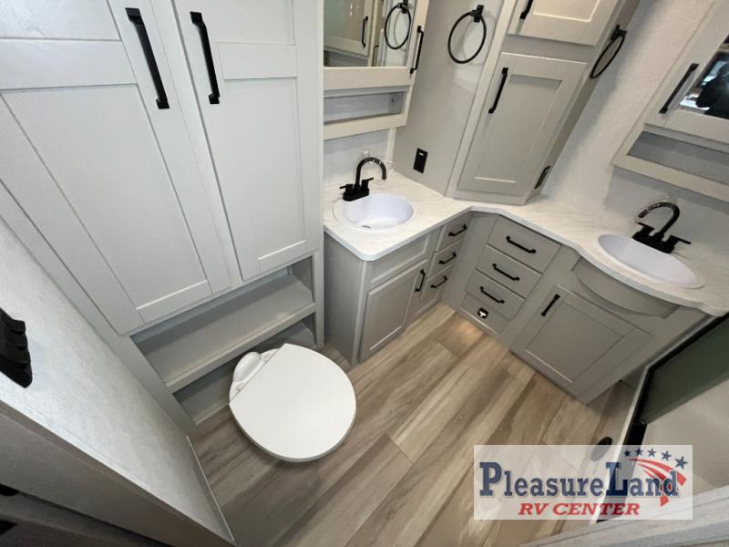 This front kitchen travel trailer will be perfect for camping trips to the lake or woods! There is ample counter space to prep your best meals, including an L-shaped kitchen counter with a bar stool to enjoy your coffee at. The theater seating is inviting, and you can choose the optional tri-fold sofa and end table or optional U-shaped dinette if you need more sleeping space for guests. This unit features a massive master bedroom with a queen bed slide and optional king bed, two closets, and a spacious rear bath. There are two bath sinks here, a 30" x 48" shower, plus washer and dryer prep if you choose to add these appliances!