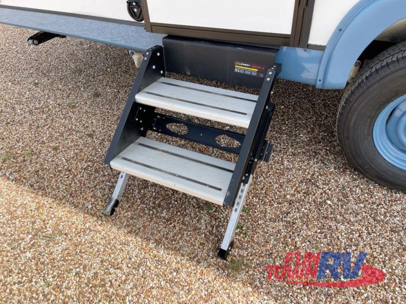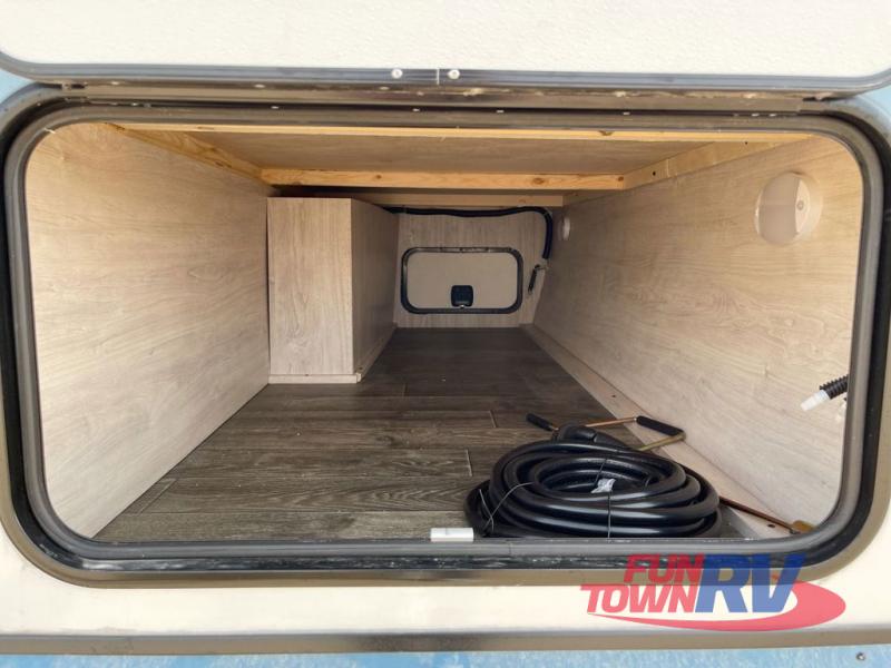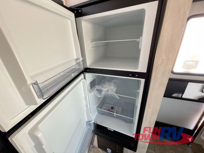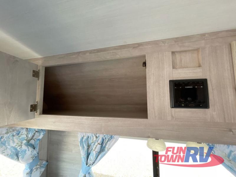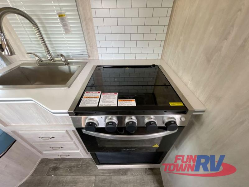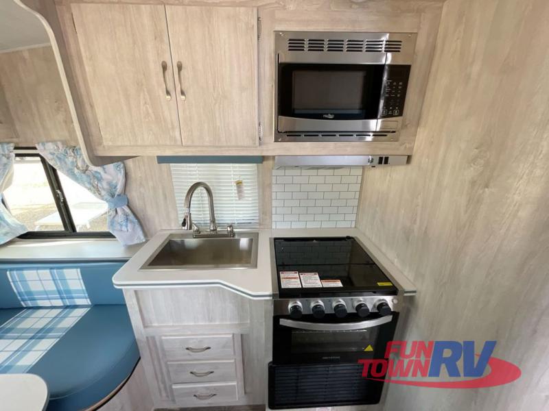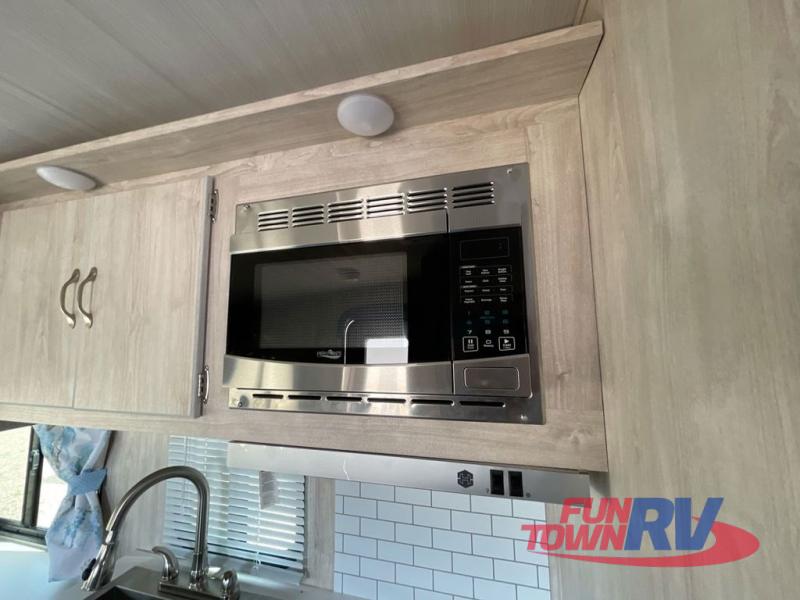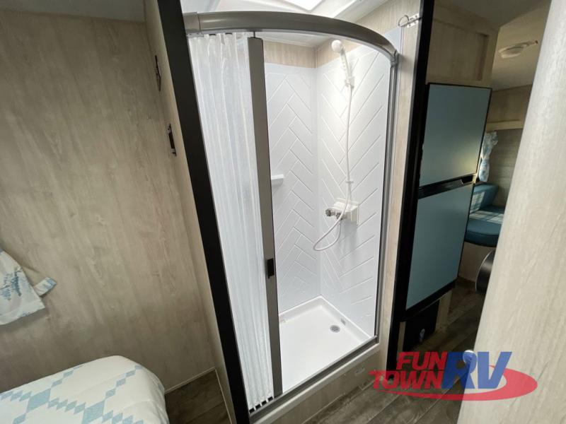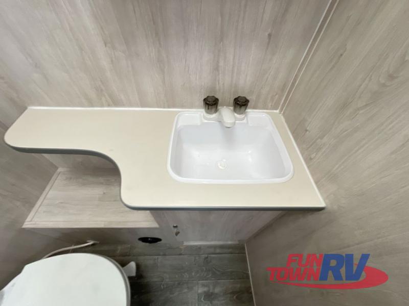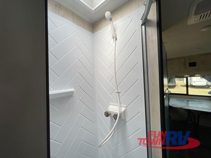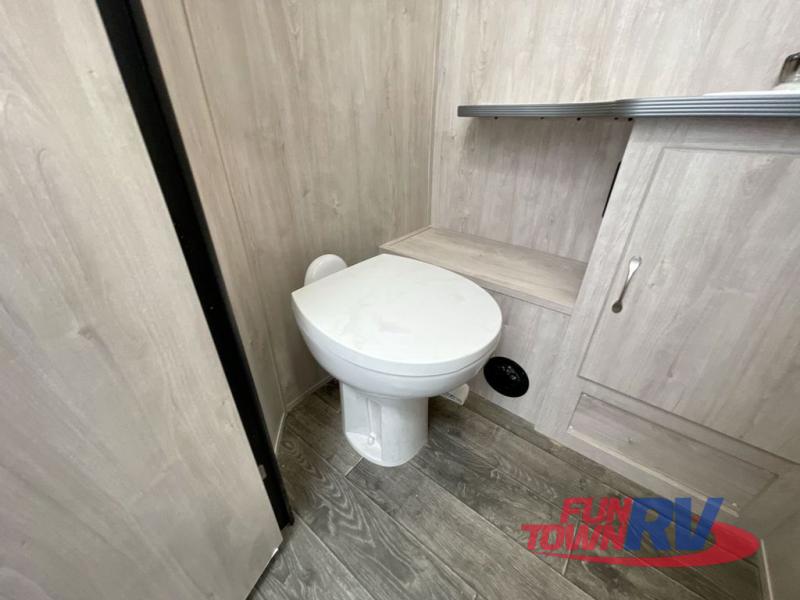 If you enjoy a more classic look for an RV, you'll love this unit. The rear booth dinette is surrounded by windows for bright, open views, and you'll find overhead storage here for dry goods or snacks. The chef of your group will have a cooktop and a microwave oven to prepare meals. The private toilet and sink are right across the hall from the 24" x 36" shower so two people can freshen up at once. This model also features a semi-private front bedroom with a privacy curtain for your own space, plus an RV queen bed and dual shirt closets to keep your clothes tidy!