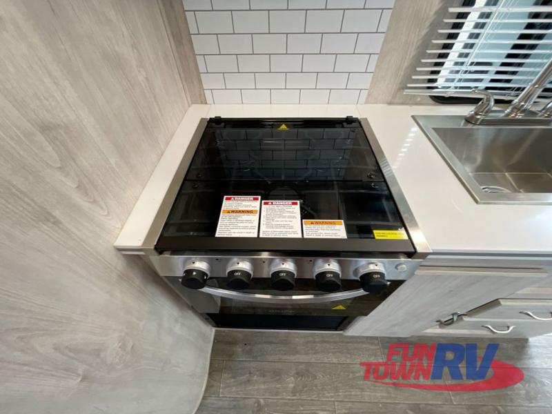 Step into comfort with this classic travel trailer in tow. You will find a rear vintage booth dinette and a sofa slide out with end tables to set your drinks on. The kitchen is complete with a microwave oven, cooktop, plus overhead cabinets for your belongings. After a day outdoors, you can clean up in the 24" x 36" shower, and there is a private toilet and sink across the hall if someone needs to use it while you're cleaning up. This model will feel just like home with its RV queen bed and dual shirt closets for your clothes.