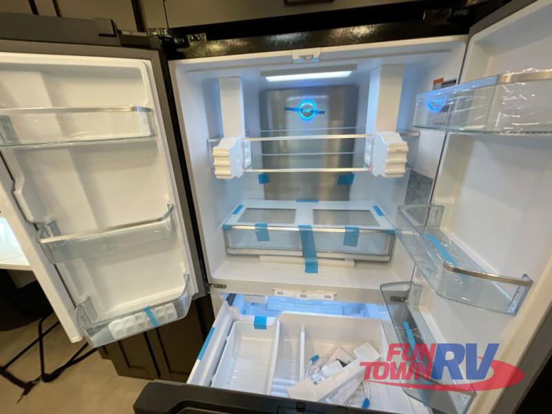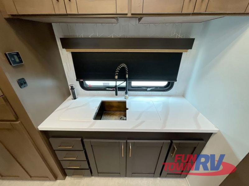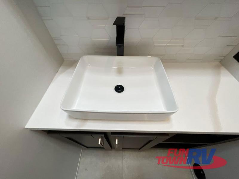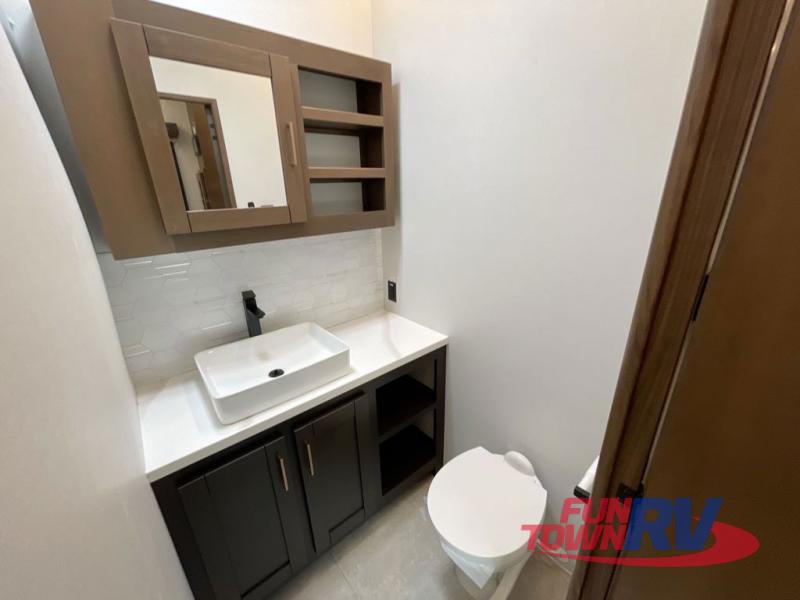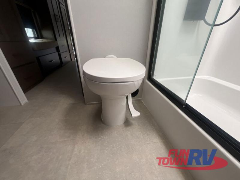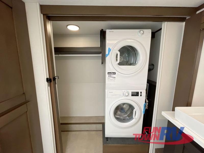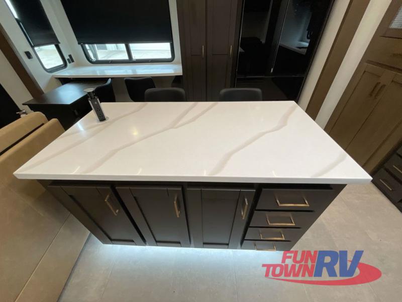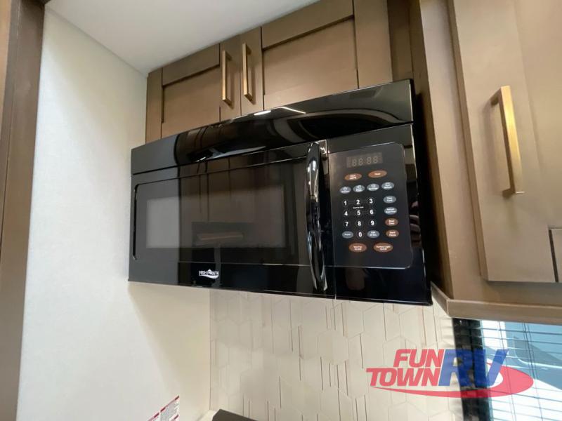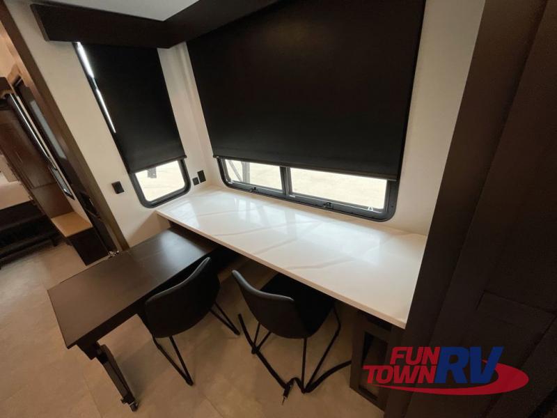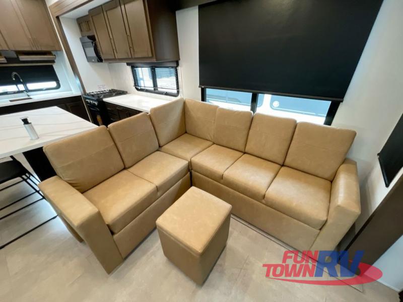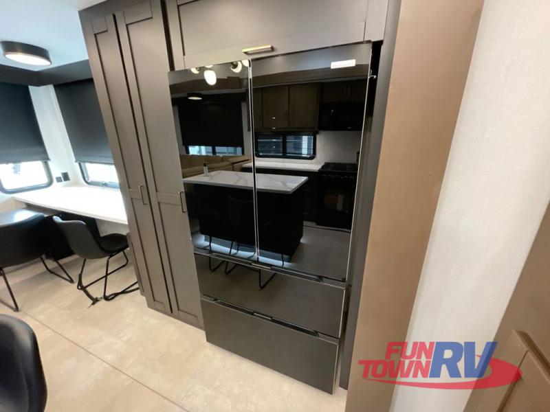 Cook like a chef in the spacious rear kitchen of this luxurious fifth wheel, equipped with overhead cabinets, a pantry, a 12V refrigerator, along with a microwave, and a table with stools for casual dining with family and friends. The living room is the perfect place to relax and entertain yourself, featuring a swing desk for working or playing, an L-shaped sofa for lounging, an entertainment center with a fireplace for cozy nights in, and a convenient half bathroom, ideal for guests. The bedroom is incredibly comfortable, featuring a king bed, a dual dresser for ample storage, and a comfy bench for relaxing. The front bathroom is a spacious oasis, complete with a dual sink, linen closet, walk-in closet, and washer and dryer prep for added convenience. Finally, step outside and enjoy the fresh air under our massive 16’ awning, perfect for relaxing and enjoying the exterior view.
