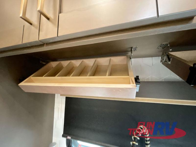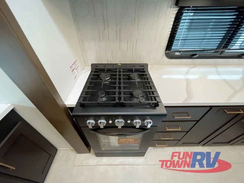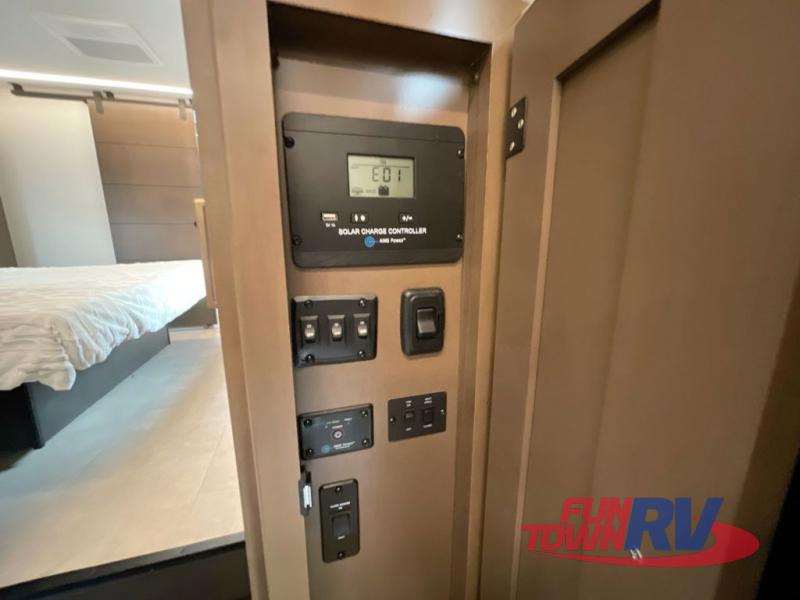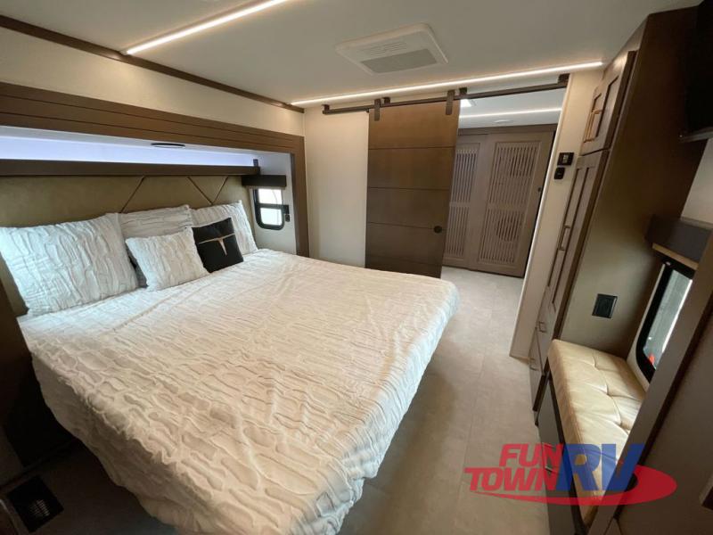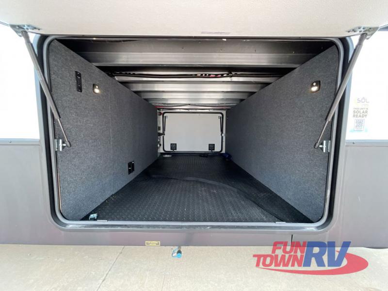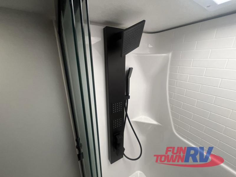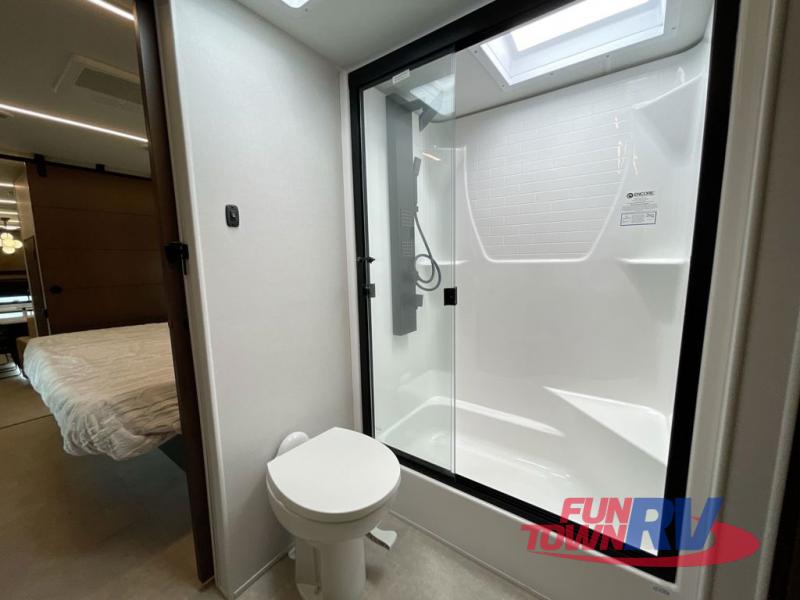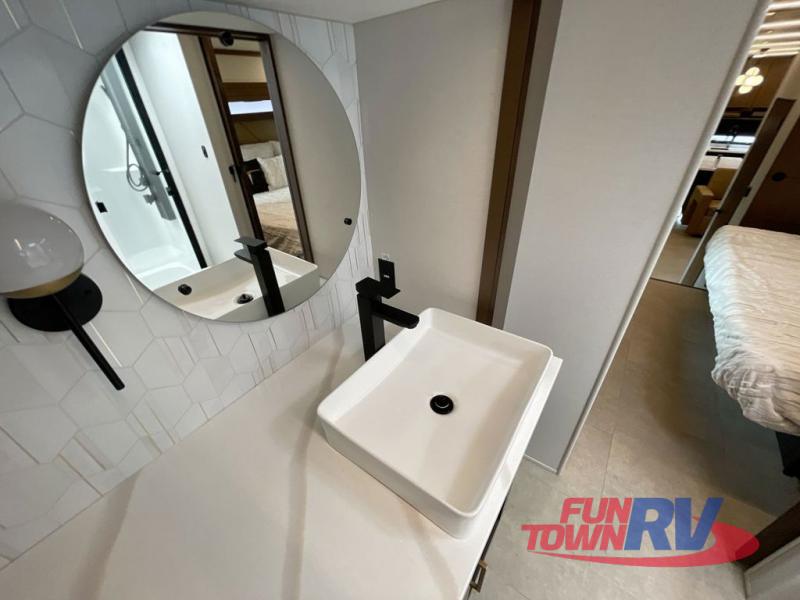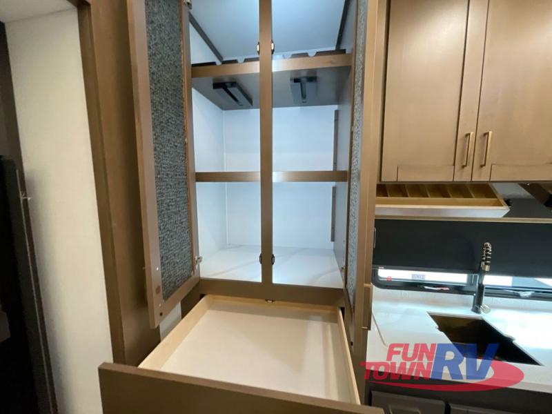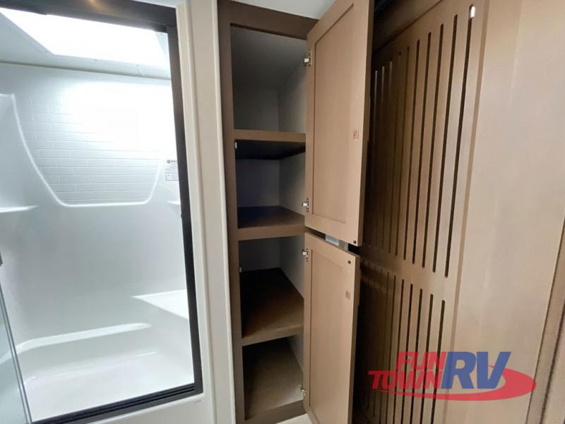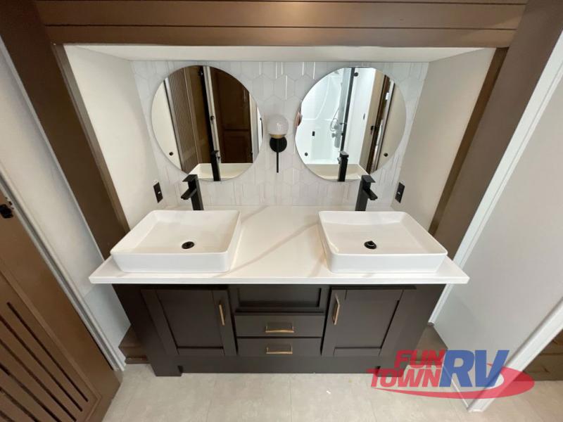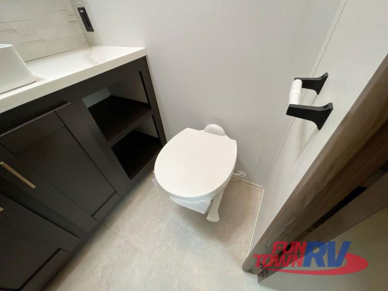 Cook like a chef in the spacious rear kitchen of this luxurious fifth wheel, equipped with overhead cabinets, a pantry, a 12V refrigerator, along with a microwave, and a table with stools for casual dining with family and friends. The living room is the perfect place to relax and entertain yourself, featuring a swing desk for working or playing, an L-shaped sofa for lounging, an entertainment center with a fireplace for cozy nights in, and a convenient half bathroom, ideal for guests. The bedroom is incredibly comfortable, featuring a king bed, a dual dresser for ample storage, and a comfy bench for relaxing. The front bathroom is a spacious oasis, complete with a dual sink, linen closet, walk-in closet, and washer and dryer prep for added convenience. Finally, step outside and enjoy the fresh air under our massive 16’ awning, perfect for relaxing and enjoying the exterior view.