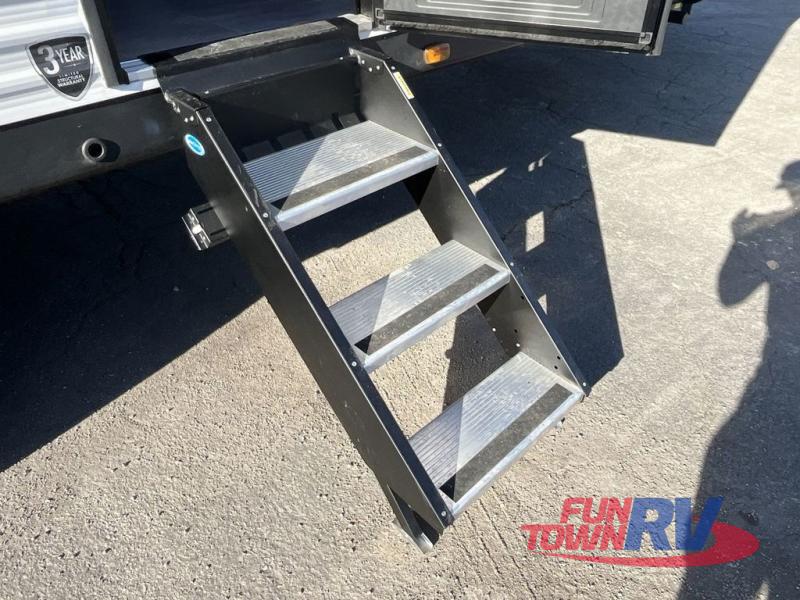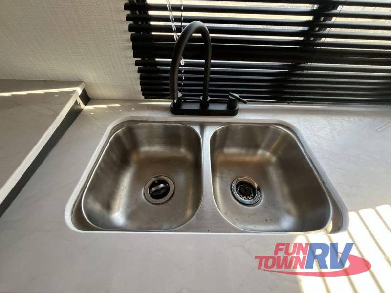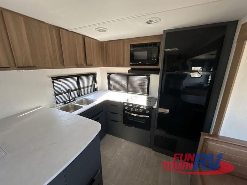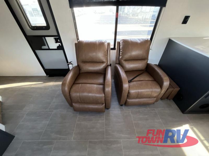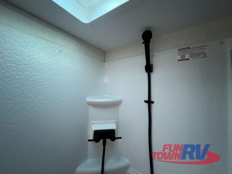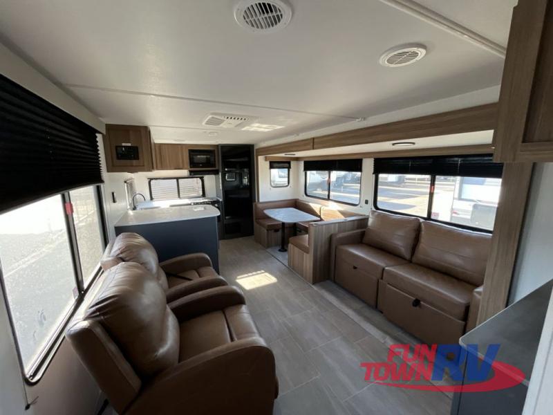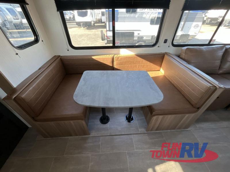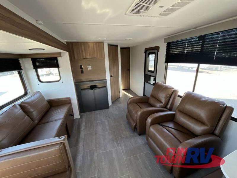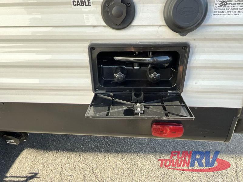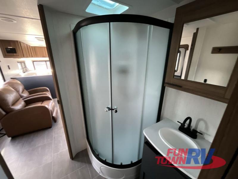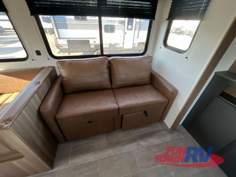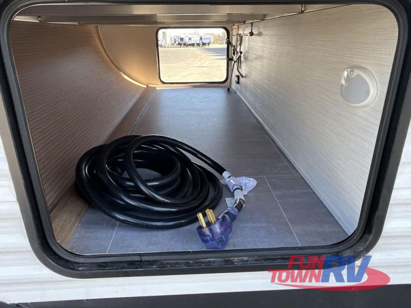 The chef will love cooking in the rear kitchen of this travel trailer! It has plenty of countertop space for meal prep and the U-shaped dinette is a comfortable place to enjoy them at. After you have stuffed your bellies full, relax on either the sofa or one of the two recliners while it settles. Freshen up each morning in the dual entry bathroom with the radius shower that has a skylight above to bring the outdoors inside. It even leads directly into the front private bedroom which has a queen bed with under-bed storage, wireless cell charging stations, and CPAP storage. Keep the dirt outdoors where it belongs with an outside shower!