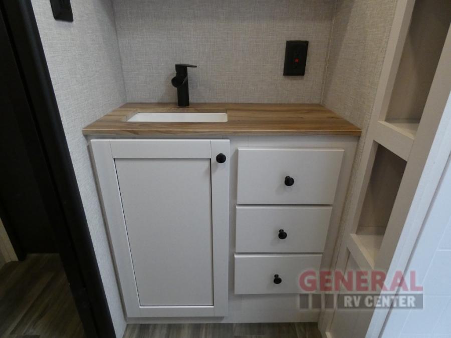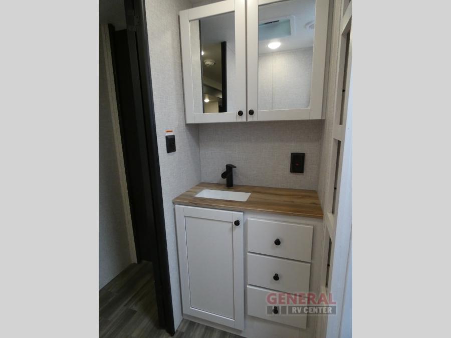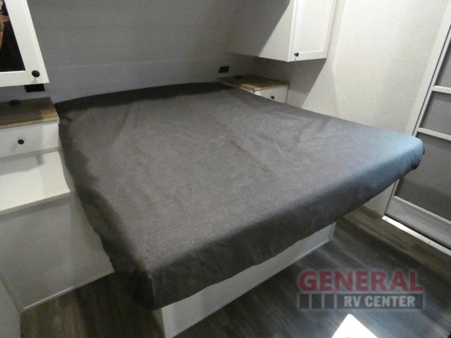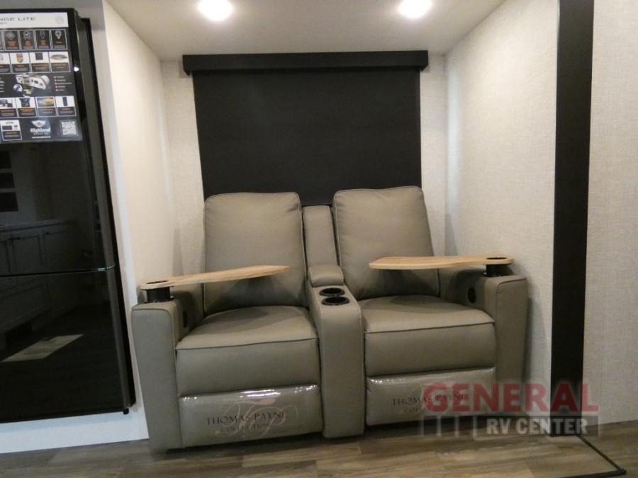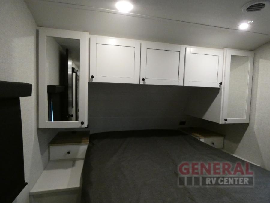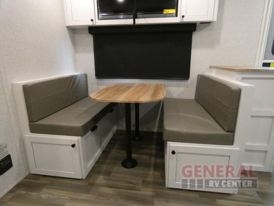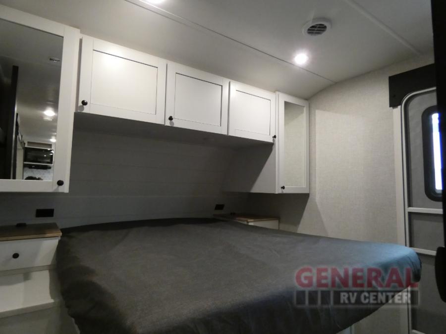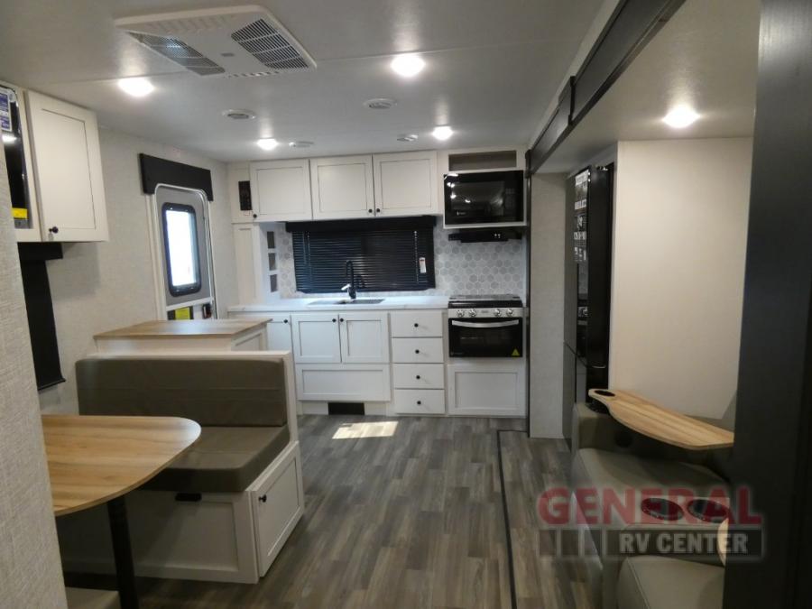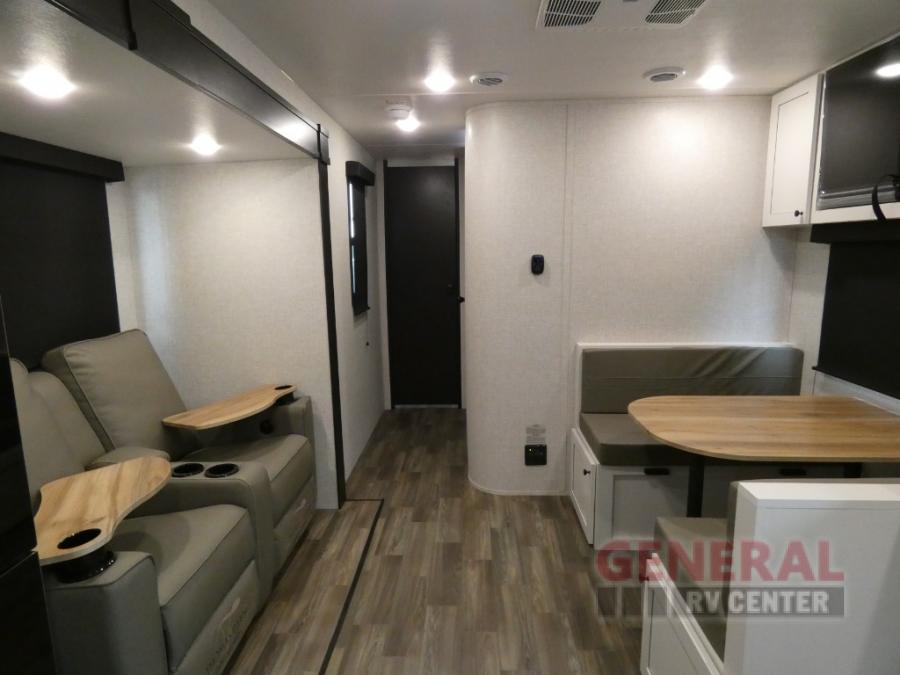 It is easy to enter and exit this travel trailer with the dual entry doors! One of the entrances leads directly into the front private bedroom which has a queen bed with wardrobes on either side, and the other entrance leads into the rear kitchen where you can prepare your best home cooked meals. Enjoy your meals at the booth dinette then play a card game or relax on the theater seats. Rinse the sand out of your hair with the shower in the full bathroom and keep your towel close by with the linen closet. Enjoy your beautiful scenery rain or shine as you relax in a chair underneath the 21' power awning