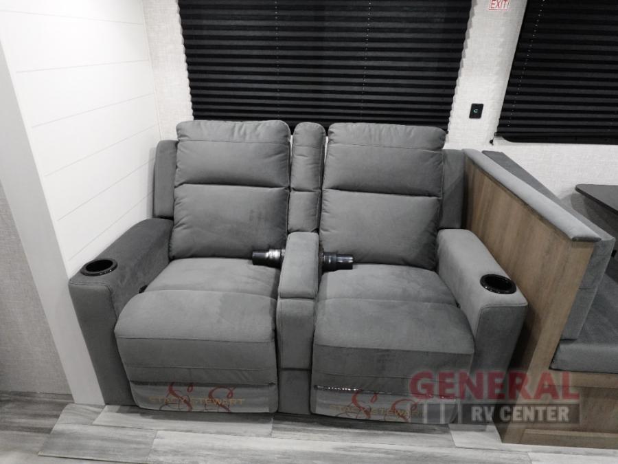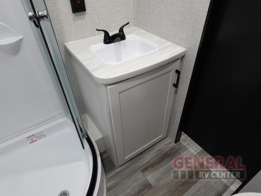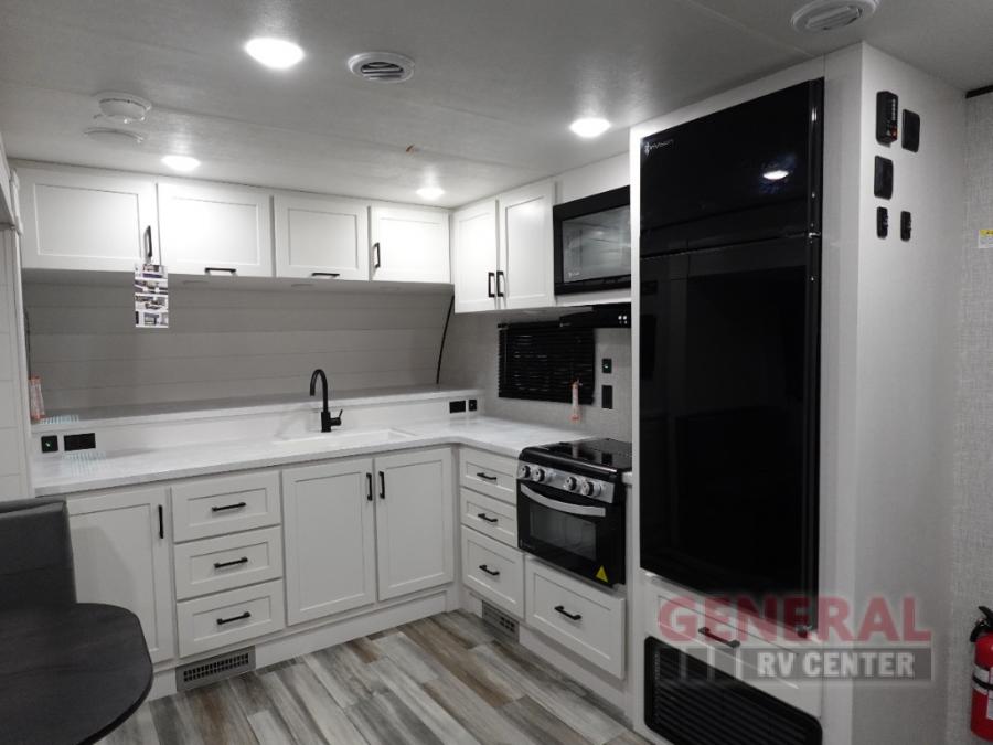 You'll be seeing double with this travel trailer that features dual entry doors and dual slides! The chef of your group will love cooking in the front kitchen with generous counter space, and there is a three burner cooktop with a glass cover, a microwave oven, and an 11 cu. ft. 12V refrigerator. Your crew can dine at the booth dinette or relax on the Jack-knife sofa. A dual entry bath will be easily accessible, and you'll love having your own space in the rear master bedroom. Here, you'll find a bed slide out, two dressers, additional storage, plus washer and dryer prep!