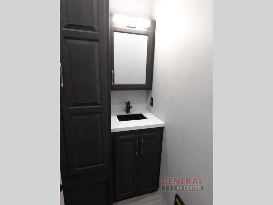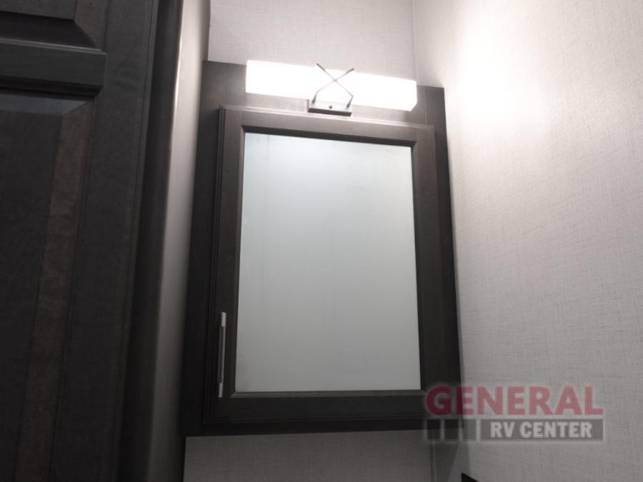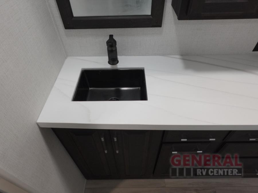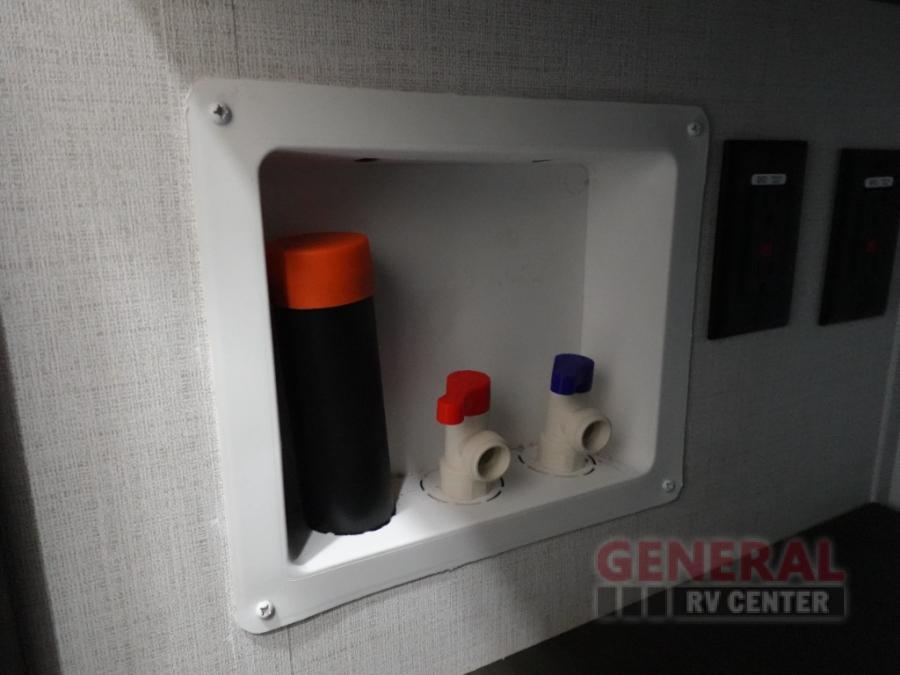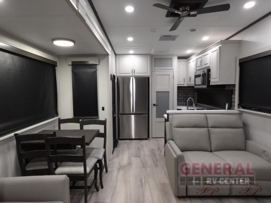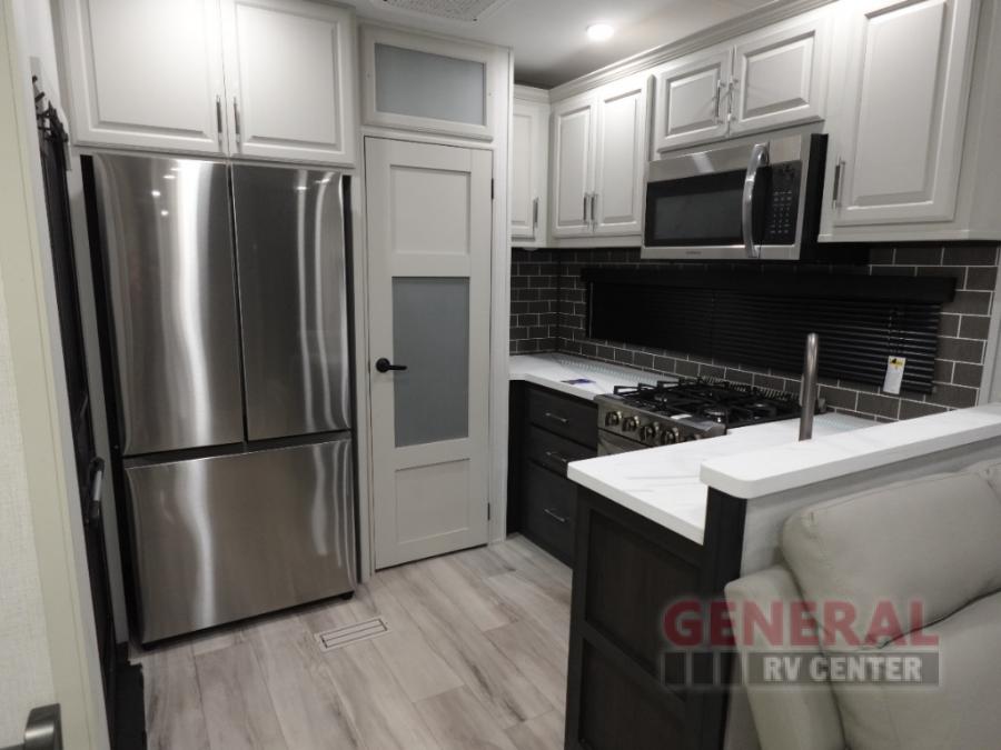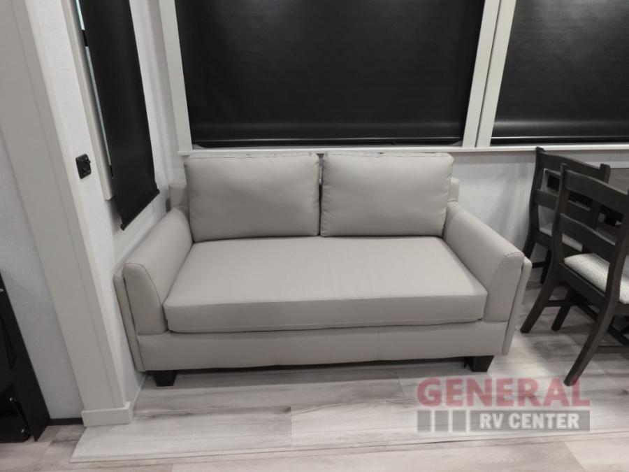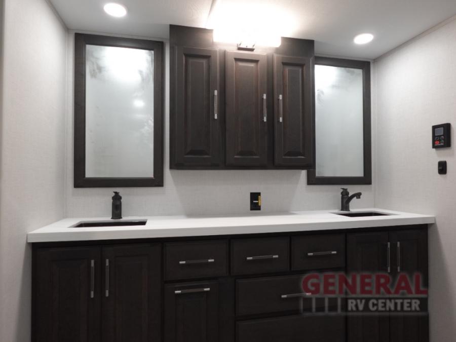 With a bath and a half, it's a clean decision to take this fifth wheel with you on your next camping trip! One of the dual entry doors leads directly into the rear kitchen which has a large pantry and an 18 cu. ft. residential refrigerator to store your food items. The free standing dinette and tri-fold sofa sleeper slide and opposing tri-fold sofa sleeper slide opens up the middle living area for more interior space. The half bathroom is conveniently located straight in through the main entry and features washer and dryer prep for clean clothes throughout your entire trip. The master suite not only has a king bed slide with storage underneath and a bench next to a dresser, but also access into the front full bathroom which has a dual sink vanity, a shower with a seat, and a toilet with privacy walls!