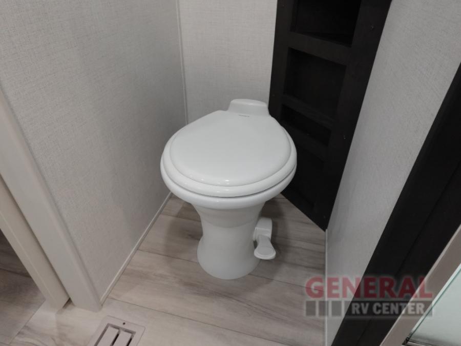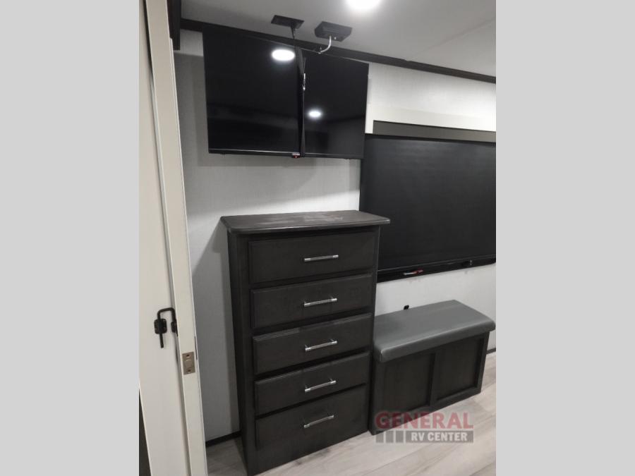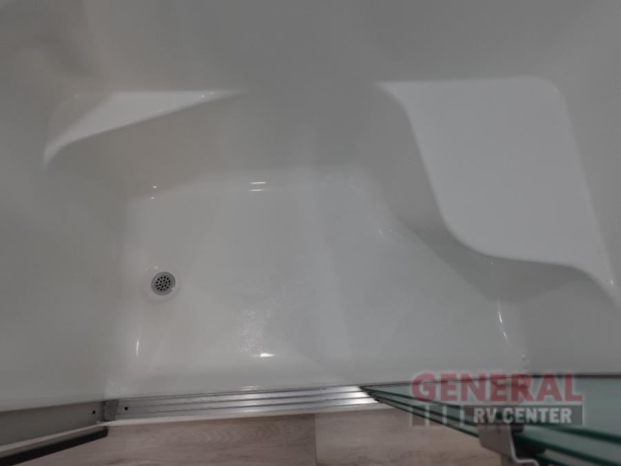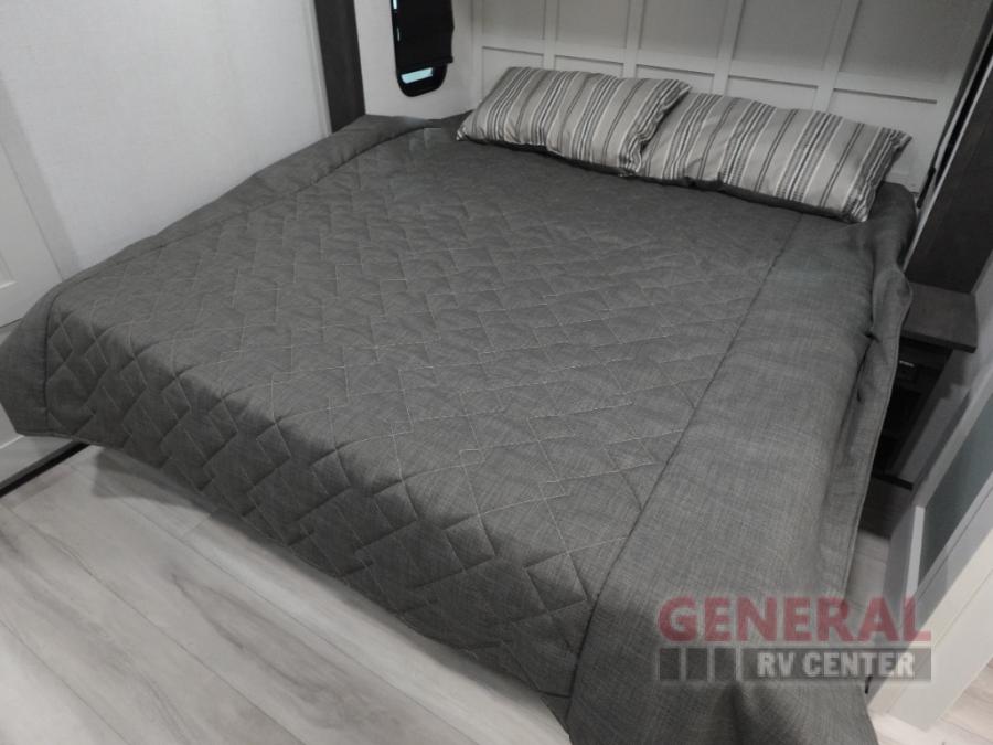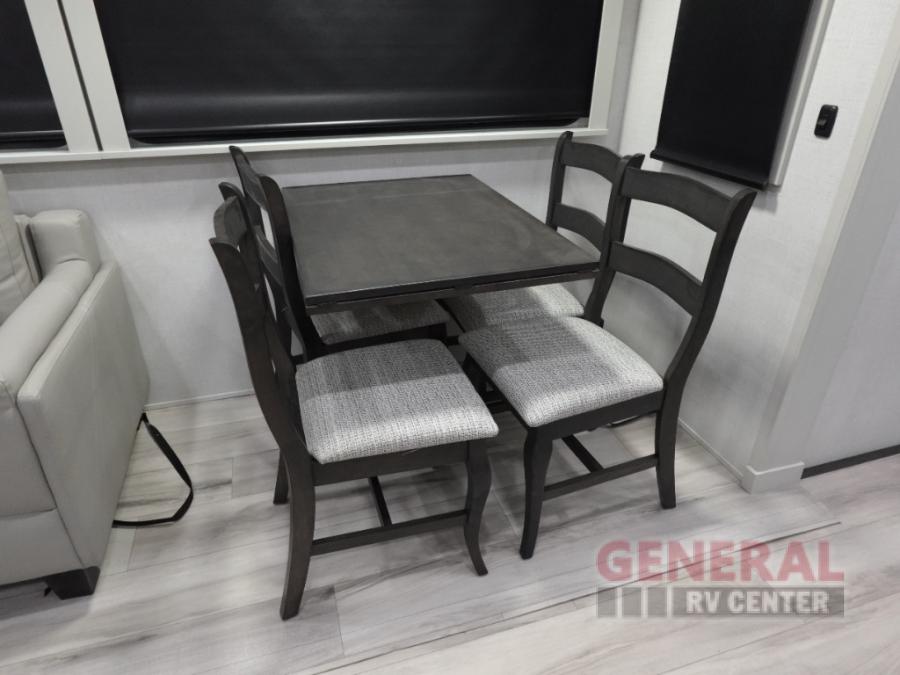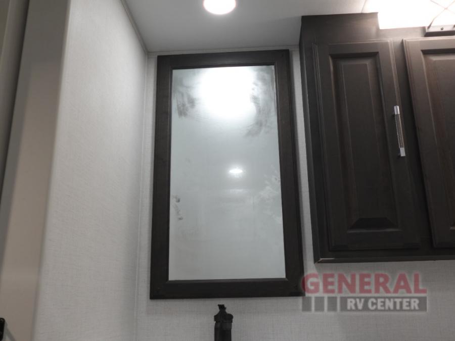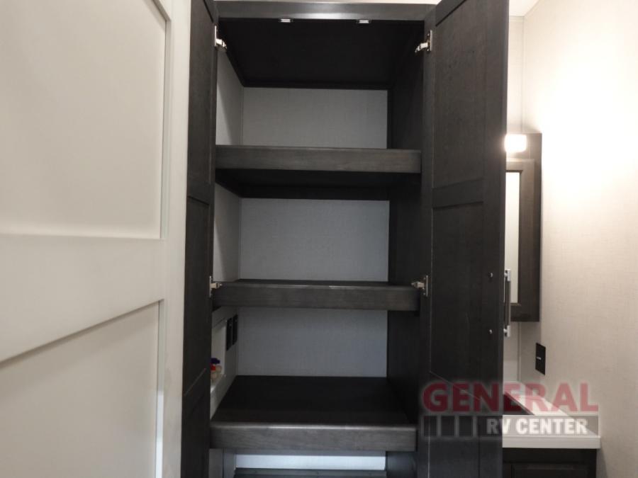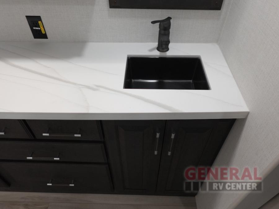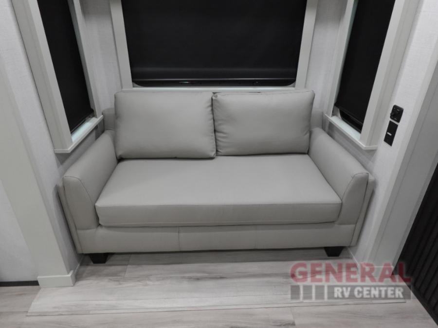 With a bath and a half, it's a clean decision to take this fifth wheel with you on your next camping trip! One of the dual entry doors leads directly into the rear kitchen which has a large pantry and an 18 cu. ft. residential refrigerator to store your food items. The free standing dinette and tri-fold sofa sleeper slide and opposing tri-fold sofa sleeper slide opens up the middle living area for more interior space. The half bathroom is conveniently located straight in through the main entry and features washer and dryer prep for clean clothes throughout your entire trip. The master suite not only has a king bed slide with storage underneath and a bench next to a dresser, but also access into the front full bathroom which has a dual sink vanity, a shower with a seat, and a toilet with privacy walls!
