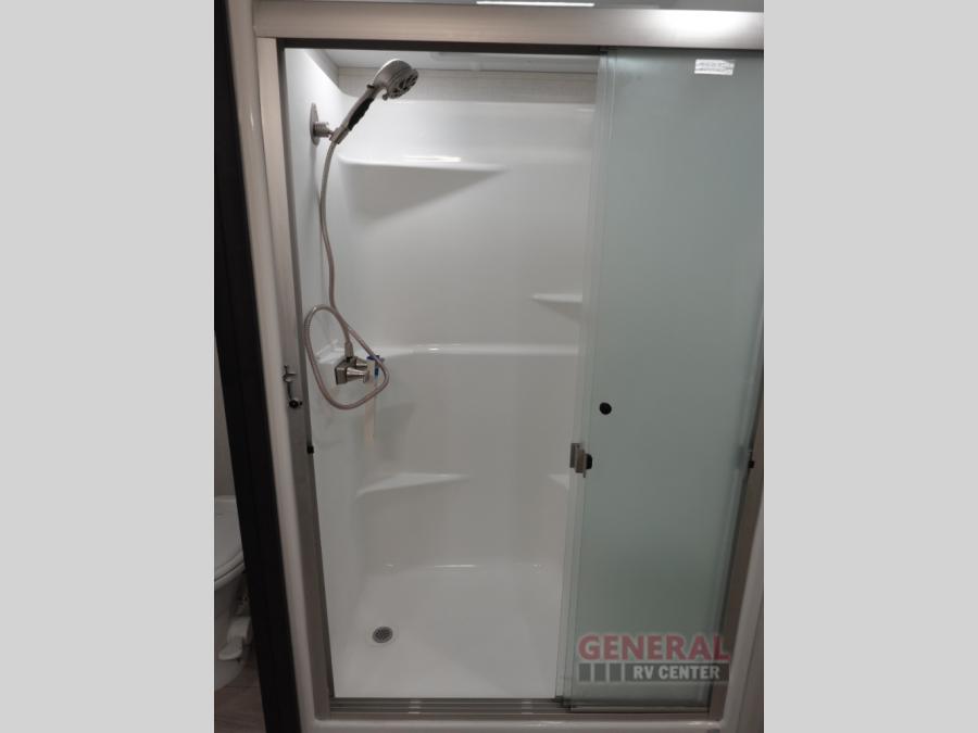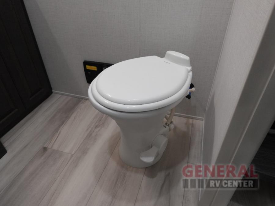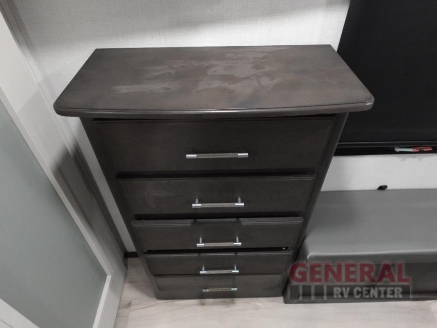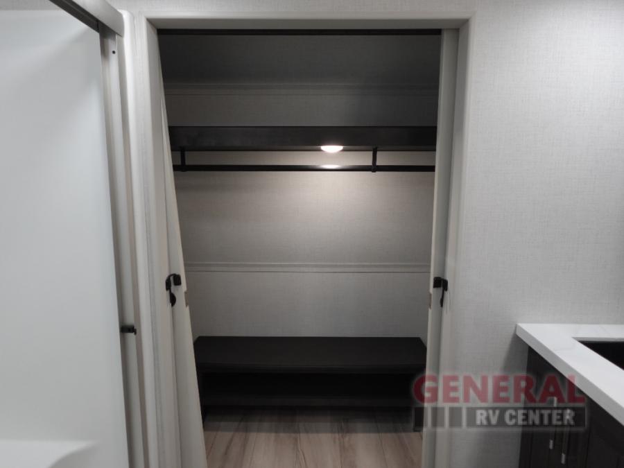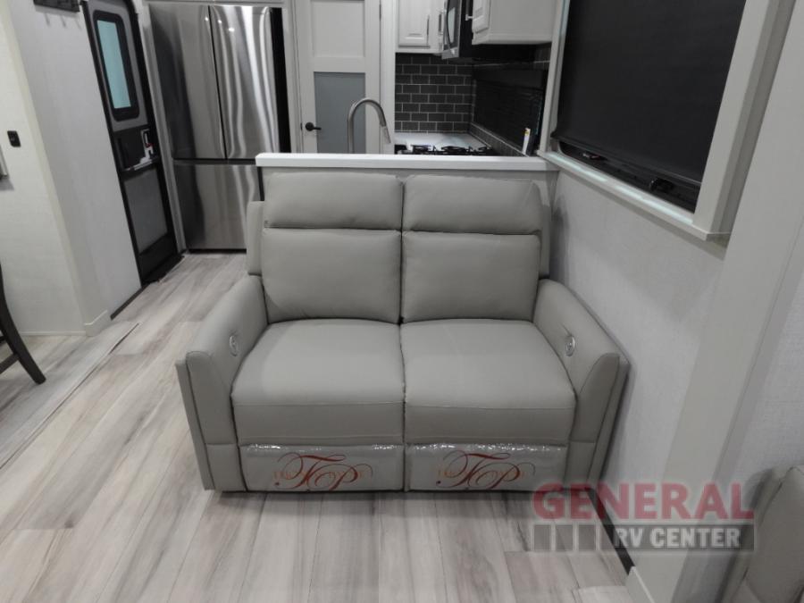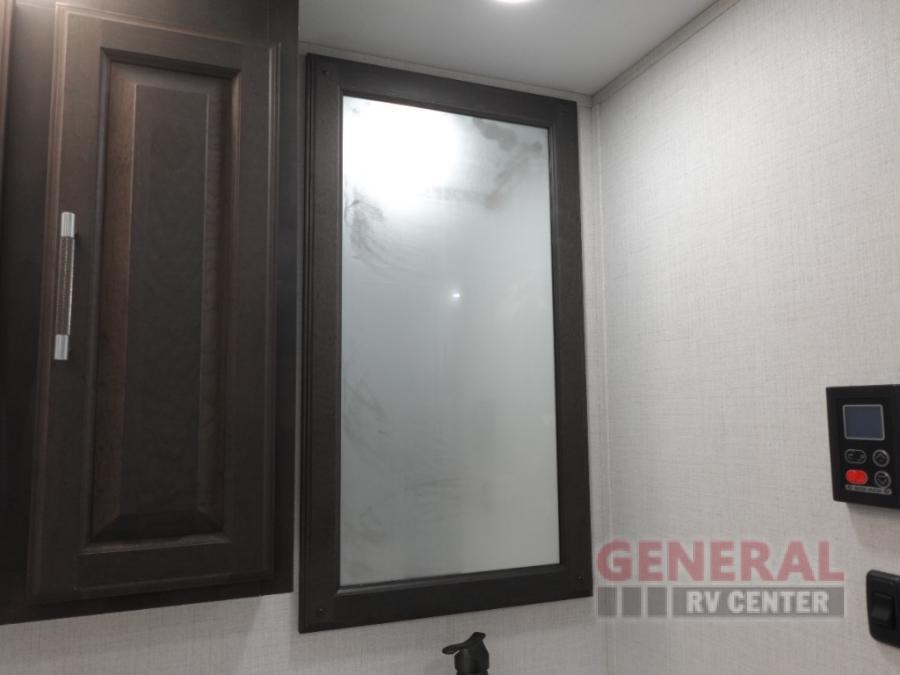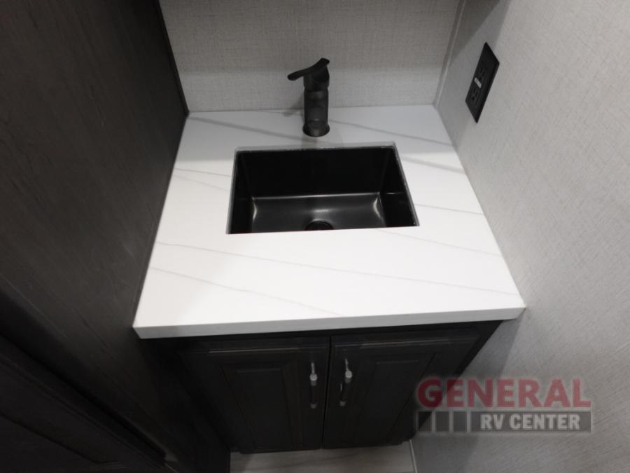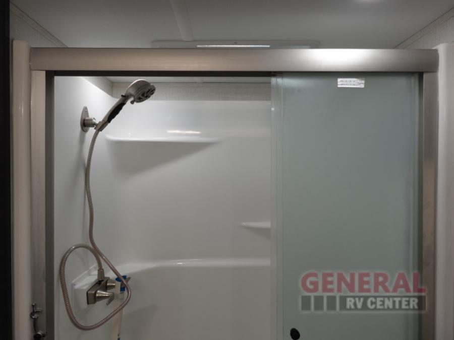 With a bath and a half, it's a clean decision to take this fifth wheel with you on your next camping trip! One of the dual entry doors leads directly into the rear kitchen which has a large pantry and an 18 cu. ft. residential refrigerator to store your food items. The free standing dinette and tri-fold sofa sleeper slide and opposing tri-fold sofa sleeper slide opens up the middle living area for more interior space. The half bathroom is conveniently located straight in through the main entry and features washer and dryer prep for clean clothes throughout your entire trip. The master suite not only has a king bed slide with storage underneath and a bench next to a dresser, but also access into the front full bathroom which has a dual sink vanity, a shower with a seat, and a toilet with privacy walls!
