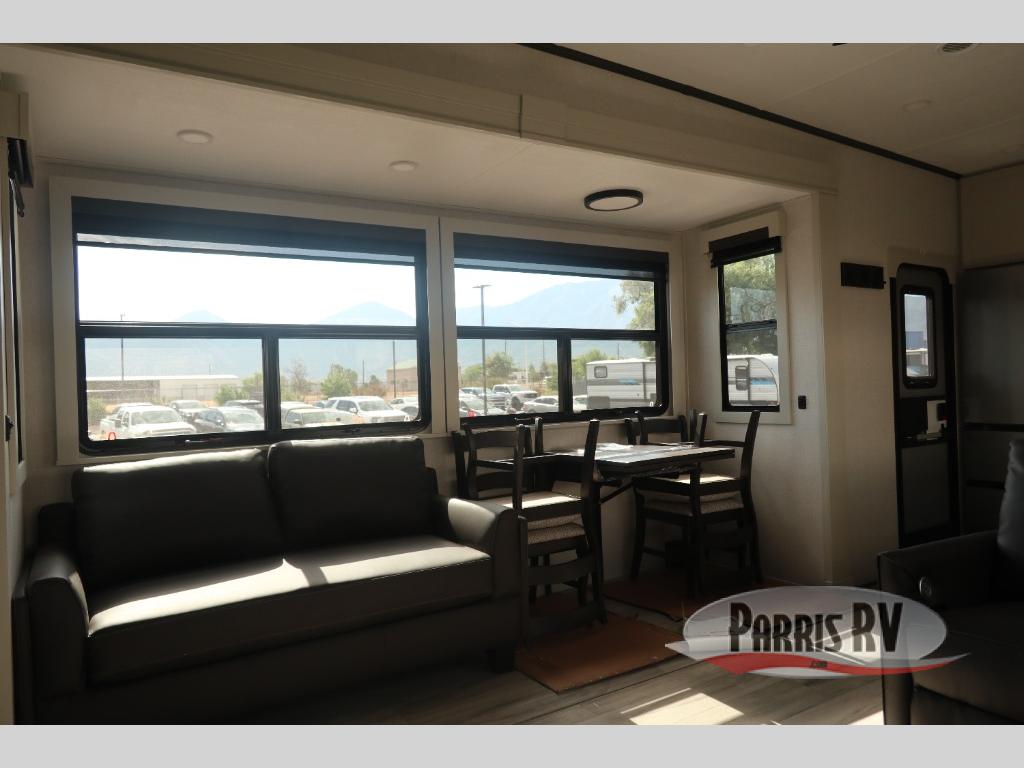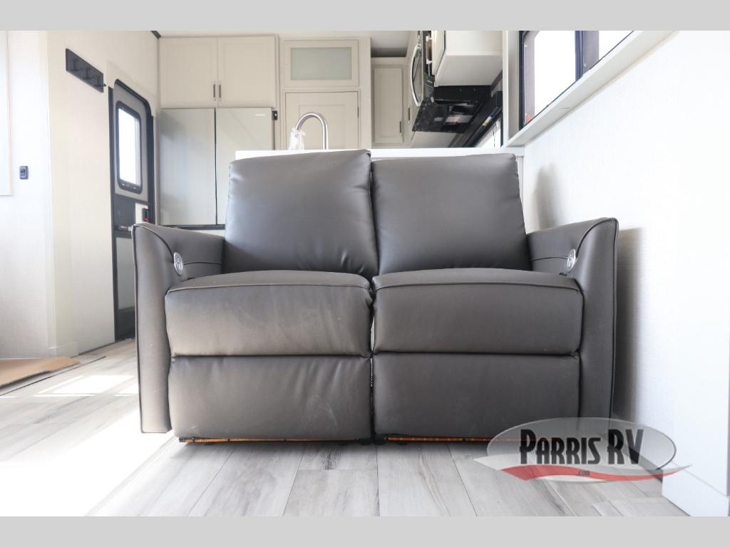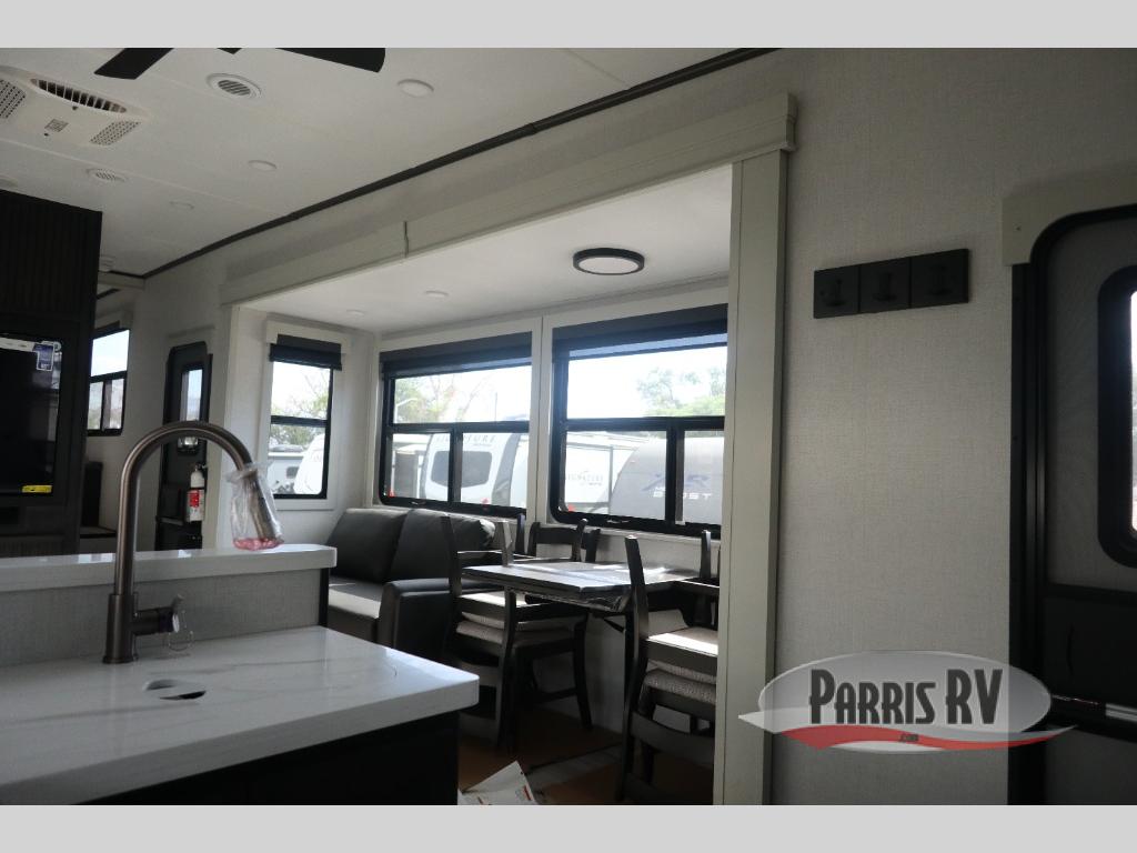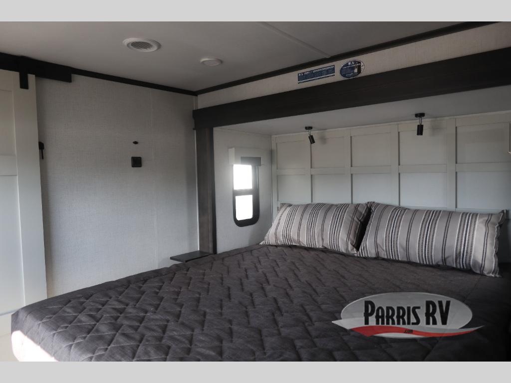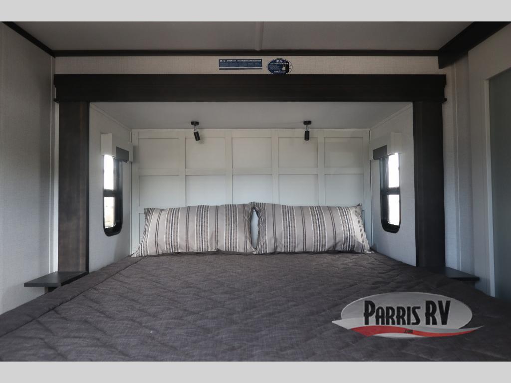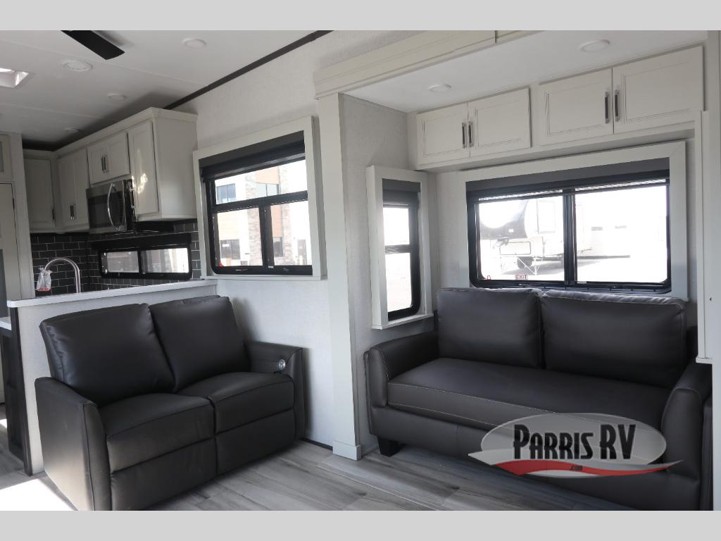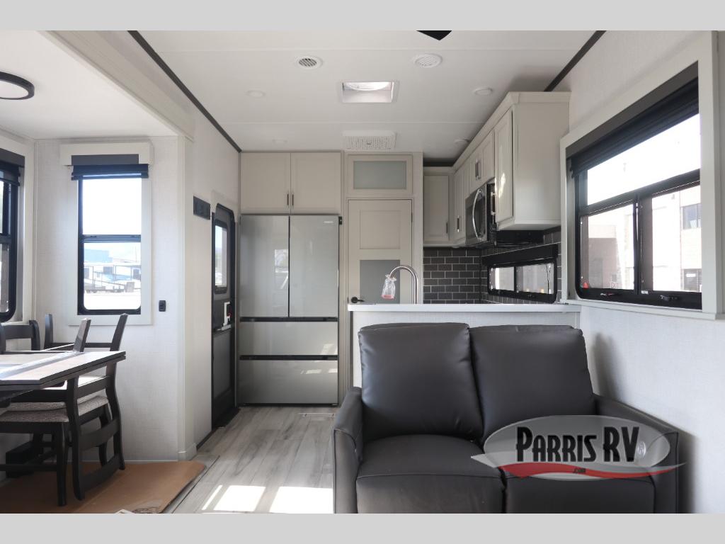 With a bath and a half, it's a clean decision to take this fifth wheel with you on your next camping trip! One of the dual entry doors leads directly into the rear kitchen which has a large pantry and an 18 cu. ft. residential refrigerator to store your food items. The free standing dinette and tri-fold sofa sleeper slide and opposing tri-fold sofa sleeper slide opens up the middle living area for more interior space. The half bathroom is conveniently located straight in through the main entry and features washer and dryer prep for clean clothes throughout your entire trip. The master suite not only has a king bed slide with storage underneath and a bench next to a dresser, but also access into the front full bathroom which has a dual sink vanity, a shower with a seat, and a toilet with privacy walls!