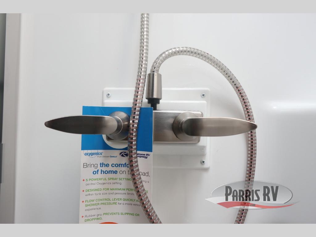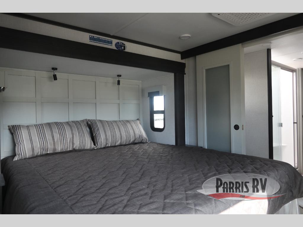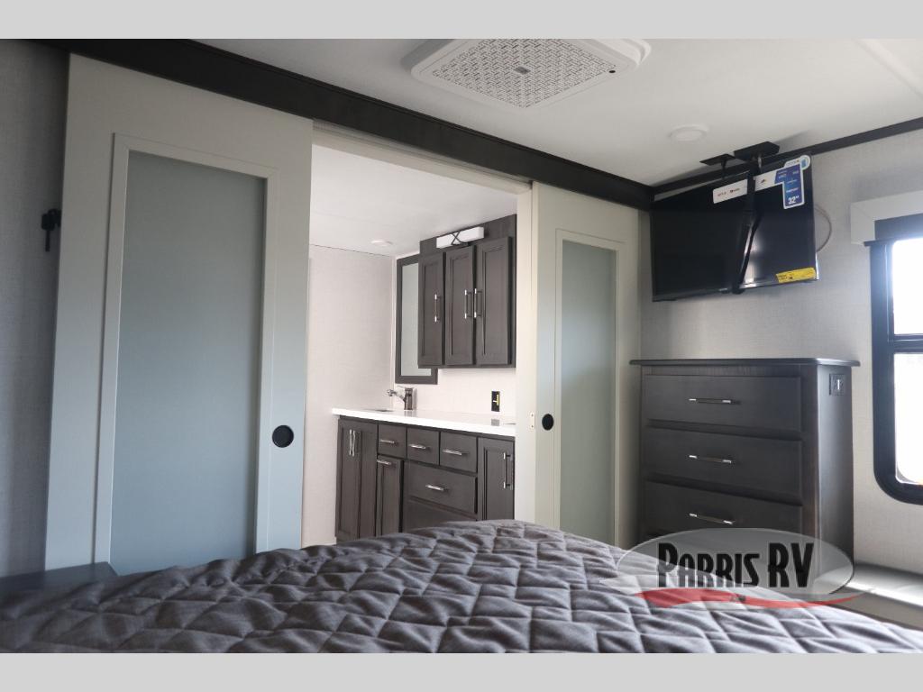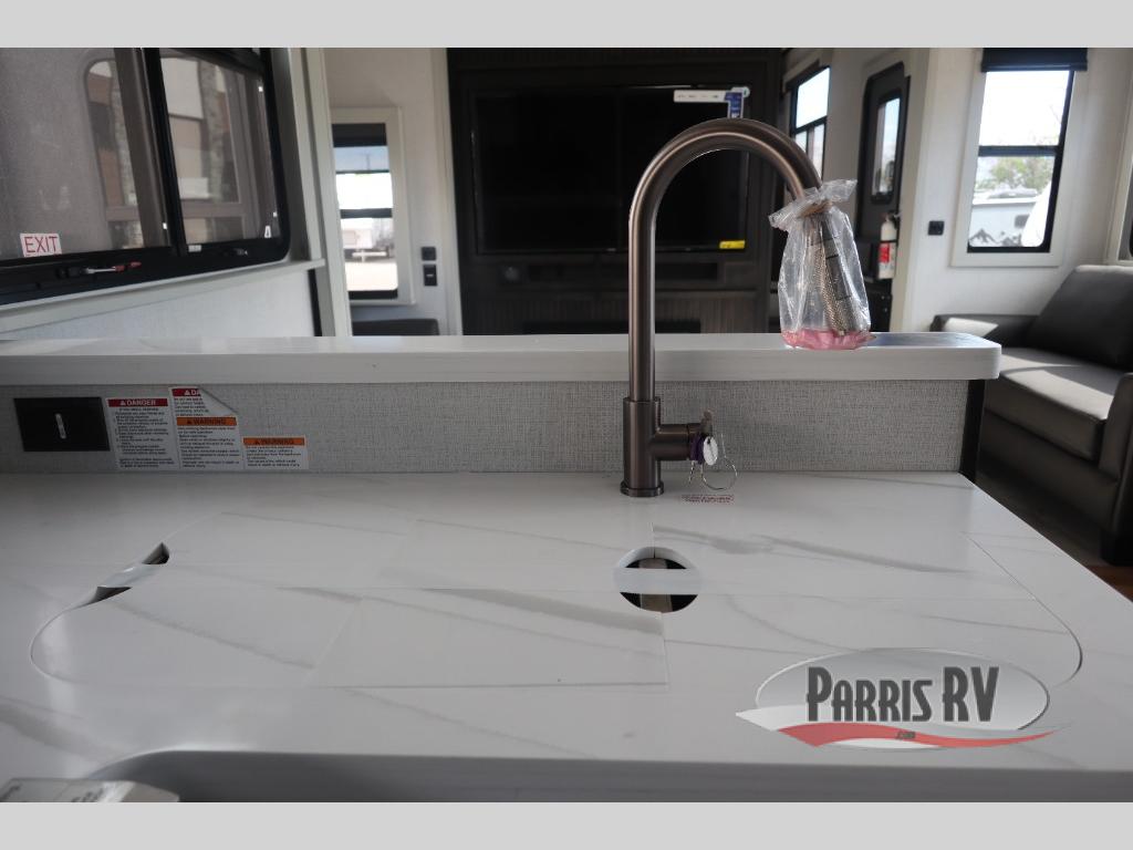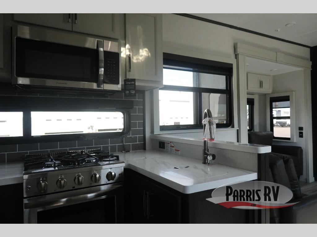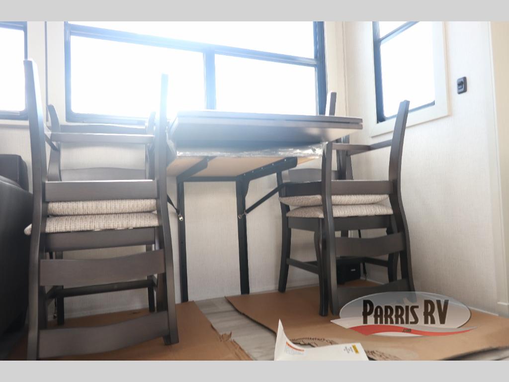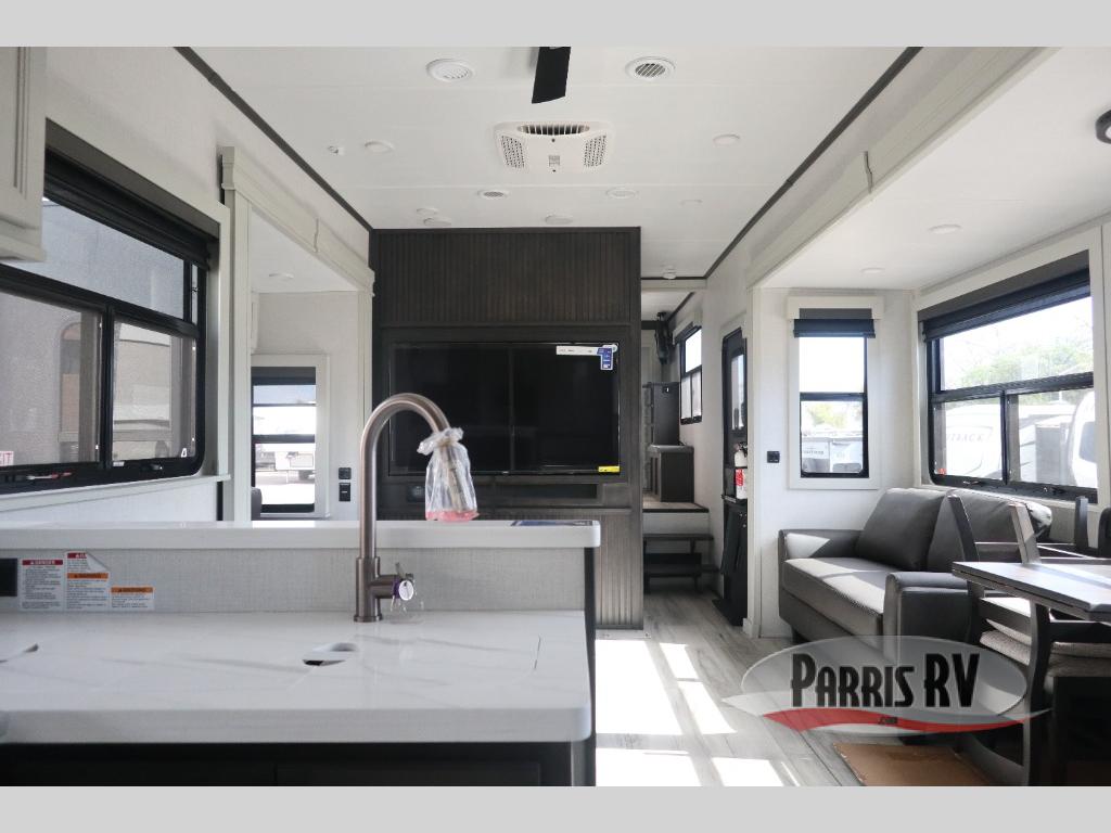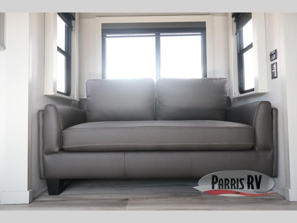 With a bath and a half, it's a clean decision to take this fifth wheel with you on your next camping trip! One of the dual entry doors leads directly into the rear kitchen which has a large pantry and an 18 cu. ft. residential refrigerator to store your food items. The free standing dinette and tri-fold sofa sleeper slide and opposing tri-fold sofa sleeper slide opens up the middle living area for more interior space. The half bathroom is conveniently located straight in through the main entry and features washer and dryer prep for clean clothes throughout your entire trip. The master suite not only has a king bed slide with storage underneath and a bench next to a dresser, but also access into the front full bathroom which has a dual sink vanity, a shower with a seat, and a toilet with privacy walls!