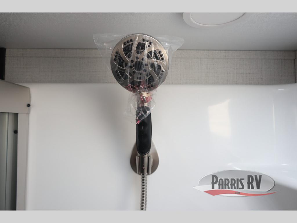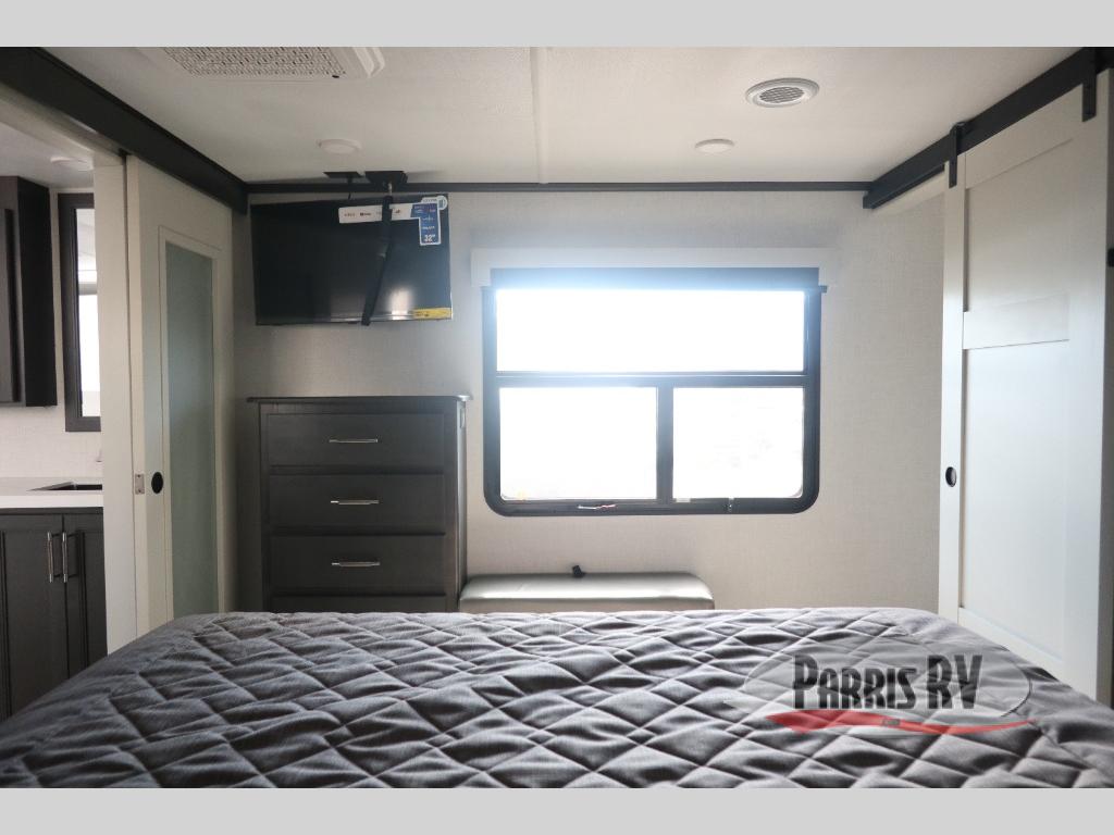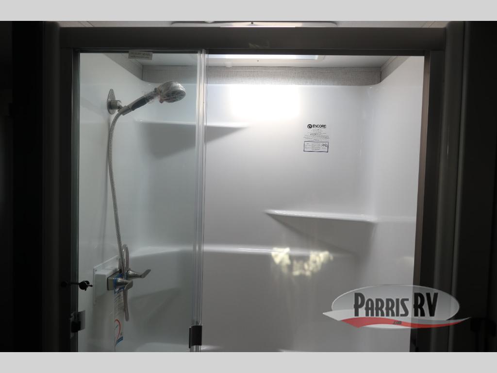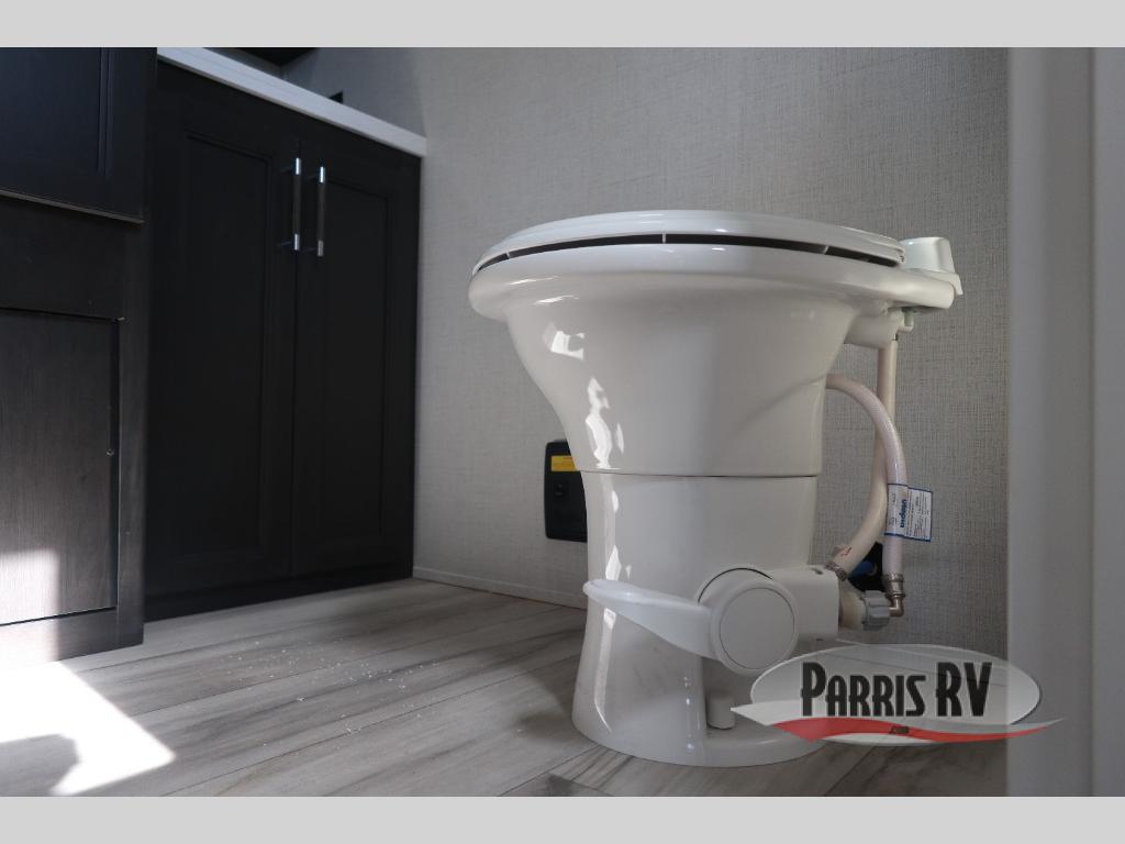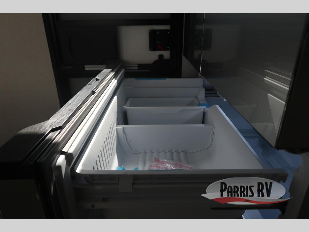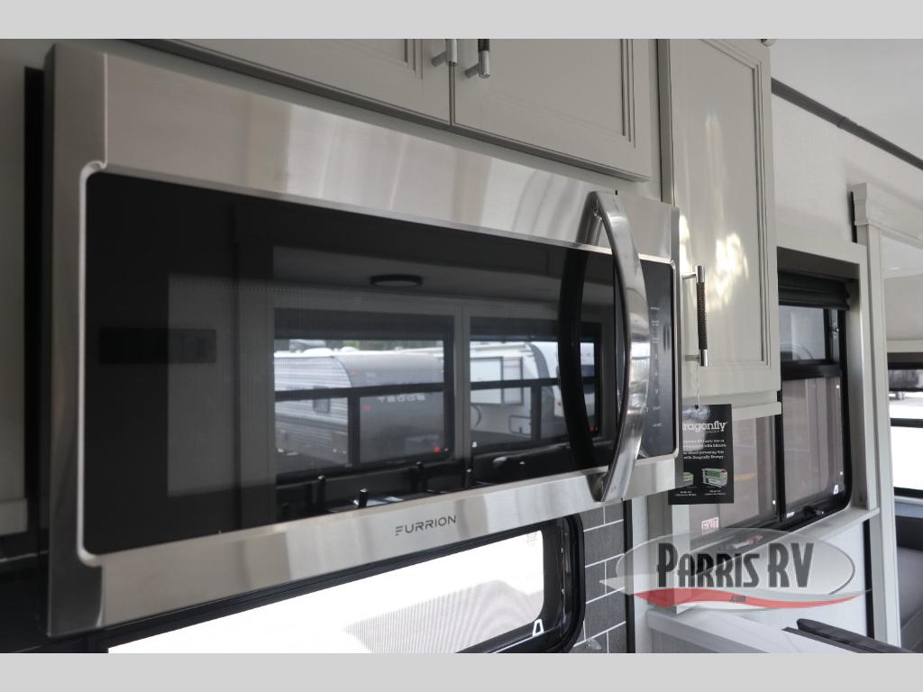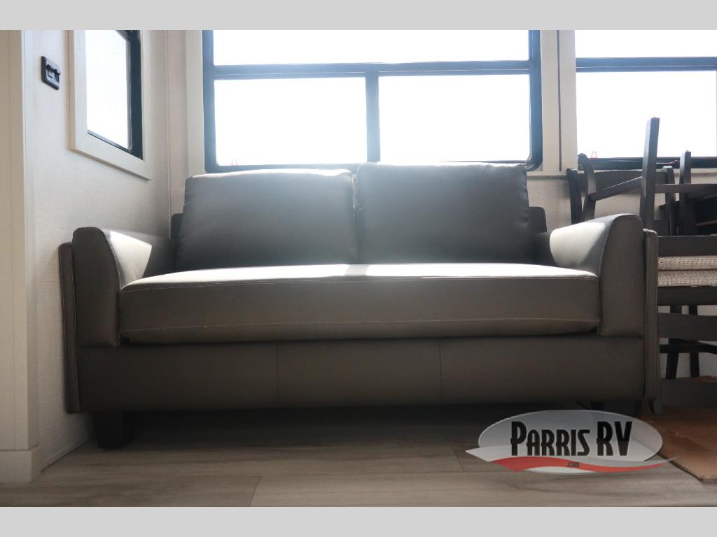 With a bath and a half, it's a clean decision to take this fifth wheel with you on your next camping trip! One of the dual entry doors leads directly into the rear kitchen which has a large pantry and an 18 cu. ft. residential refrigerator to store your food items. The free standing dinette and tri-fold sofa sleeper slide and opposing tri-fold sofa sleeper slide opens up the middle living area for more interior space. The half bathroom is conveniently located straight in through the main entry and features washer and dryer prep for clean clothes throughout your entire trip. The master suite not only has a king bed slide with storage underneath and a bench next to a dresser, but also access into the front full bathroom which has a dual sink vanity, a shower with a seat, and a toilet with privacy walls!