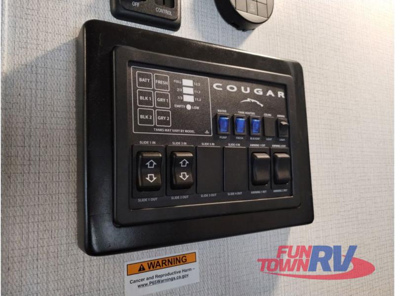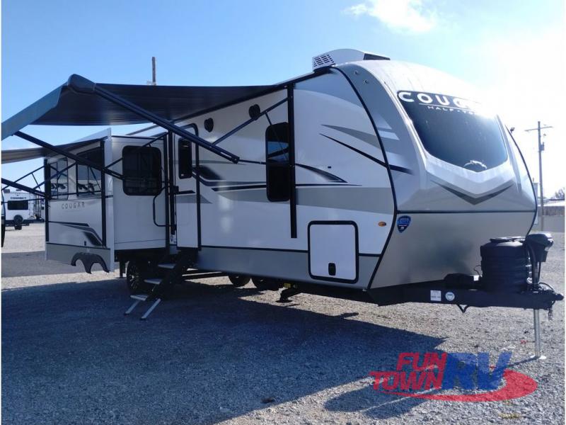 The Keystone Cougar Half-Ton fifth wheel and travel trailers are known as one of America's favorites for a reason! Some of those reasons are the exclusive features that come from Keystone, like the Winegard Air 360+ omni-directional rooftop antenna, the in-floor heating ducts, and the Hyper Deck flooring. The Cougar Half-Ton has a Climate Guard protection package to keep you safe during inclement weather, along with two roof attic vents, PEX plumbing and more. Use the 21" Furrion range with Piezo ignition to create all of those familiar meals from home, and enjoy endless hot showers with the Girard tankless on-demand water heater!