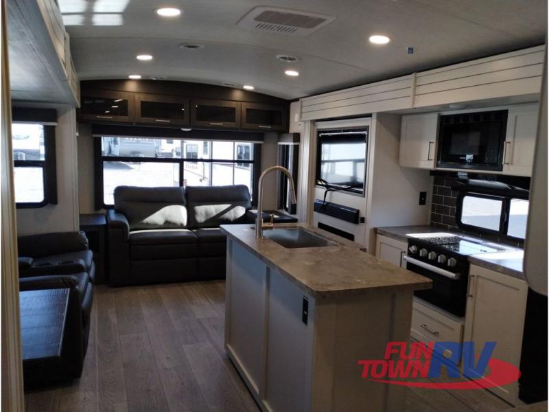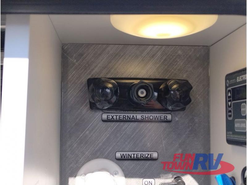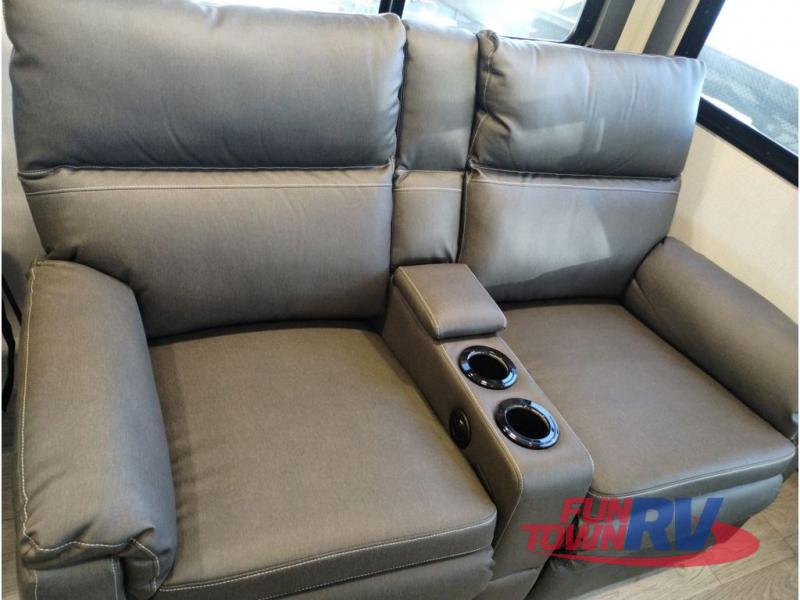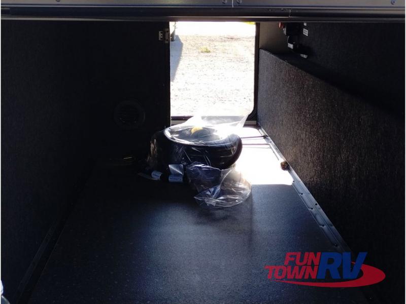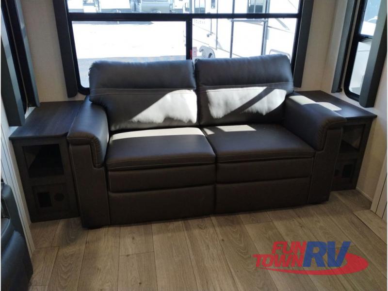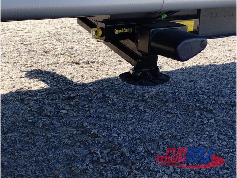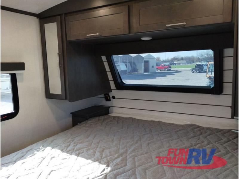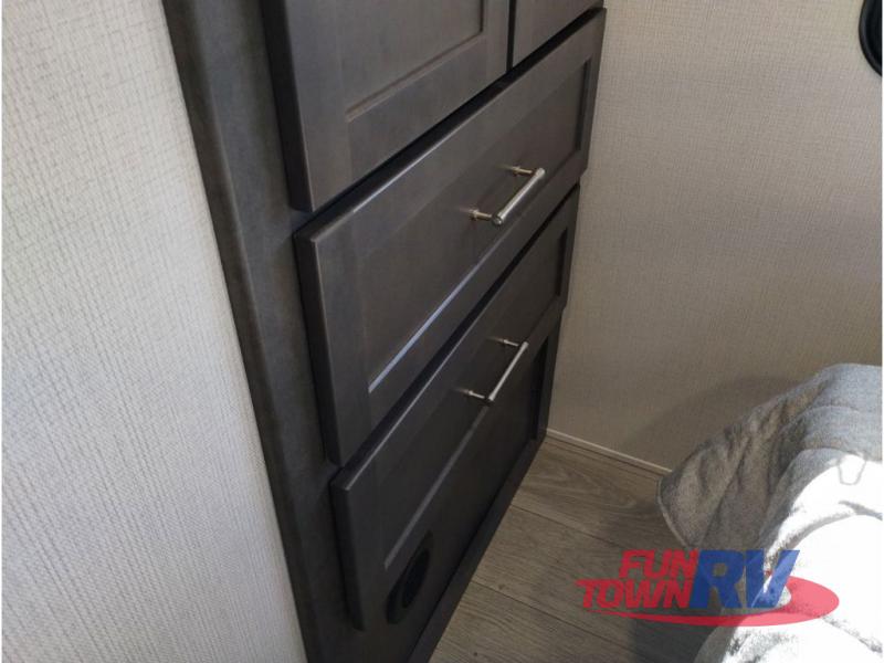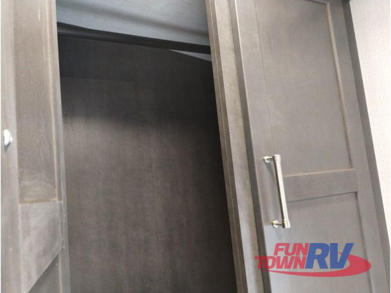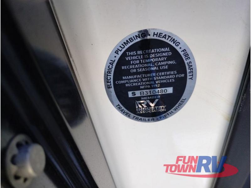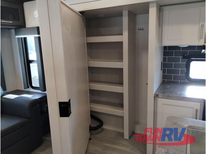 Trips spent in this travel trailer are sure to bring memories! The dual opposing slides in the combined kitchen and living area provide your crew with plenty of space to relax on the theater seating, dine at the dinette table, and prep meals with the kitchen island. There is also a tri-fold sleeper sofa here for guests and a pivoting entertainment center with a hidden pantry to keep snacks stocked. And a second pantry and hutch provides even more storage! You'll love having your own private bedroom up front, complete with a king bed, dual bedside drawers and nightstands and additional storage drawers to keep your space tidy. Outside, you'll find two power awnings, a 2" accessory hitch, and a drop frame pass-thru storage for fishing poles, hiking gear, and more!