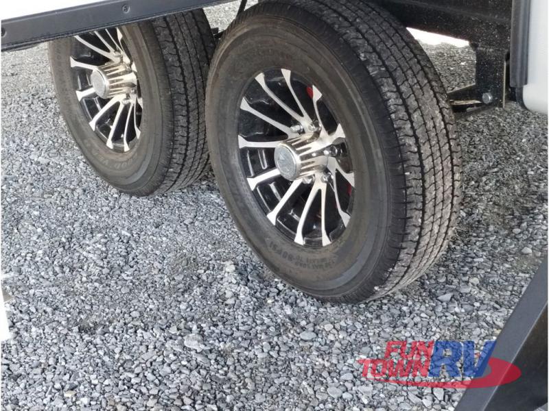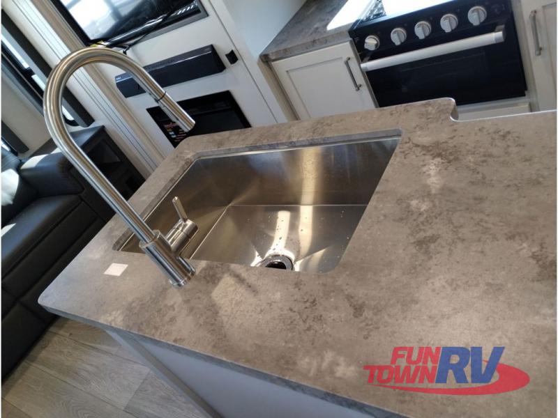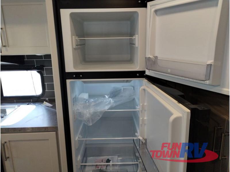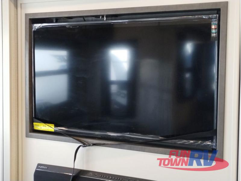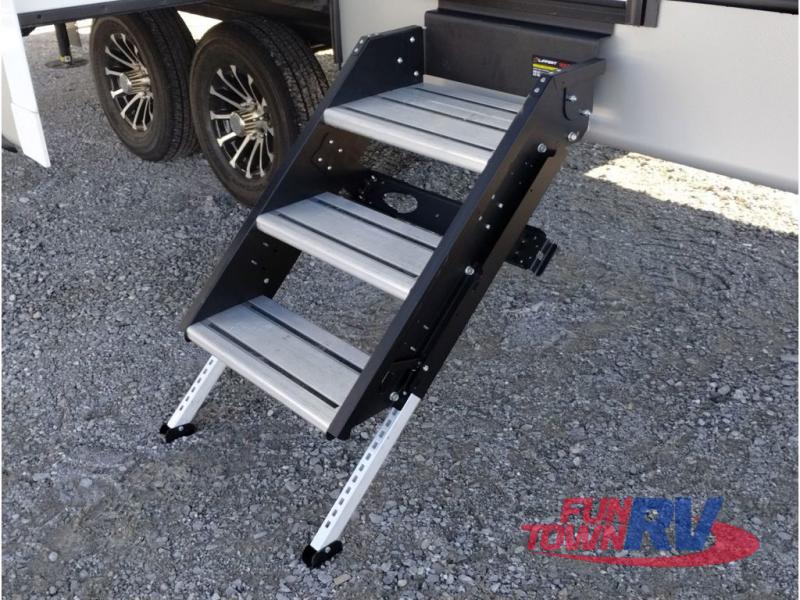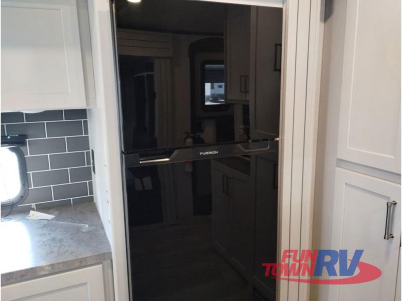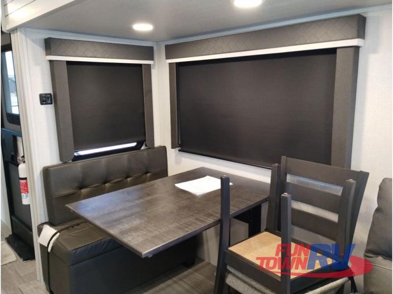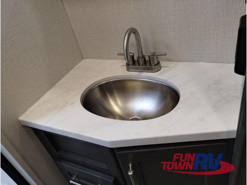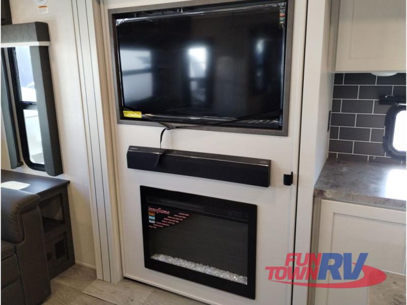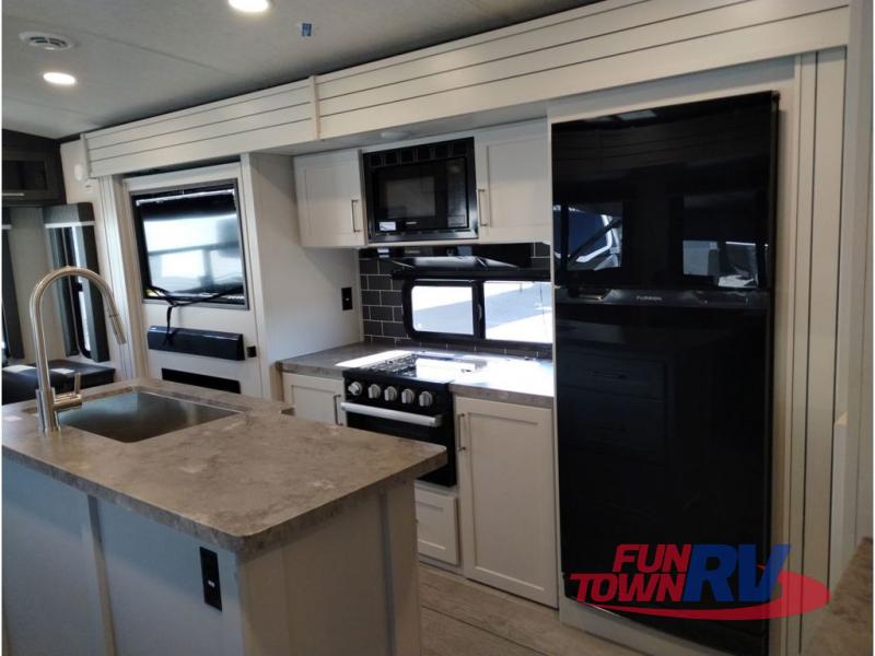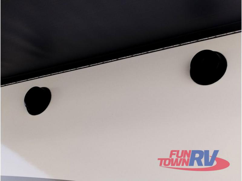 Trips spent in this travel trailer are sure to bring memories! The dual opposing slides in the combined kitchen and living area provide your crew with plenty of space to relax on the theater seating, dine at the dinette table, and prep meals with the kitchen island. There is also a tri-fold sleeper sofa here for guests and a pivoting entertainment center with a hidden pantry to keep snacks stocked. And a second pantry and hutch provides even more storage! You'll love having your own private bedroom up front, complete with a king bed, dual bedside drawers and nightstands and additional storage drawers to keep your space tidy. Outside, you'll find two power awnings, a 2" accessory hitch, and a drop frame pass-thru storage for fishing poles, hiking gear, and more!