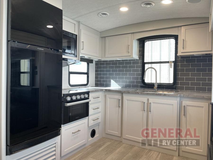 How does a queen bed slide with an optional king bed in the master suite sound? With this Cougar Half-Ton travel trailer, you'll have extra floor space and a full-width wardrobe allowing you to stay at your favorite campsite for long periods of time. The second slide located in the main living and kitchen area opens up this space for you to enjoy time spent inside just as much as outdoor adventures. The furniture even doubles as sleeping space for the kids or overnight guests. The rear kitchen layout is a convenience, and you will appreciate all the counter space for preparing and serving meals. You will find hidden storage behind the entertainment center, and next to the entertainment center is a pantry where you can store your favorite snacks.