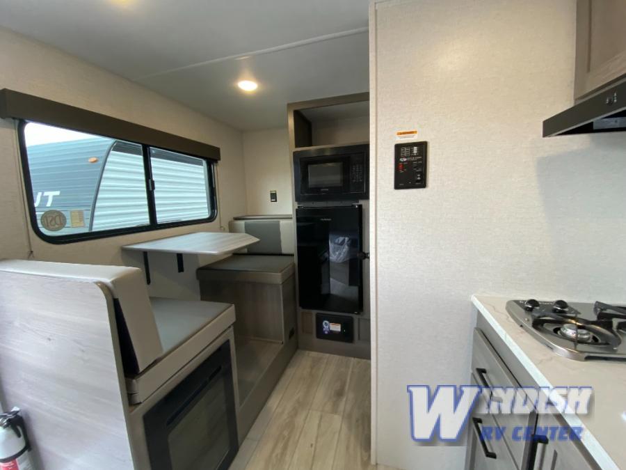 This lightweight travel trailer is perfect for three happy campers. You'll enjoy the front full-size bed, while your guest or little ones take the booth dinette when it's not being used to dine at. There is also a shelf above the bed to keep your things organized. A private bath includes a shower with a toilet so you can freshen up each day without having to leave your camper. You can make your meals on the two burner gas cooktop or in the microwave oven, then take your plate outdoors to eat under the 8' power awning!