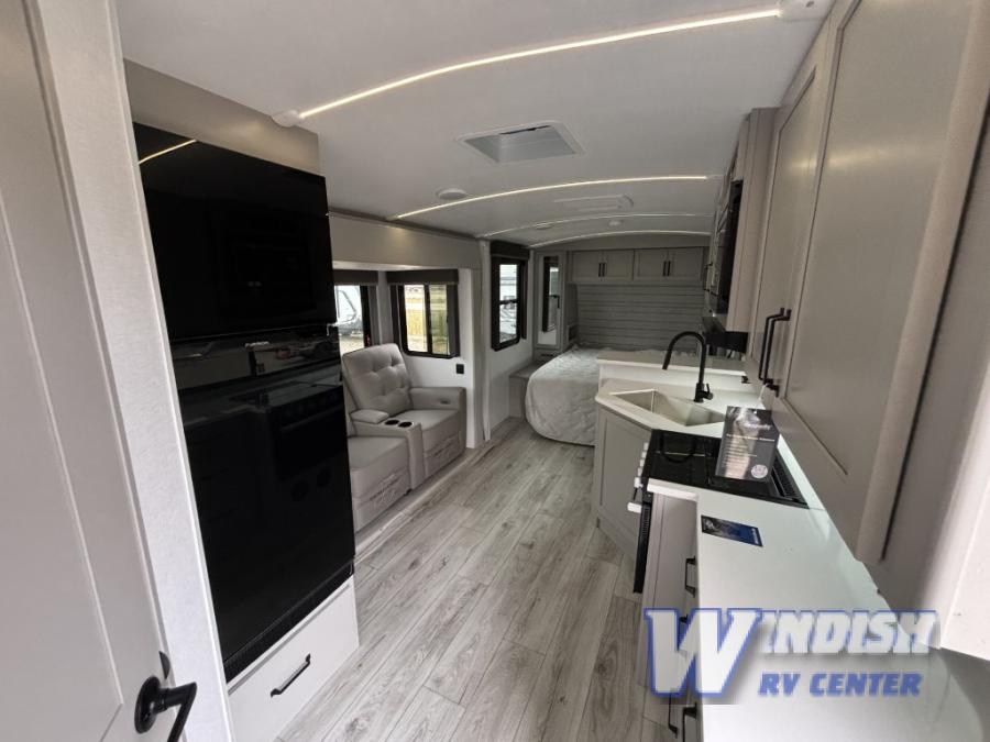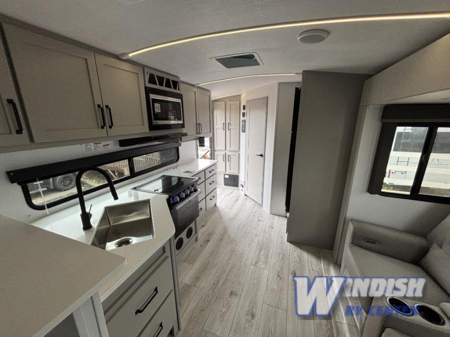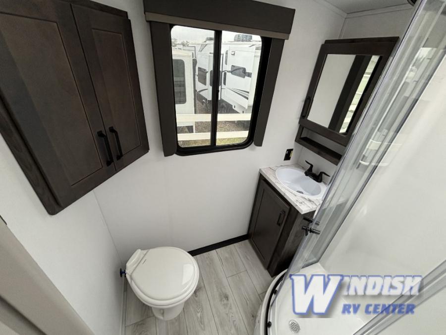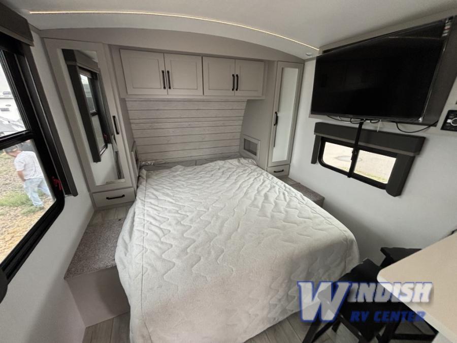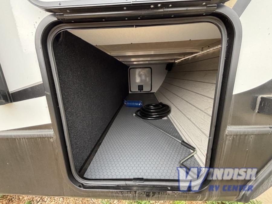 This single slide out travel trailer is perfect for the group of four looking for adventure. There is a queen bed up front with dual wardrobe nightstands, a TV, and a laundry chute that lets you throw dirty clothes straight into the pass-thru storage. The Do-More U-shaped dinette will be perfect for game night, dining, and extra sleeping space for guests. A full kitchen includes a three burner gas range and microwave oven to cook meals, along with a 10 cu. ft. 12V refrigerator for food storage. There is also an entryway pantry/closet for even more storage. And everyone can freshen up in the rear corner bath each day instead of using the camp's facilities!