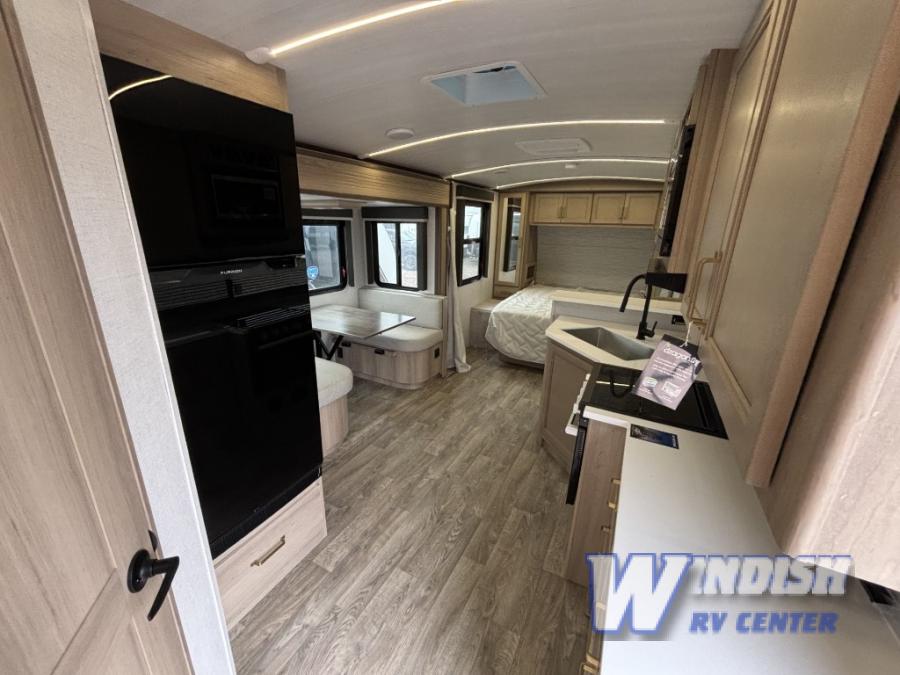This single slide out travel trailer is perfect for the group of four looking for adventure. There is a queen bed up front with dual wardrobe nightstands, a TV, and a laundry chute that lets you throw dirty clothes straight into the pass-thru storage. The Do-More U-shaped dinette will be perfect for game night, dining, and extra sleeping space for guests. A full kitchen includes a three burner gas range and microwave oven to cook meals, along with a 10 cu. ft. 12V refrigerator for food storage. There is also an entryway pantry/closet for even more storage. And everyone can freshen up in the rear corner bath each day instead of using the camp's facilities!