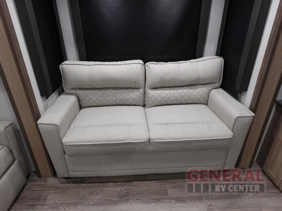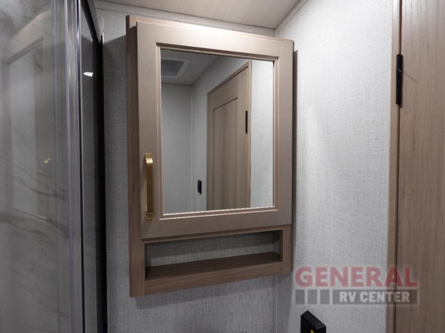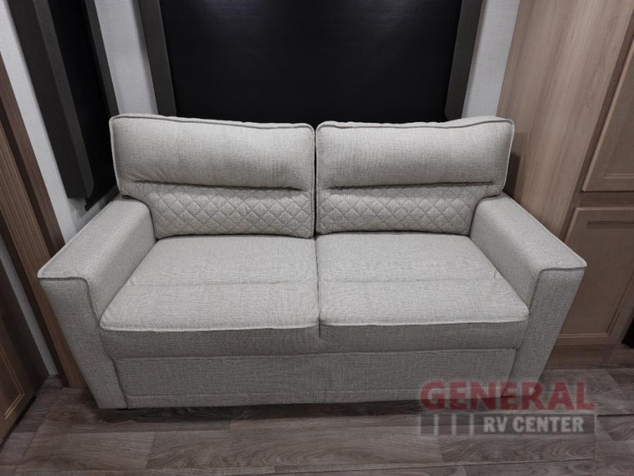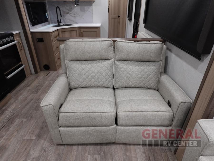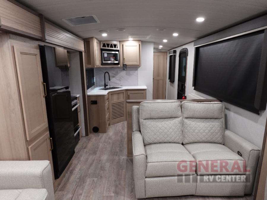With a rear entertainment center including a 55" HDTV with fireplace below, and dual sofa sleeper slides, you will enjoy a spacious living area to visit with friends while you sit on the theater seats. The middle kitchen offers full amenities including a pantry and 10 cu. ft. refrigerator to store lots of food to feed everyone. The bench dinette seating allows you to dine or work in this area. Everyone will appreciate easy access to the double entry bathroom, especially you when it's nighttime and you are sleeping on the king bed slide out. Your family pet will have their own space, and you will find plenty of storage choices, plus there is washer/dryer prep if you want to the option to make laundry day easier.
