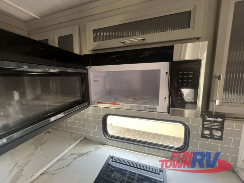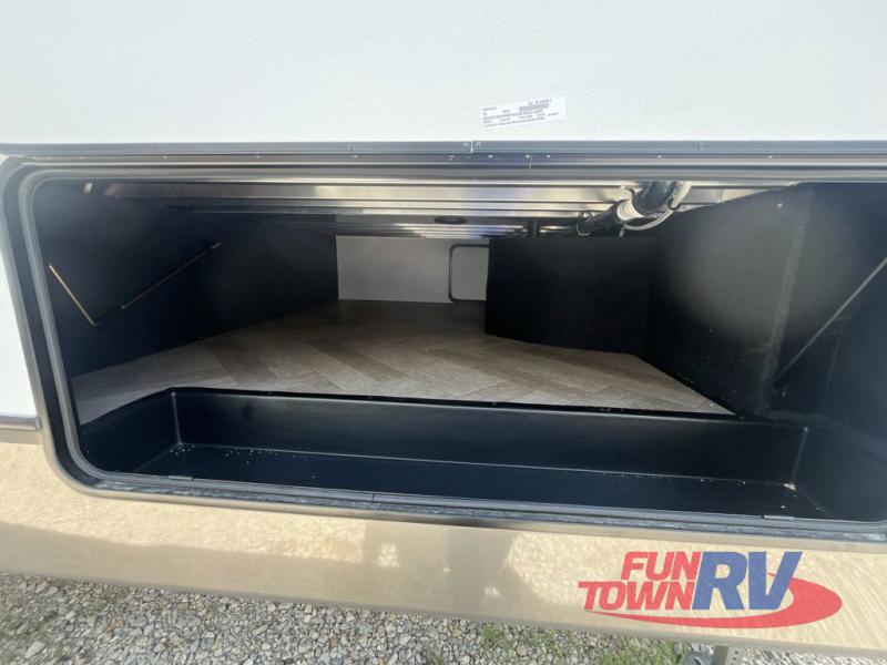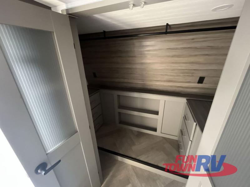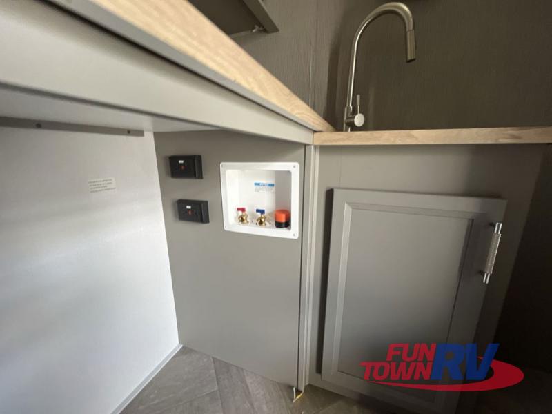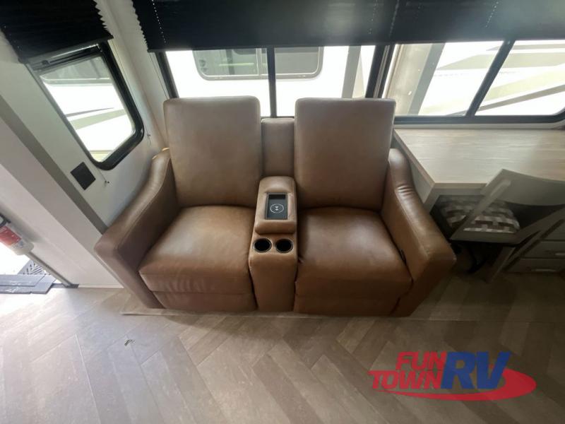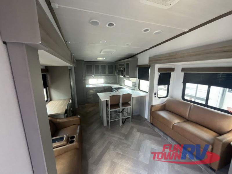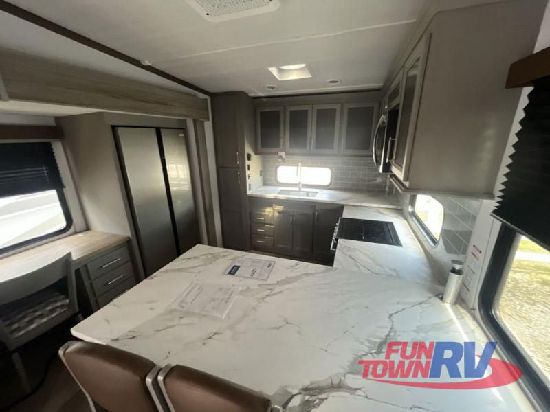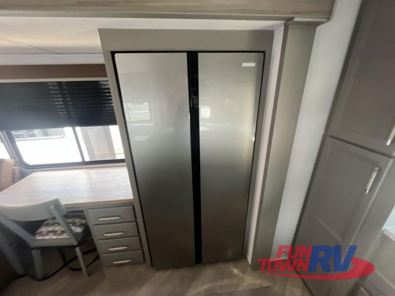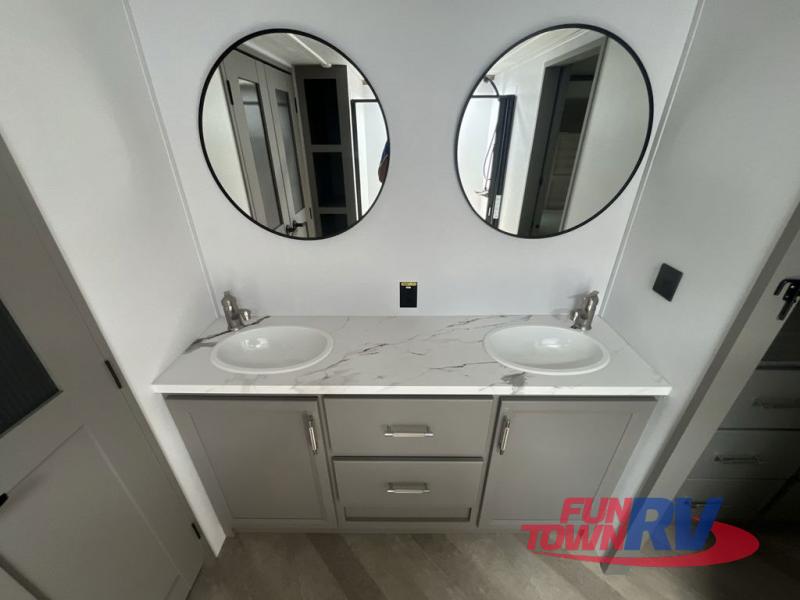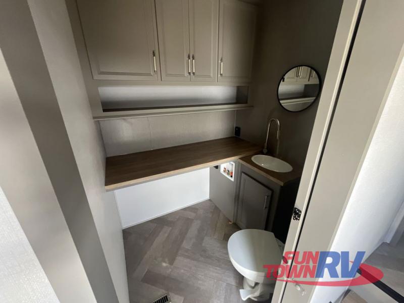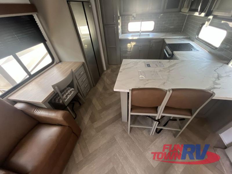 There is much to love about this fifth wheel! Starting with the front full bathroom which has a dual sink vanity for two to get ready at once and heading to the rear kitchen where you will have everything you need to prepare the best home cooked meals. There are also three bar stools at the bar top so guests can socialize with the cook. If you need to get a little work done while you're away, then you can easily get it done at the desk with chair next to the reclining theater seating and the 16 cu. ft. refrigerator for quick access to a snack break. The private bedroom has a king bed slide to lay your head on at night, and if you need an extra sleeping space then you can utilize the sofa slide too. Inside the half bathroom is a countertop with an area prepped for a washer and dryer to be added so you can enjoy clean clothes throughout your entire trip!