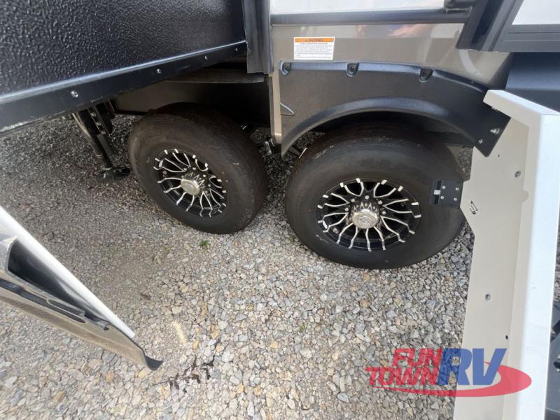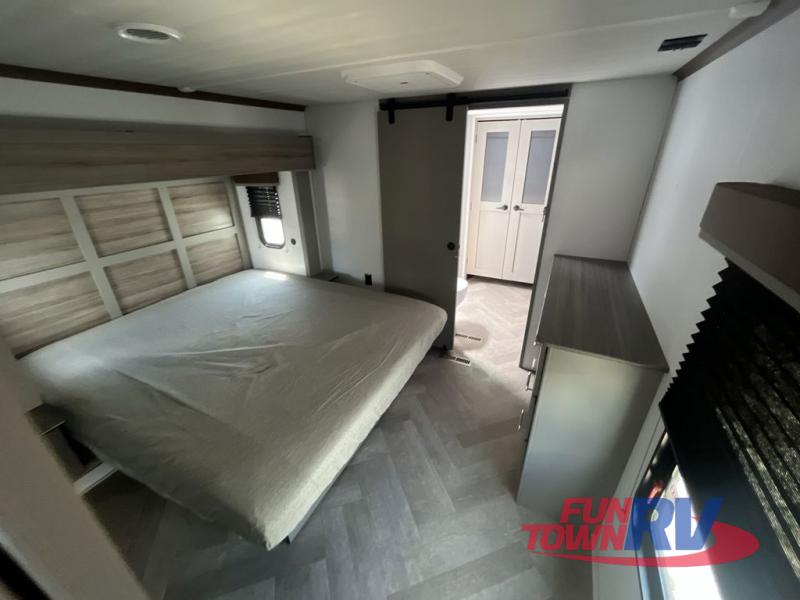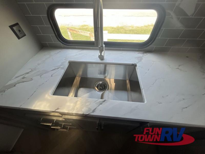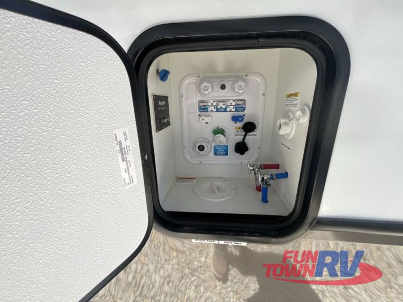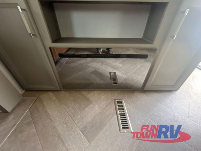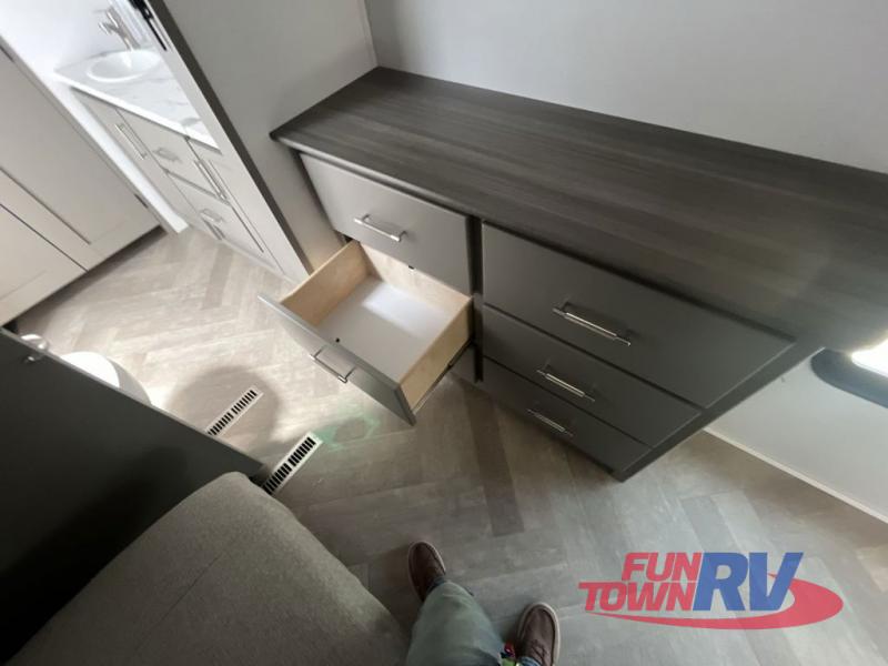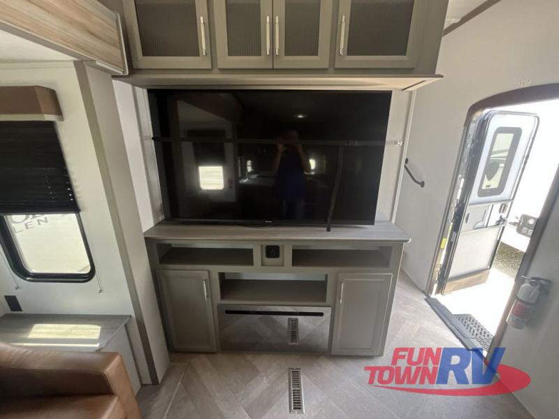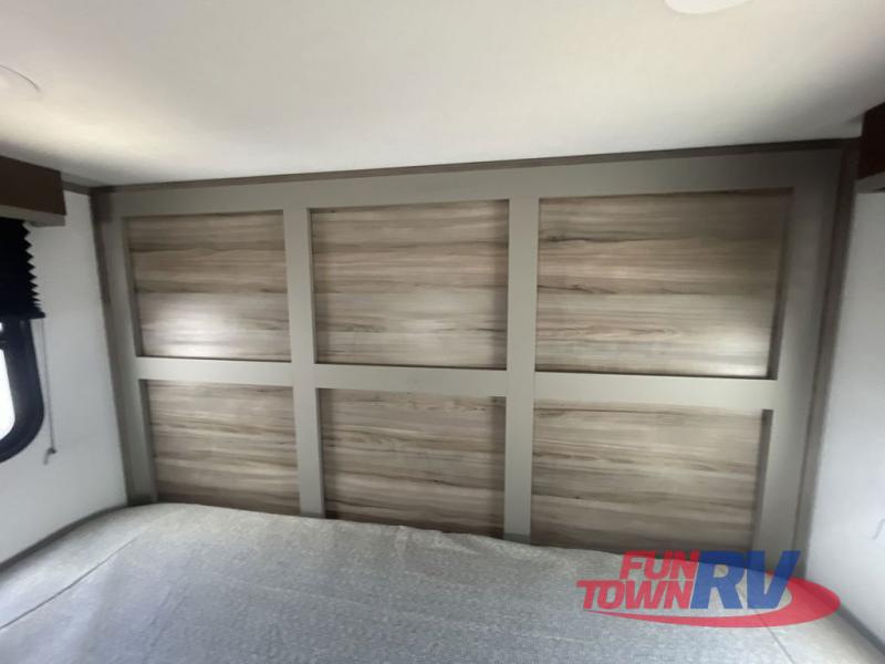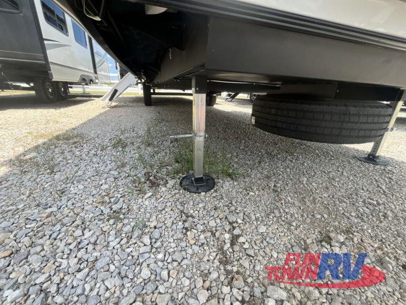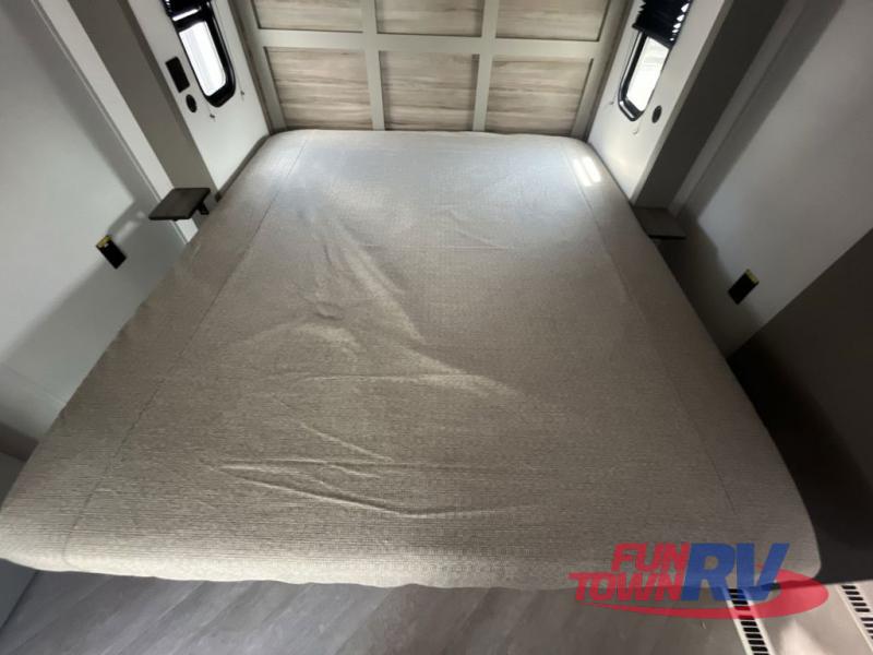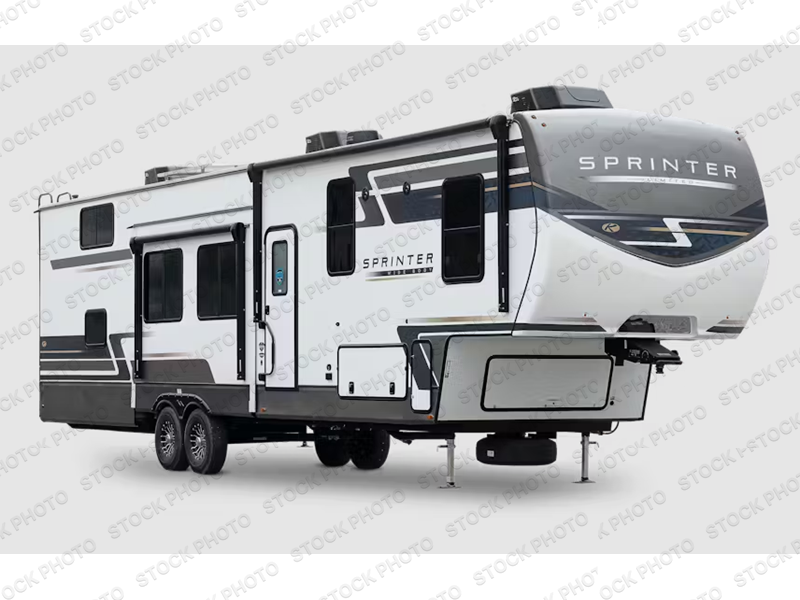 The Sprinter fifth wheels by Keystone feature spacious living areas, plenty of storage, and outstanding towability. Each unit is constructed with 2" aluminum framed and laminated sidewalls, a fully walkable roof, and dual layer insulation to help extend your camping season. The heated pass-through storage includes lockable slam latch baggage doors so you can easily pack your gear, and the one-touch 4-point leveling system features return hookup memory to have you set up in no-time. Head inside to find Congoleum vinyl flooring, Thomas Payne luxury collection furniture, residential style seamless marbled countertops, and an upgraded bedspread to name a few comforts. The Sprinter also includes a Girard tankless on-demand water heater, a central command center, plus a 30k BTU furnace and two A/C units to ensure your comfort!