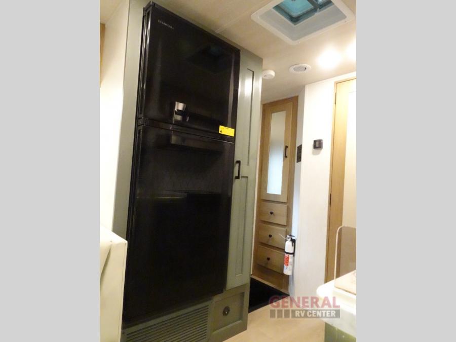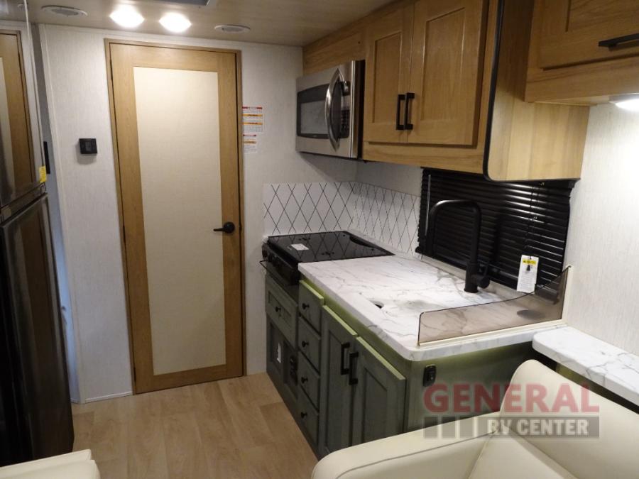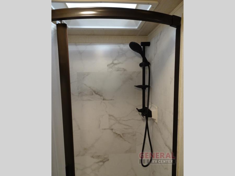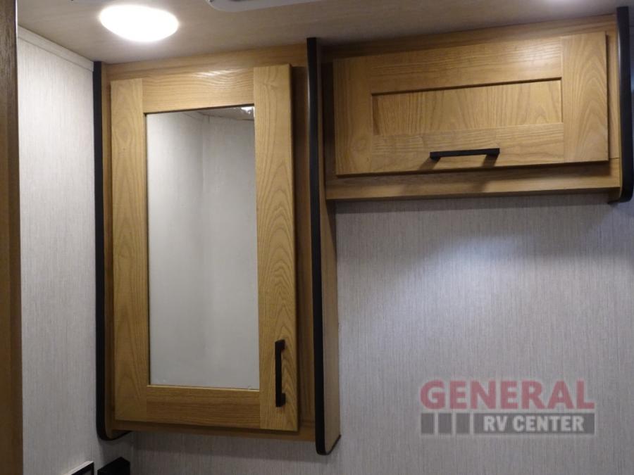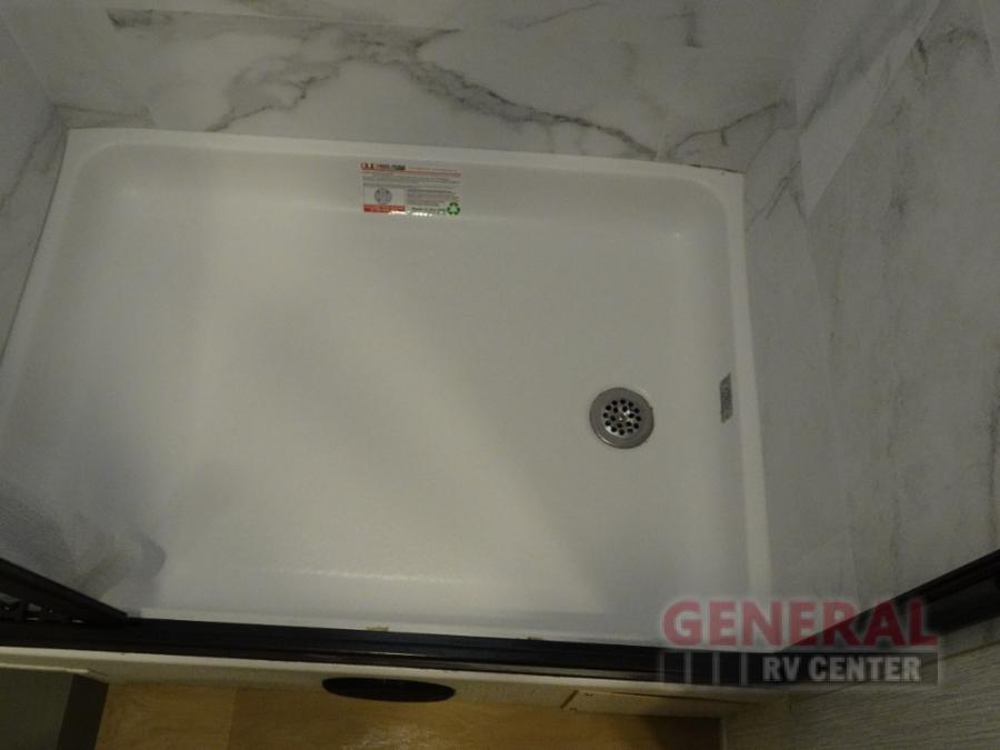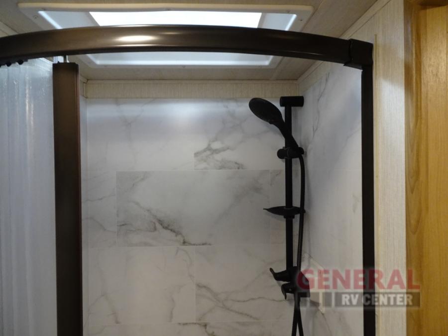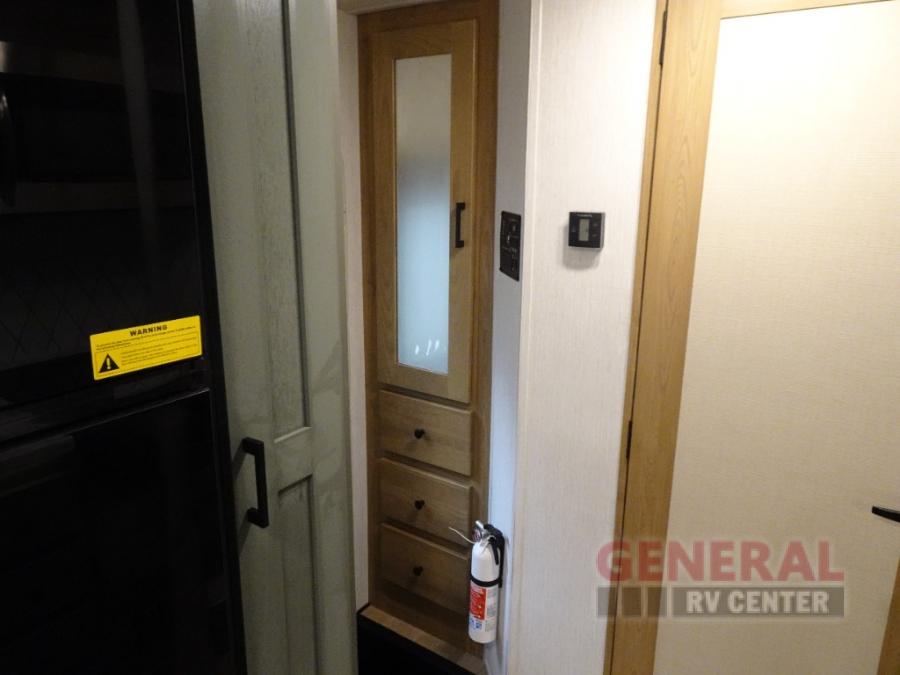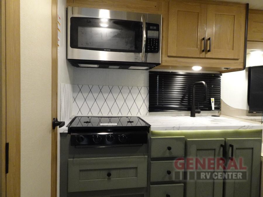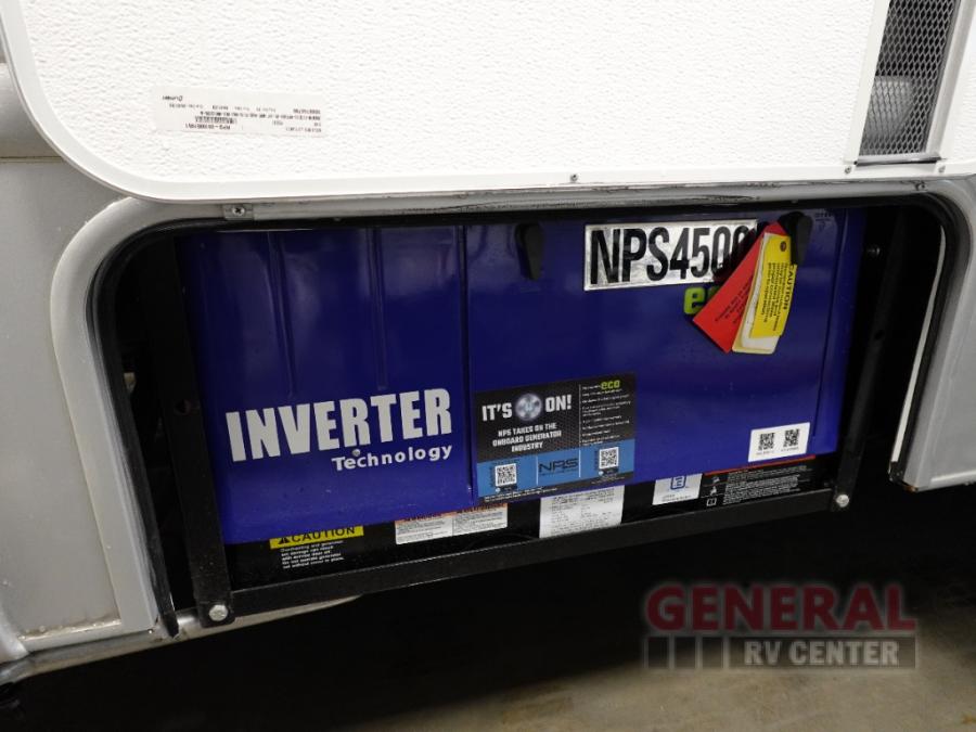 Enjoy this compact yet feature-packed floorplan! The dinette converts to a 60" x 74" bed for a good night's rest. The rear corner bath has a 24" x 32" shower so you can clean up privately, and there's a medicine cabinet to store your toiletries. The kitchen is fully equipped with a three-burner range, microwave, and 12 volt refrigerator, perfect for cooking on the go. There's plenty of storage space including a pantry in the kitchen and a wardrobe closet right next to the entry. Everyone will have a great view of the cab over entertainment center with 40" LED TV. You'll love the NPS 4500 generator when you decide to stop off-grid, the LP quick disconnect, and the 7,500 lb. hitch.